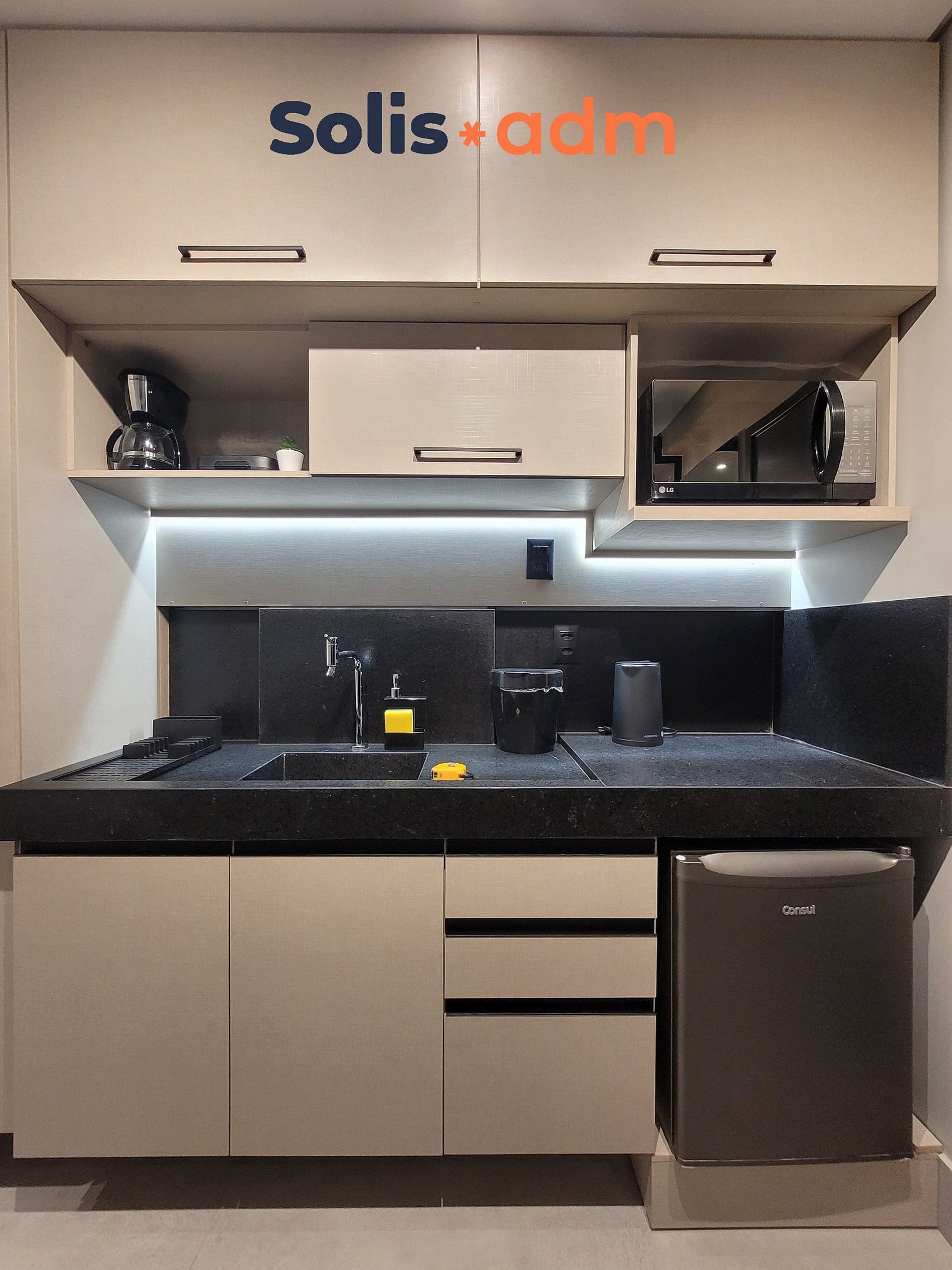 A cozinha é equipada com frigobar, sanduicheira, liquidificador, cafeteira, microondas e utensílios essenciais para preparar refeições rápidas com toda a comodidade. A acomodação conta com uma cama Casal com cama AUXILIAR solteiro, para acomodar mais um adulto ou criança. Além disso, oferece Smart TV, ar condicionado, armário para roupas e banheiro.