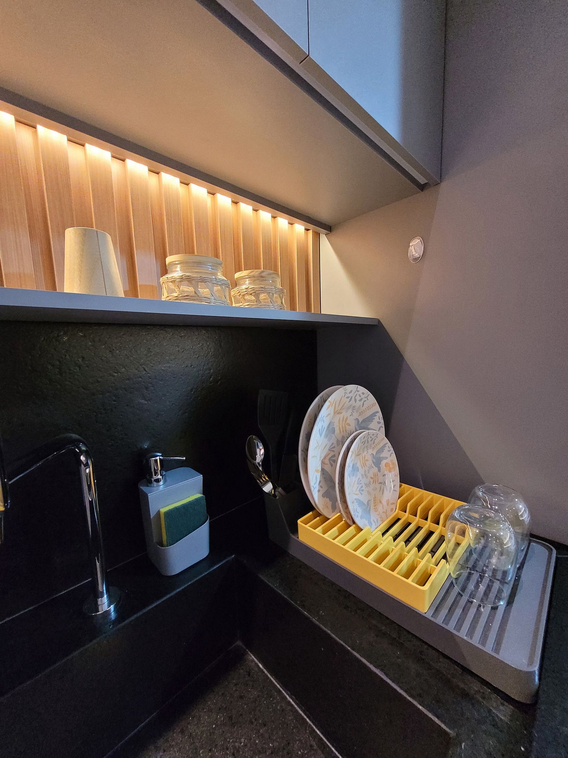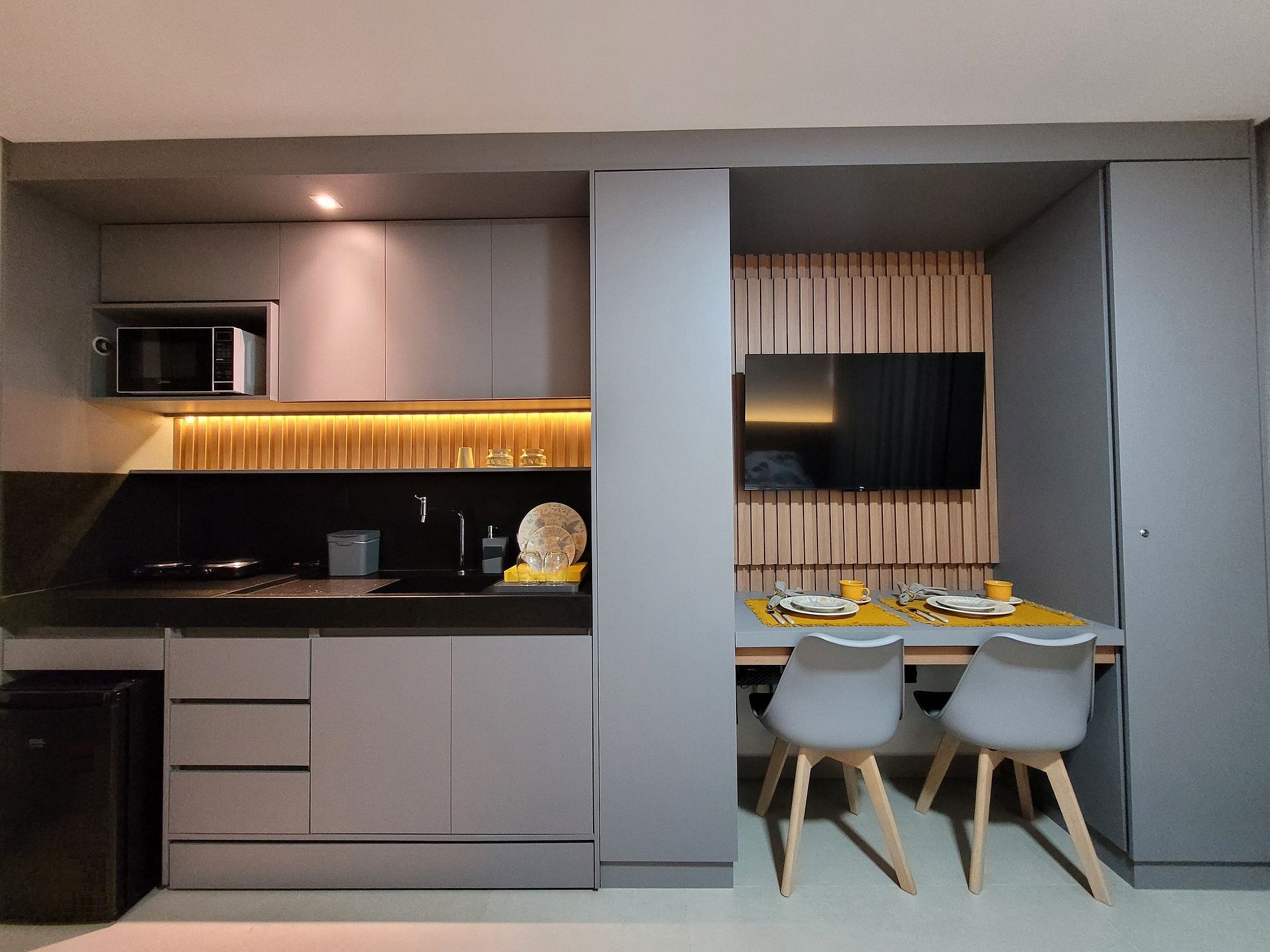 A cozinha é prática e bem equipada, permitindo preparar refeições rápidas com facilidade no dia a dia, sem abrir mão do conforto.