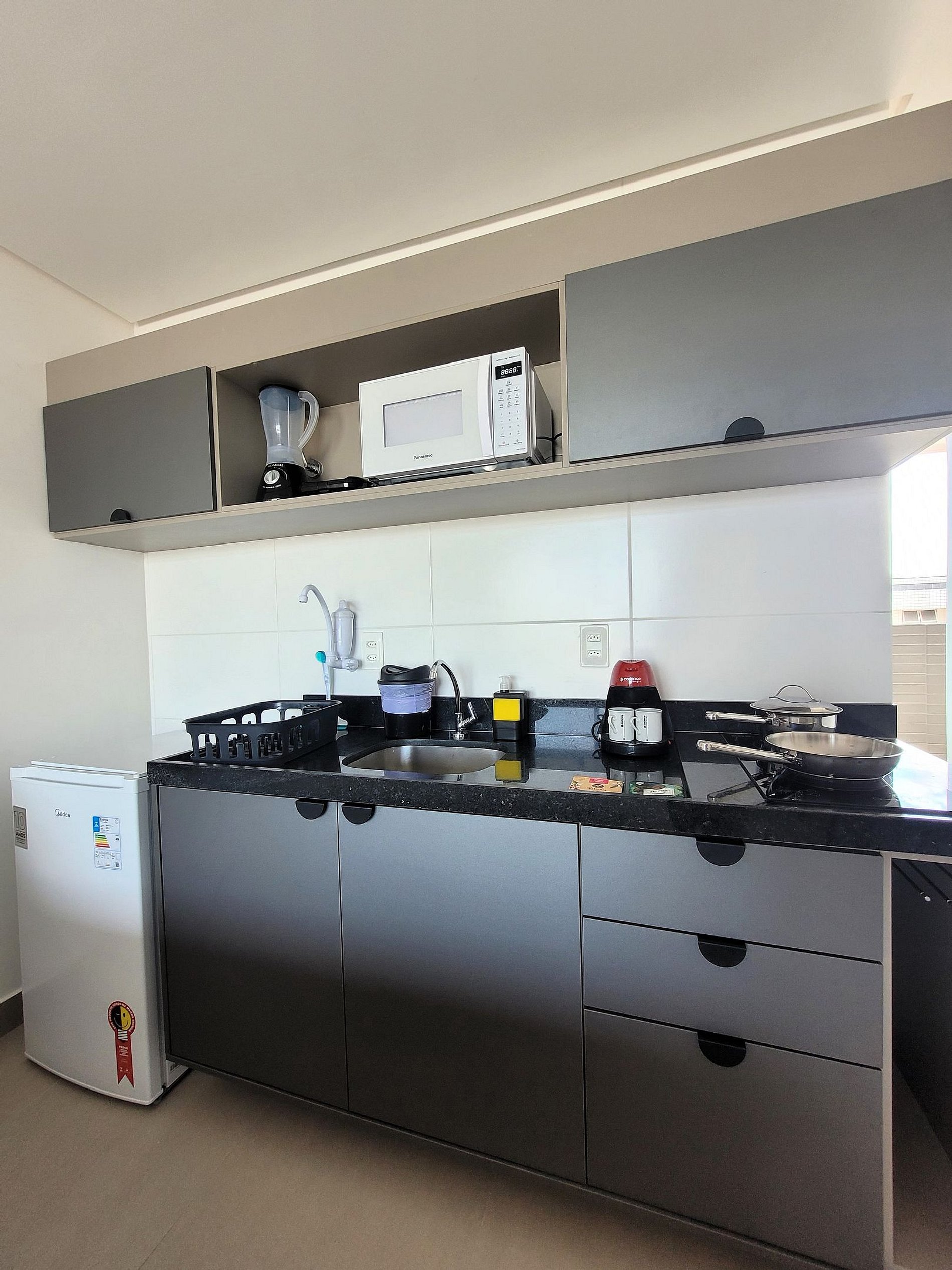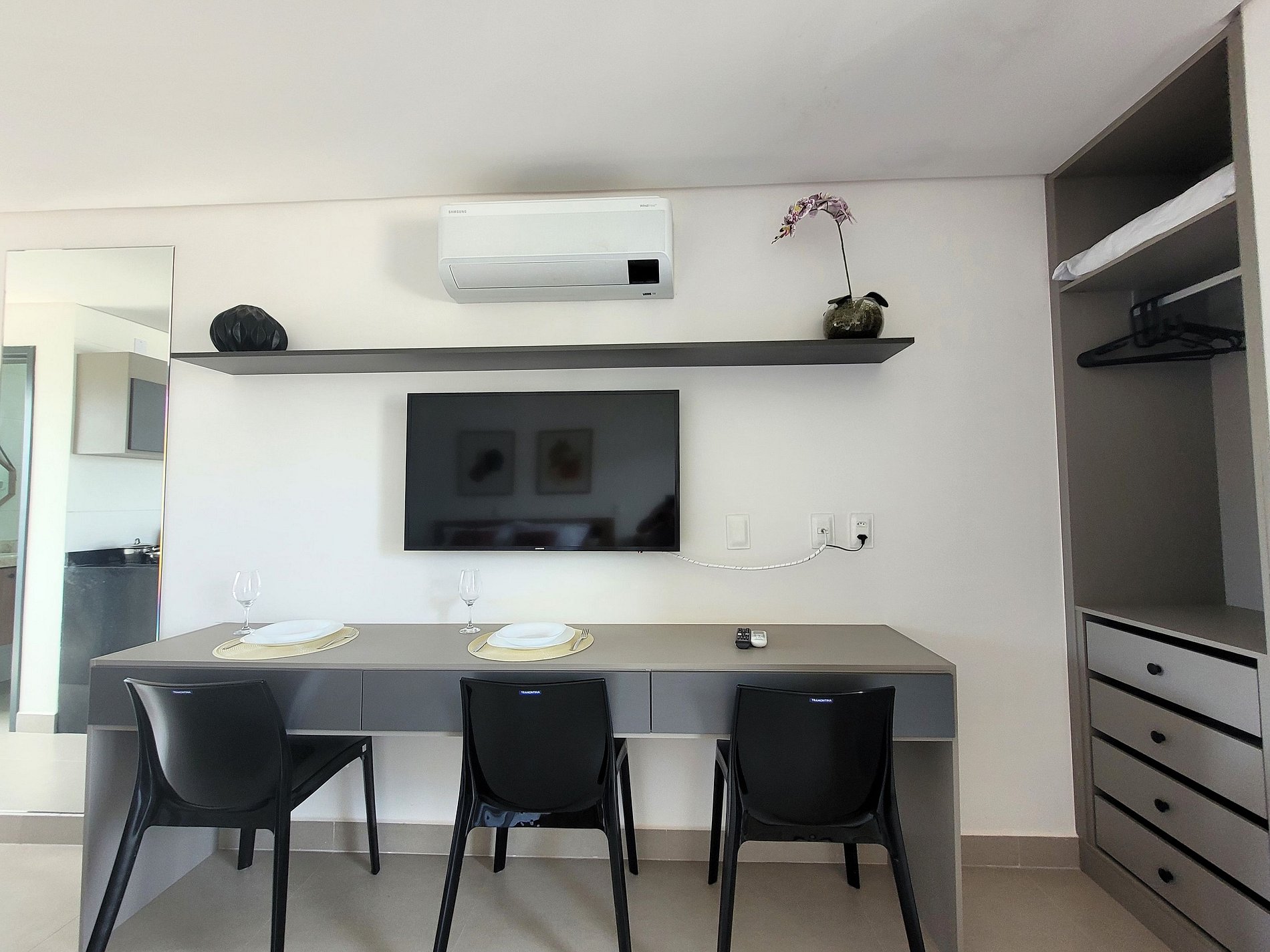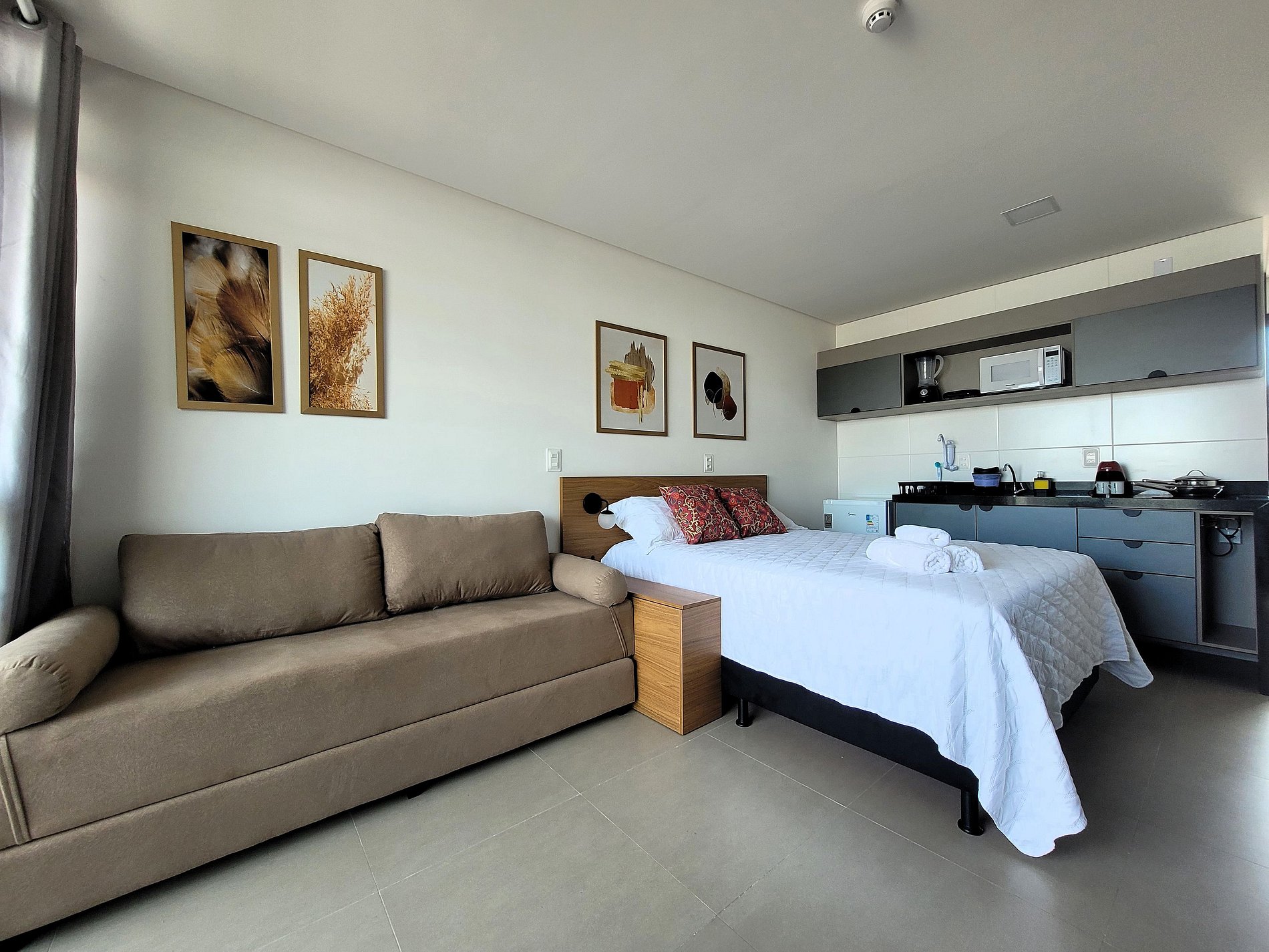 A cozinha inclui frigobar, liquidificador, sanduicheira, cafeteira e fogão cooktop, com panelas inox e utensílios para preparar suas refeições com toda comodidade. Caso necessite trabalhar, temos um espaço de trabalho com internet Wi-Fi. Possui cama casal e sofá cama, TV, Ar-condicionado, guarda-roupa e banheiro com box e ducha quente. Este apartamento está totalmente equipado para hospedagem de curta ou longa duração, proporcionando uma estadia completa e sem preocupações.
