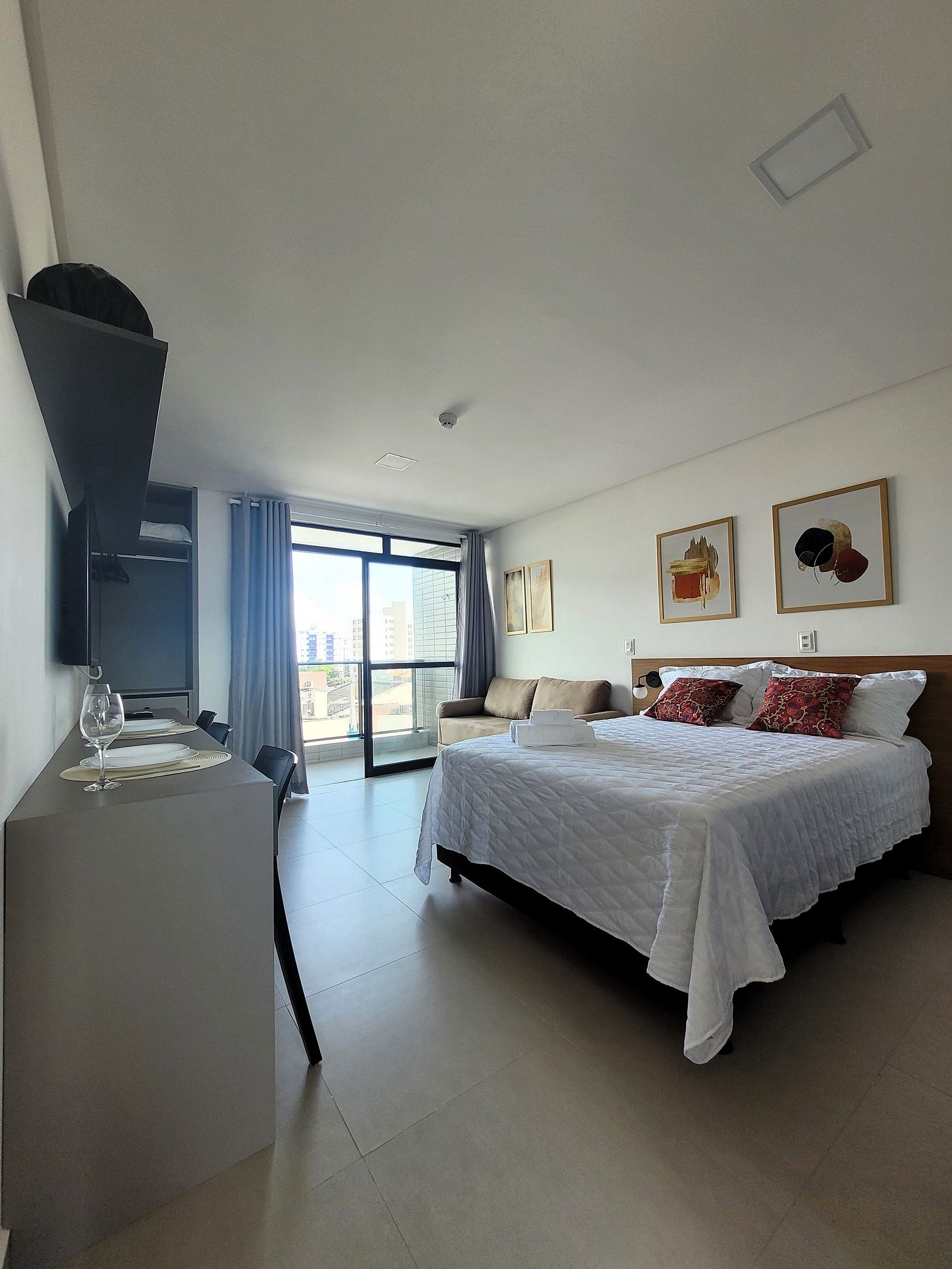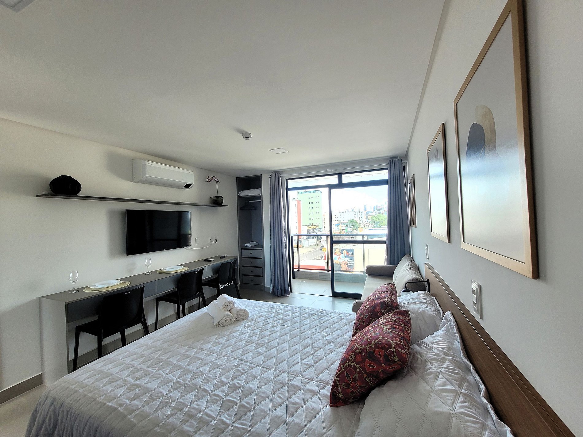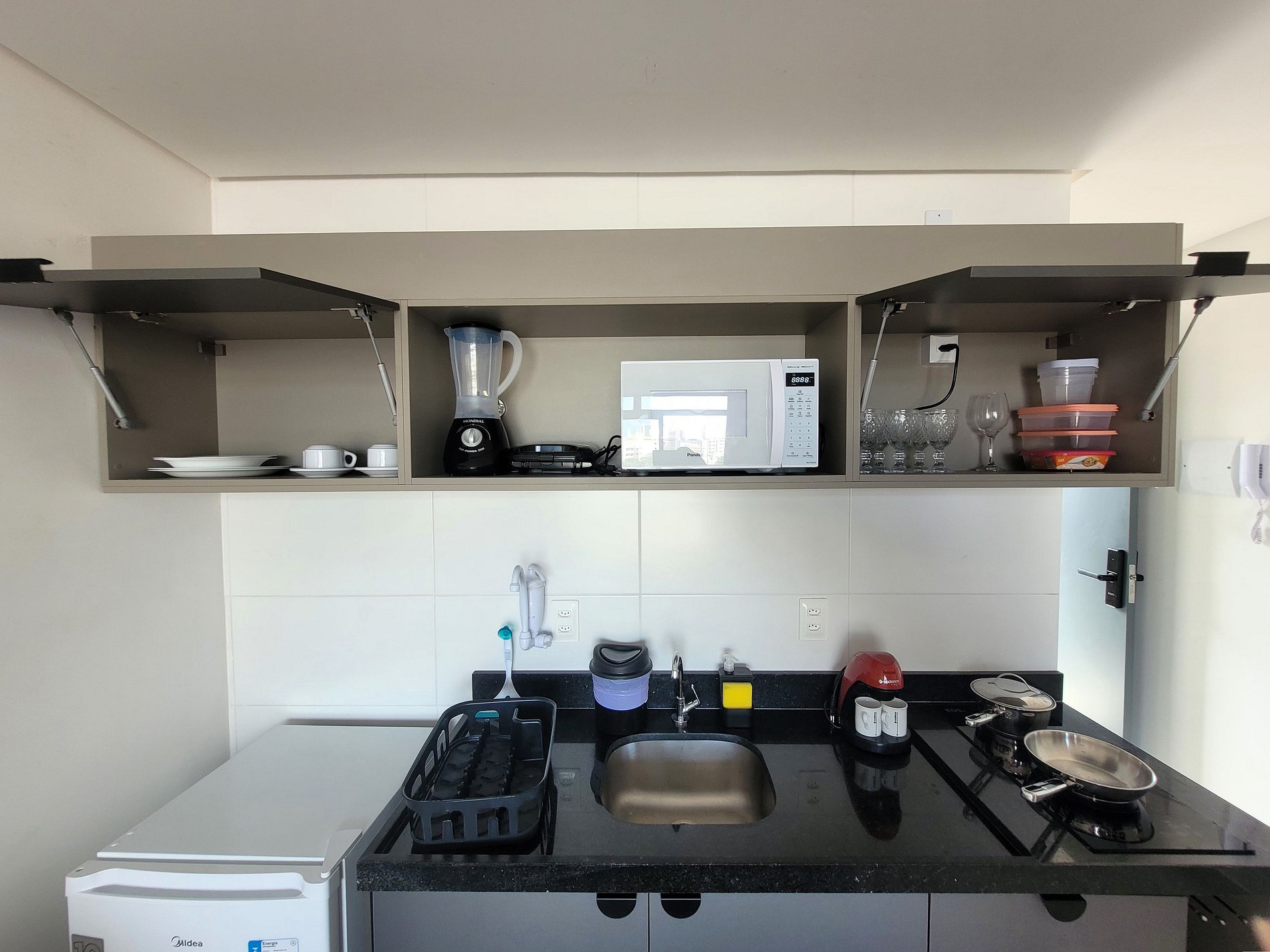 A cozinha inclui frigobar, liquidificador, sanduicheira, cafeteira e fogão cooktop, com panelas inox e utensílios para preparar suas refeições com toda comodidade. Caso necessite trabalhar, temos um espaço de trabalho com internet Wi-Fi. Possui cama casal e sofá cama, TV, Ar-condicionado, guarda-roupa e banheiro com box e ducha quente. Este apartamento está totalmente equipado para hospedagem de curta ou longa duração, proporcionando uma estadia completa e sem preocupações.