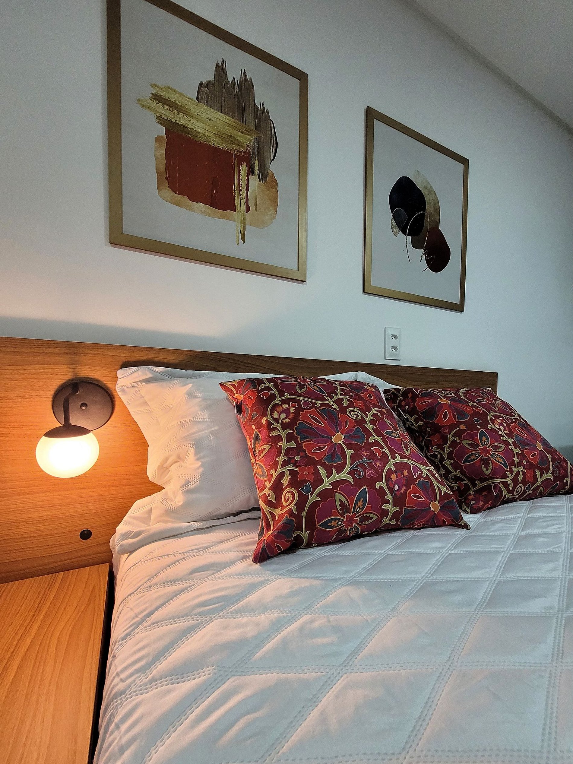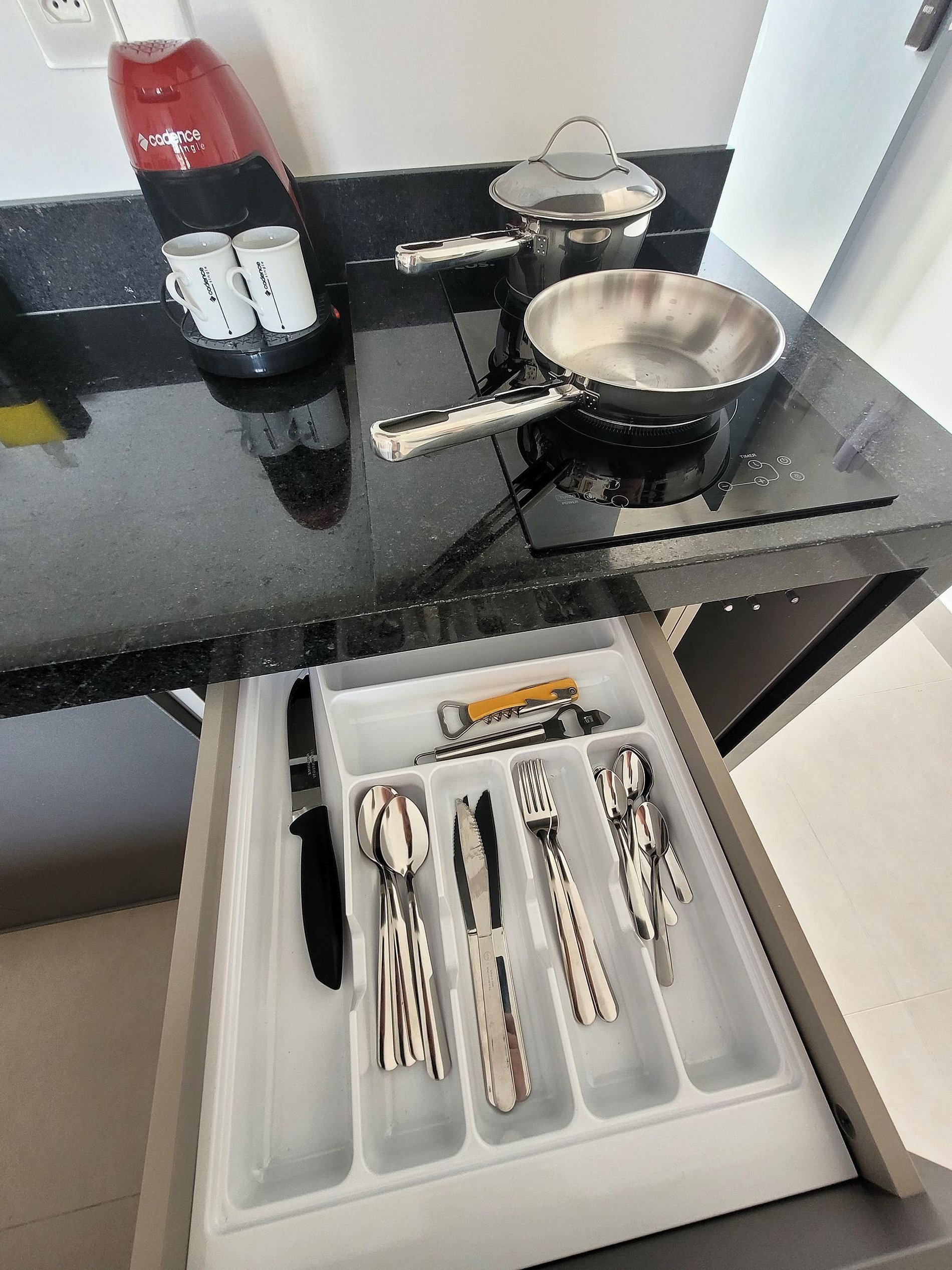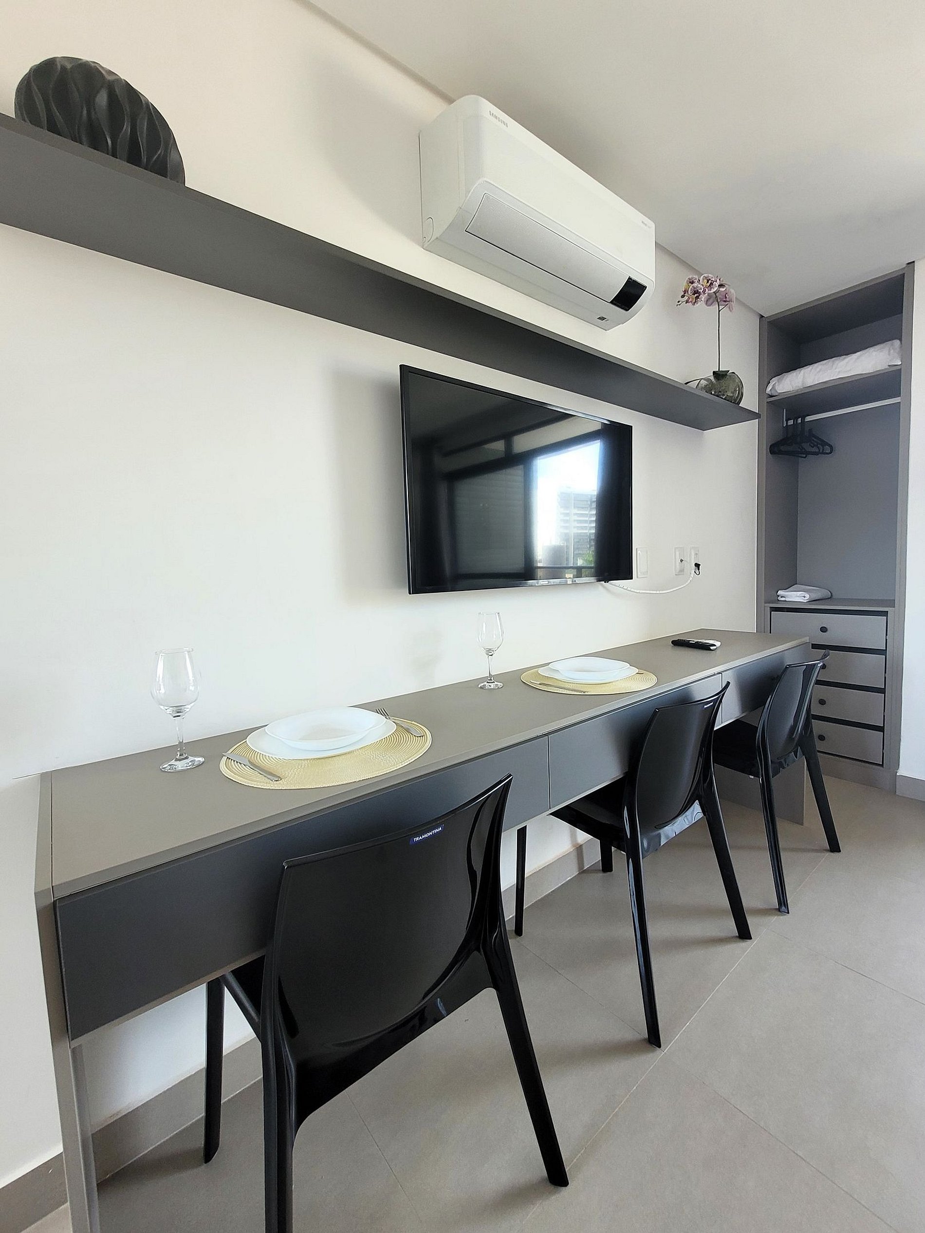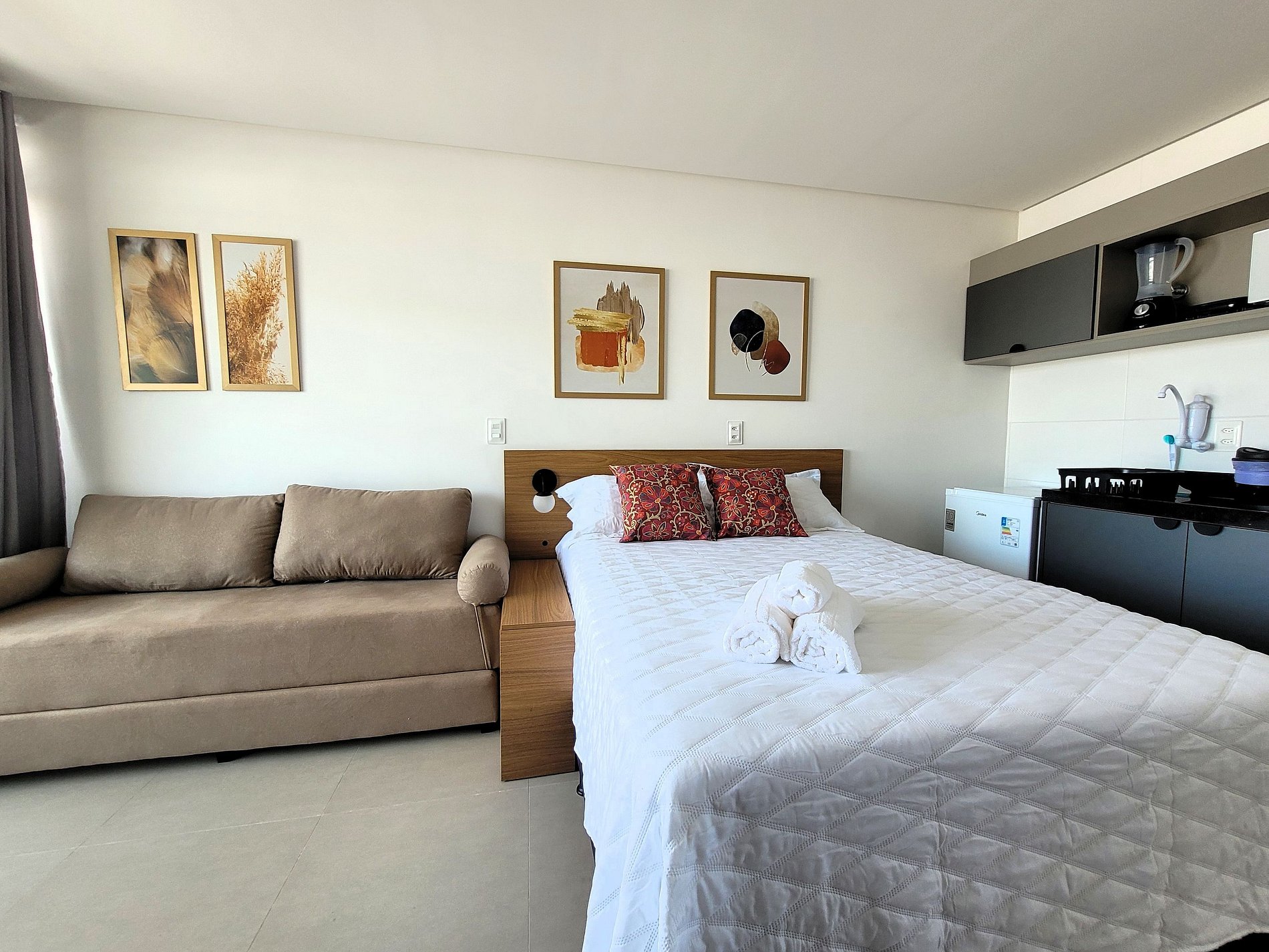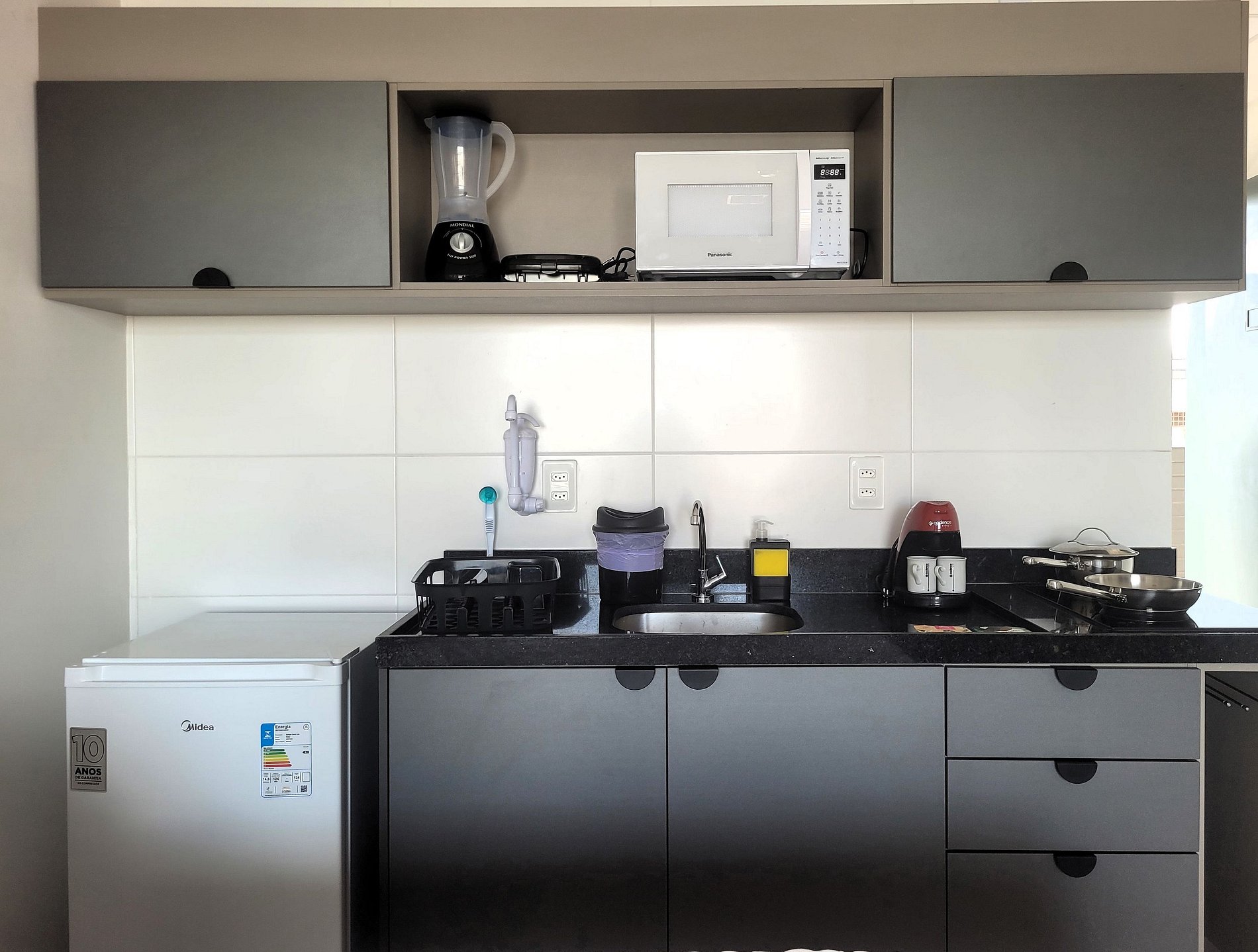 A cozinha inclui frigobar, liquidificador, sanduicheira, cafeteira e fogão cooktop, com panelas inox e utensílios para preparar suas refeições com toda comodidade. Caso necessite trabalhar, temos um espaço de trabalho com internet Wi-Fi. Possui cama casal e sofá cama, TV, Ar-condicionado, guarda-roupa e banheiro com box e ducha quente. Este apartamento está totalmente equipado para hospedagem de curta ou longa duração, proporcionando uma estadia completa e sem preocupações.