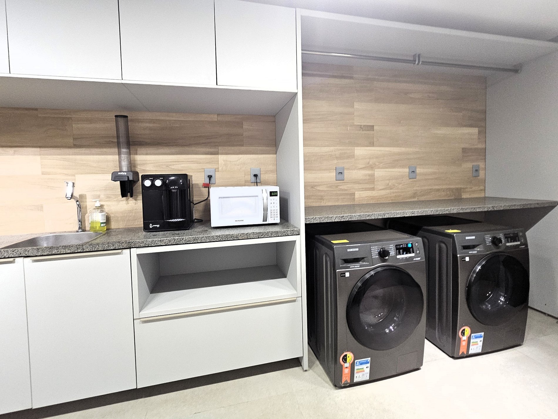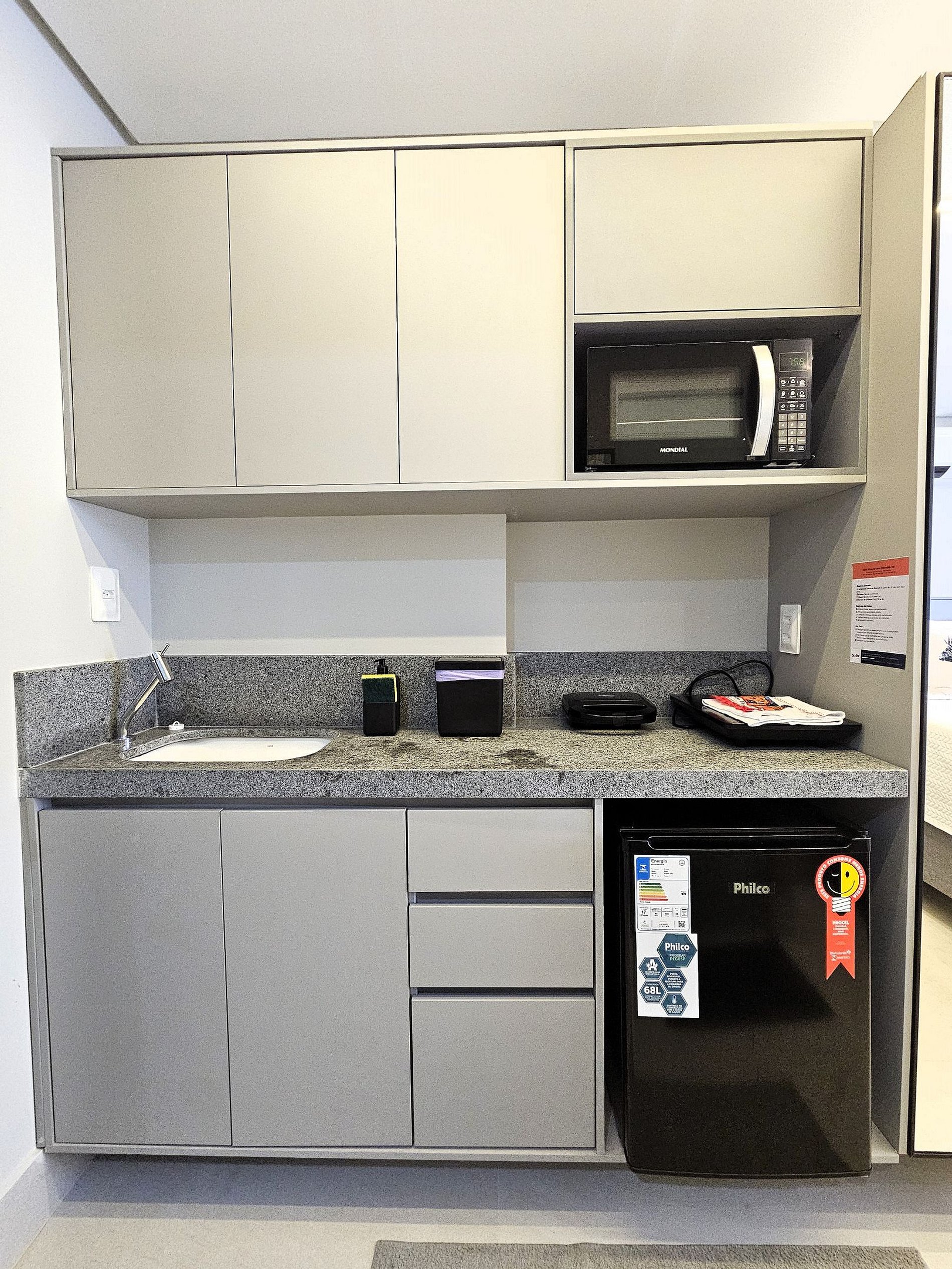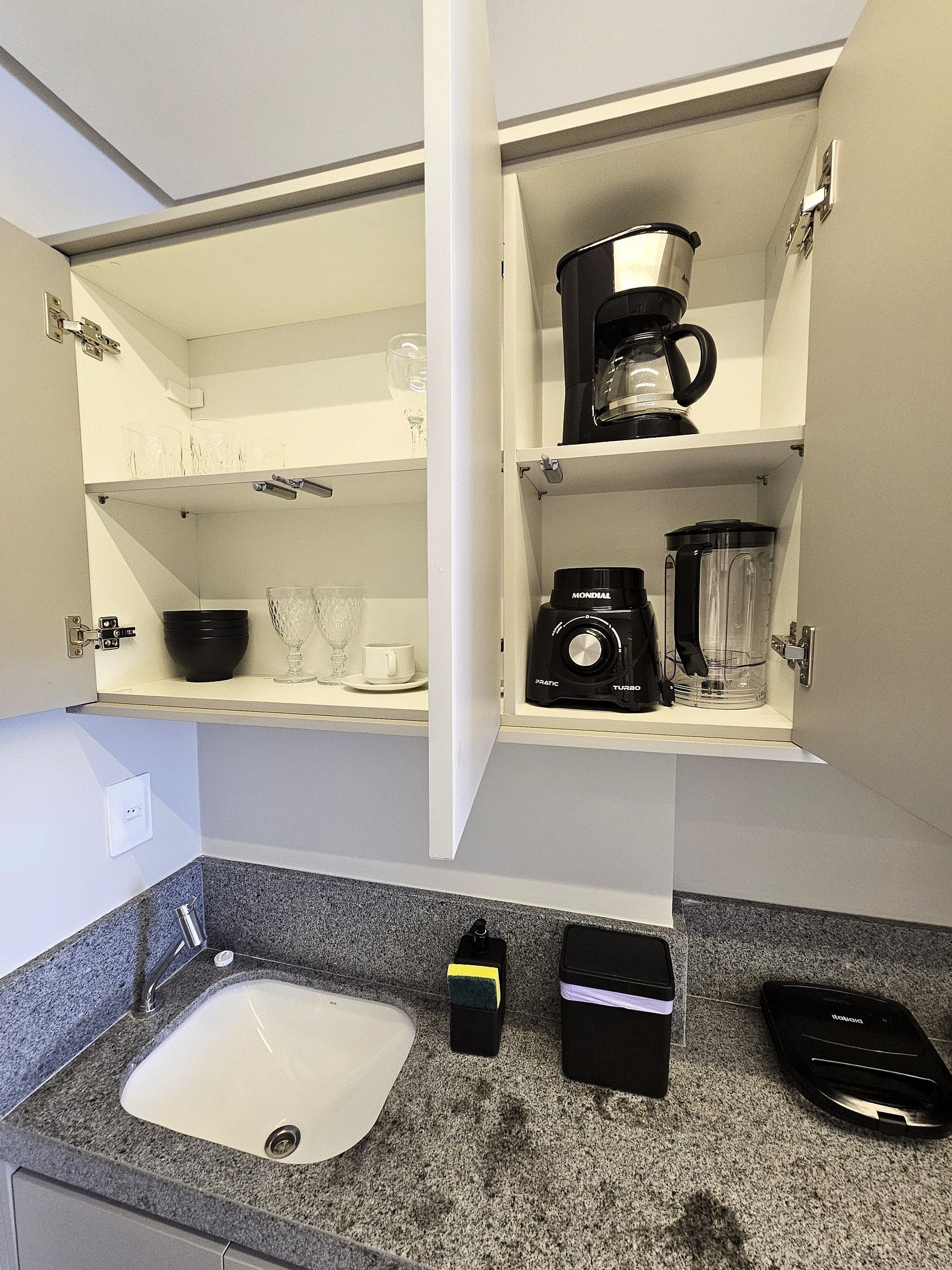 A cozinha é equipada com frigobar, liquidificador, sanduicheira, cafeteira, fogão eletrico de indução e utensílios essenciais para preparar refeições rápidas com toda a comodidade.