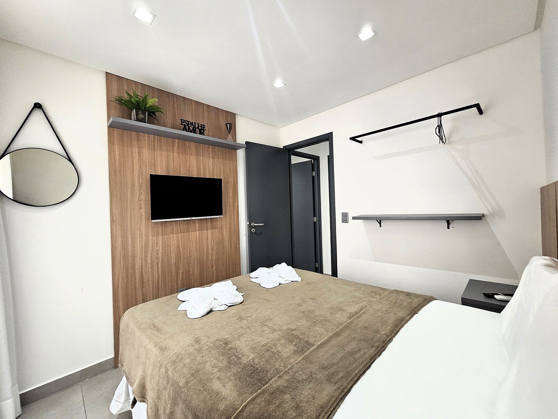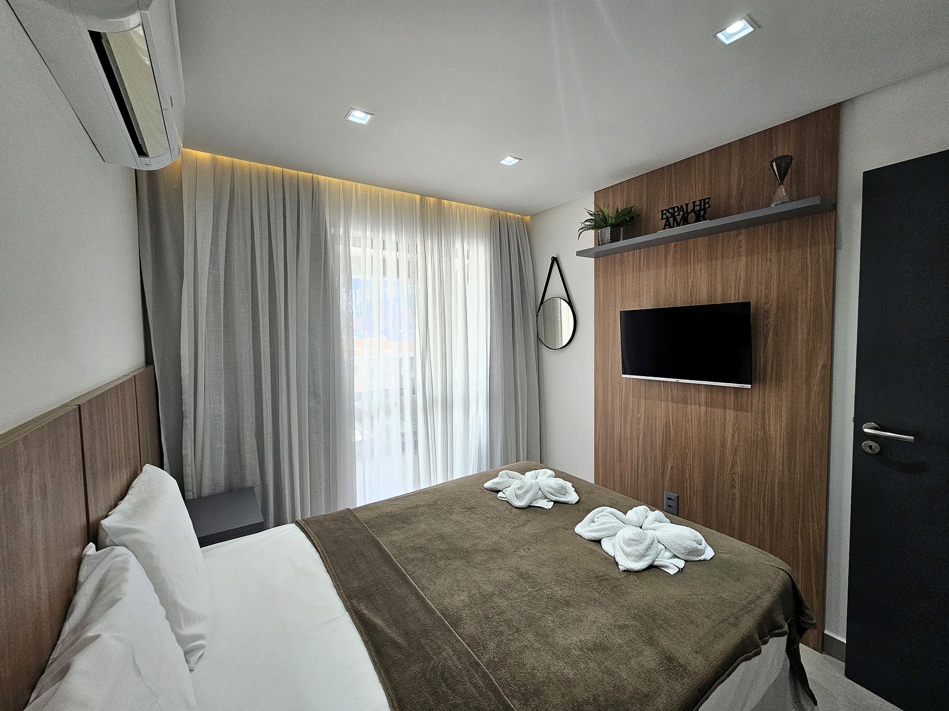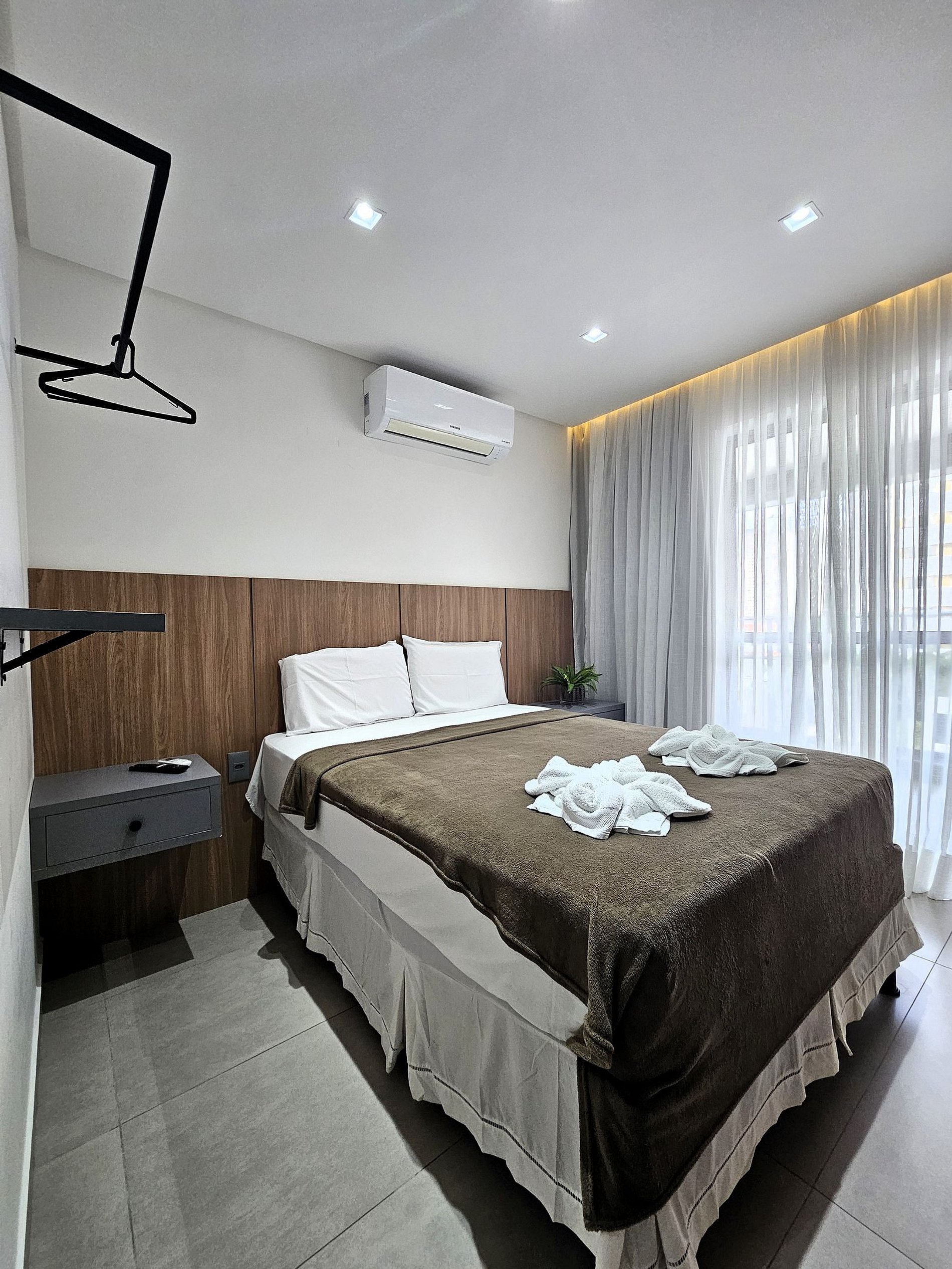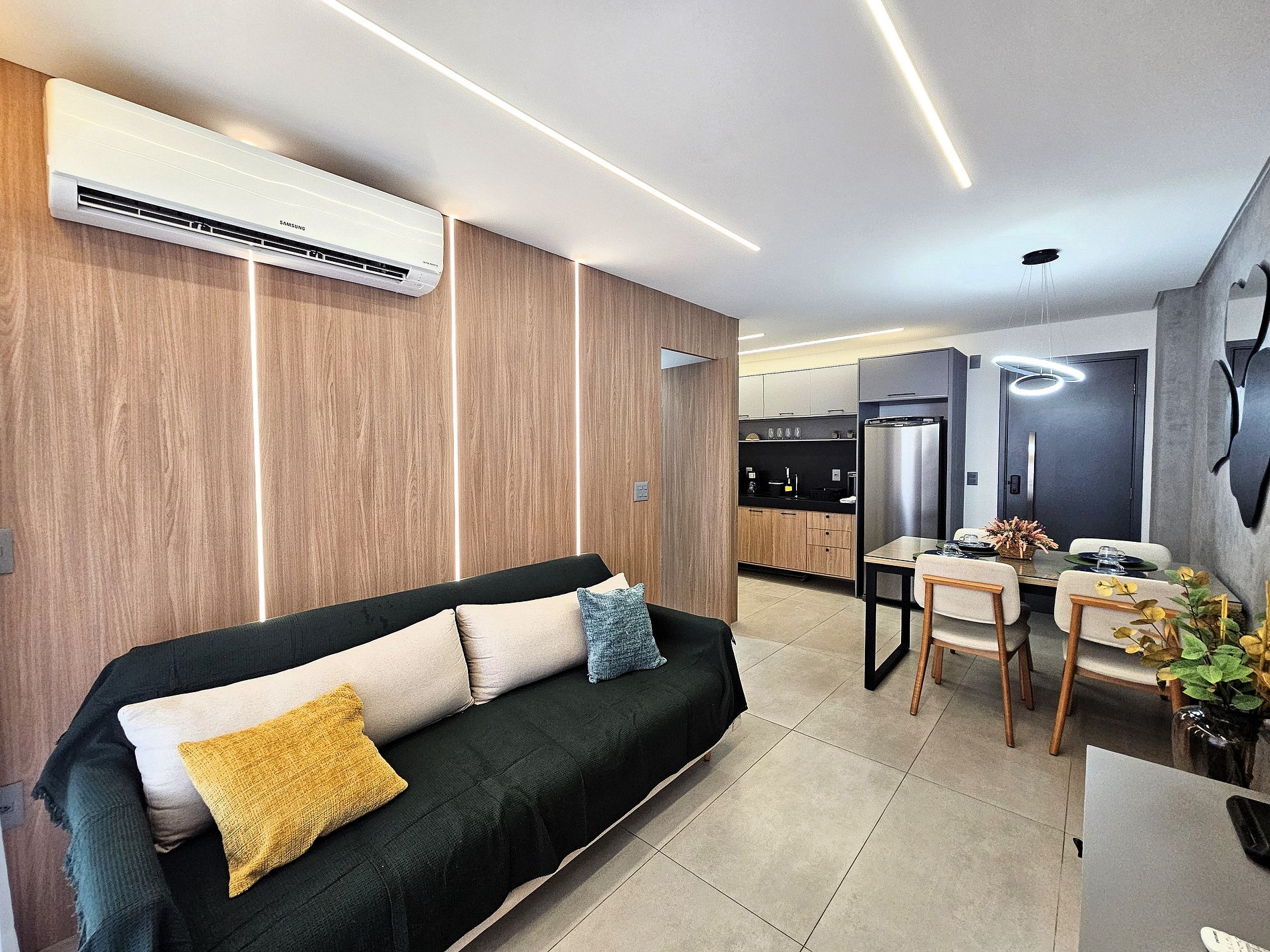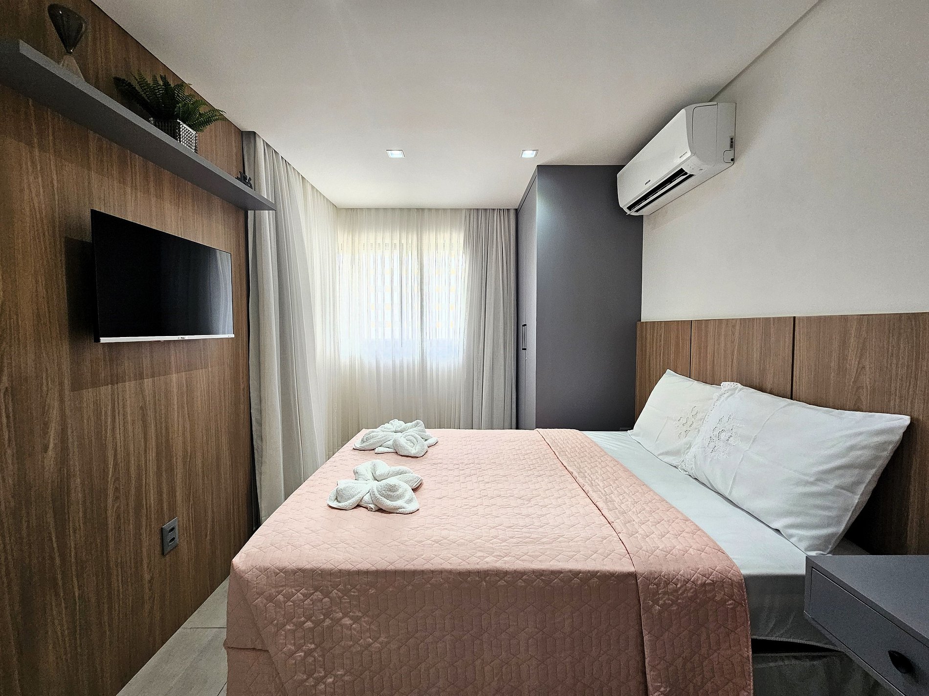 São 2 quartos, sendo uma suíte, sala com sofá cama, todos ambientes com ar condicionado. Cozinha completa e piscina na cobertura. Próximo a academia, padaria, supermercado, conveniência e posto de gasolina. Você terá tudo ao seu alcance.