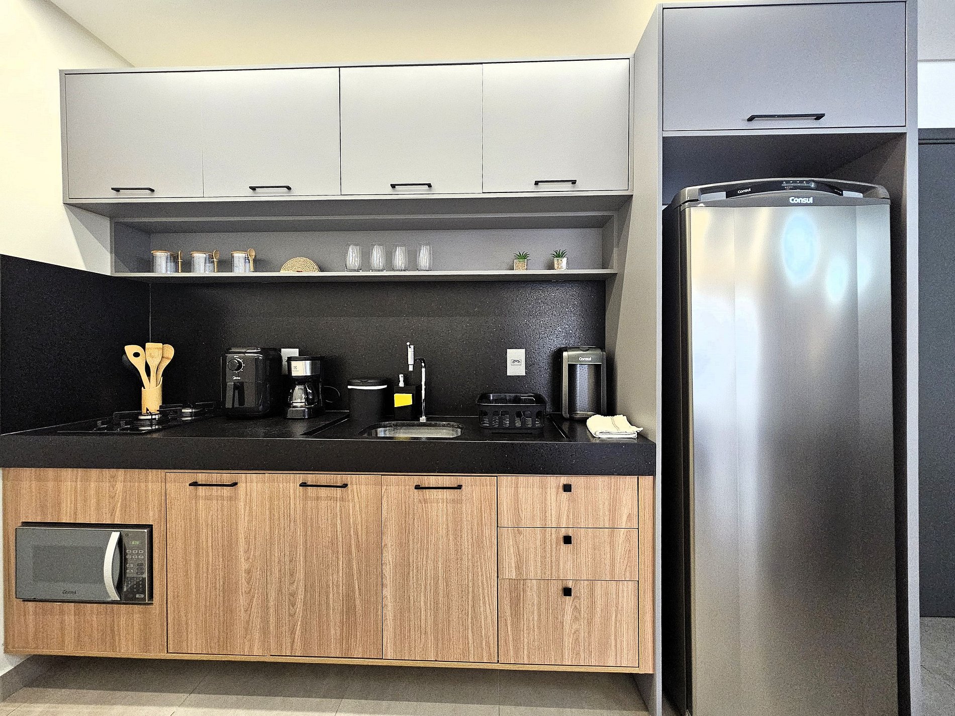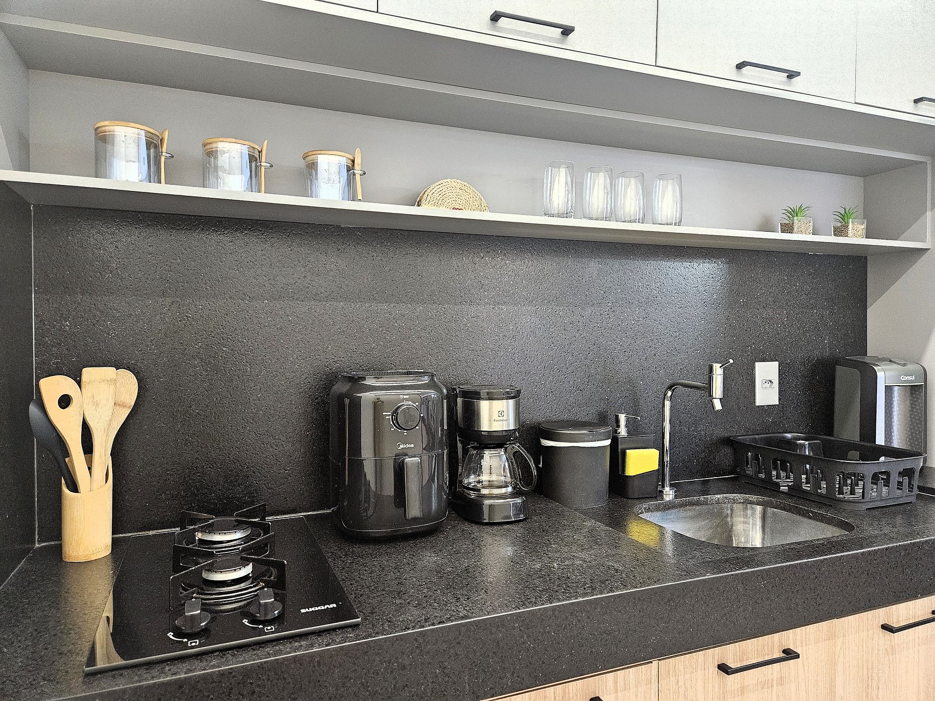 A cozinha é equipada com geladeira, liquidificador, sanduicheira, cafeteira, fogão a gás e utensílios essenciais para preparar refeições rápidas com toda a comodidade.