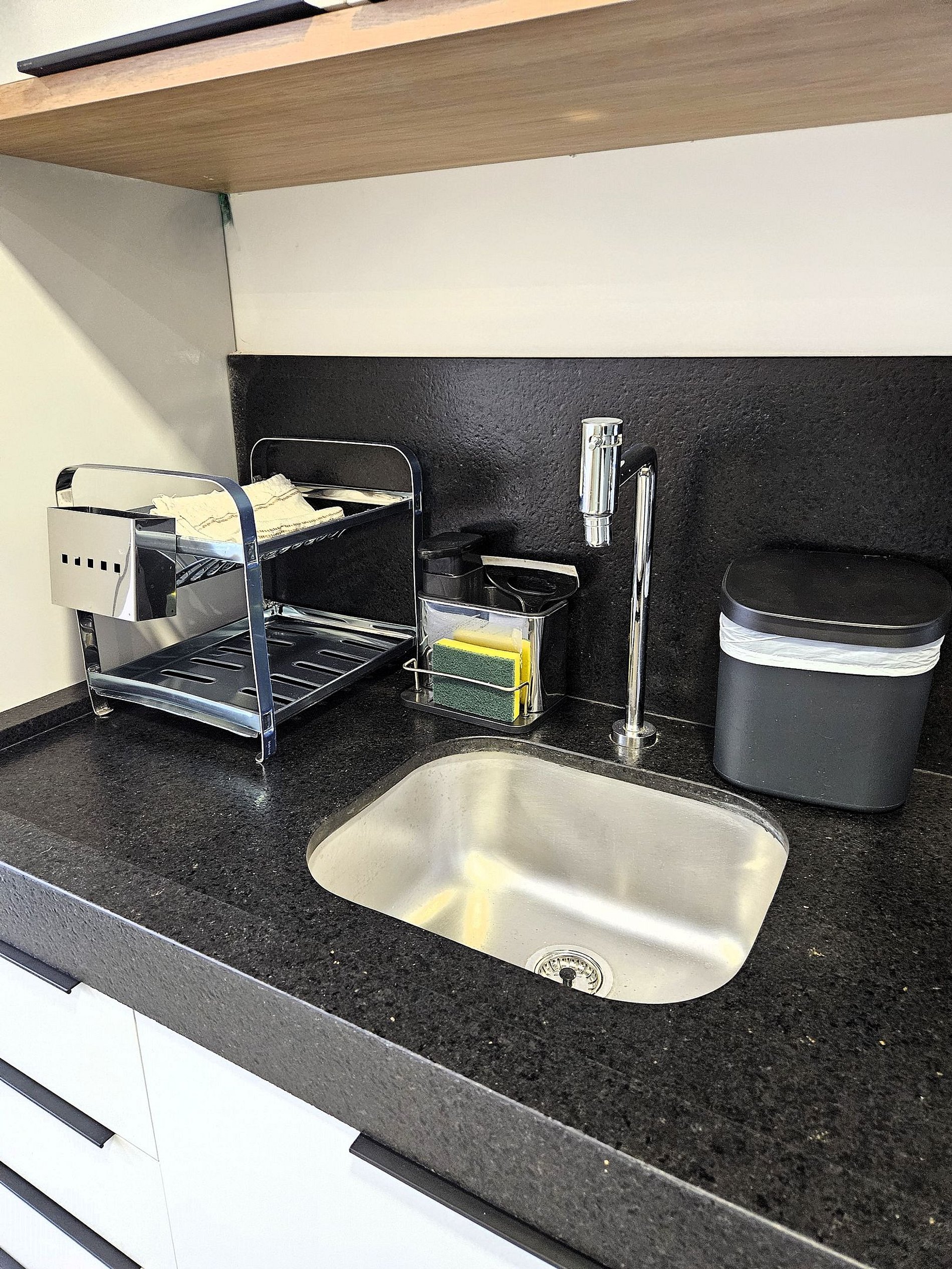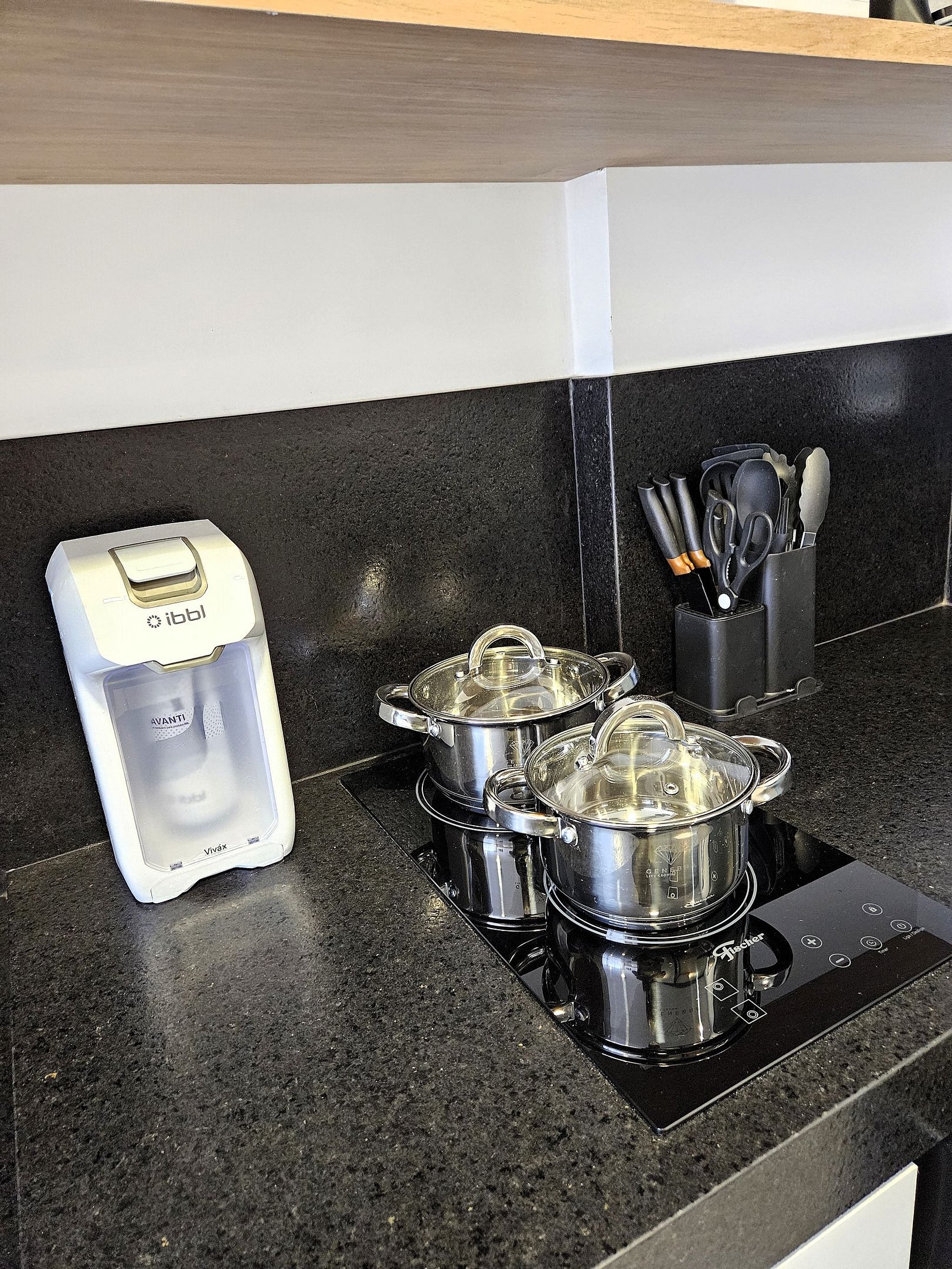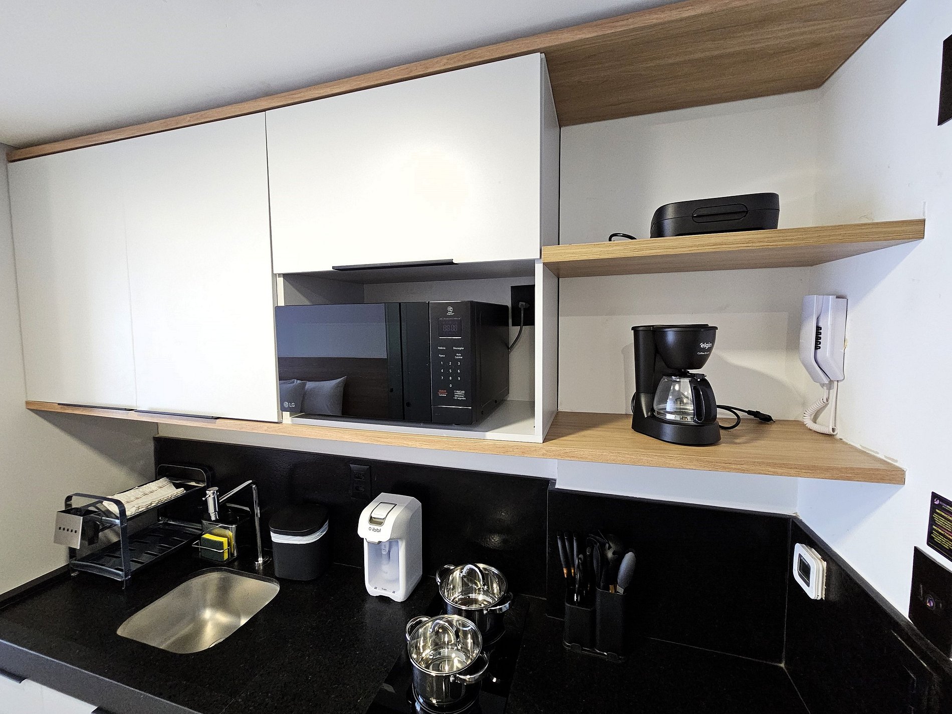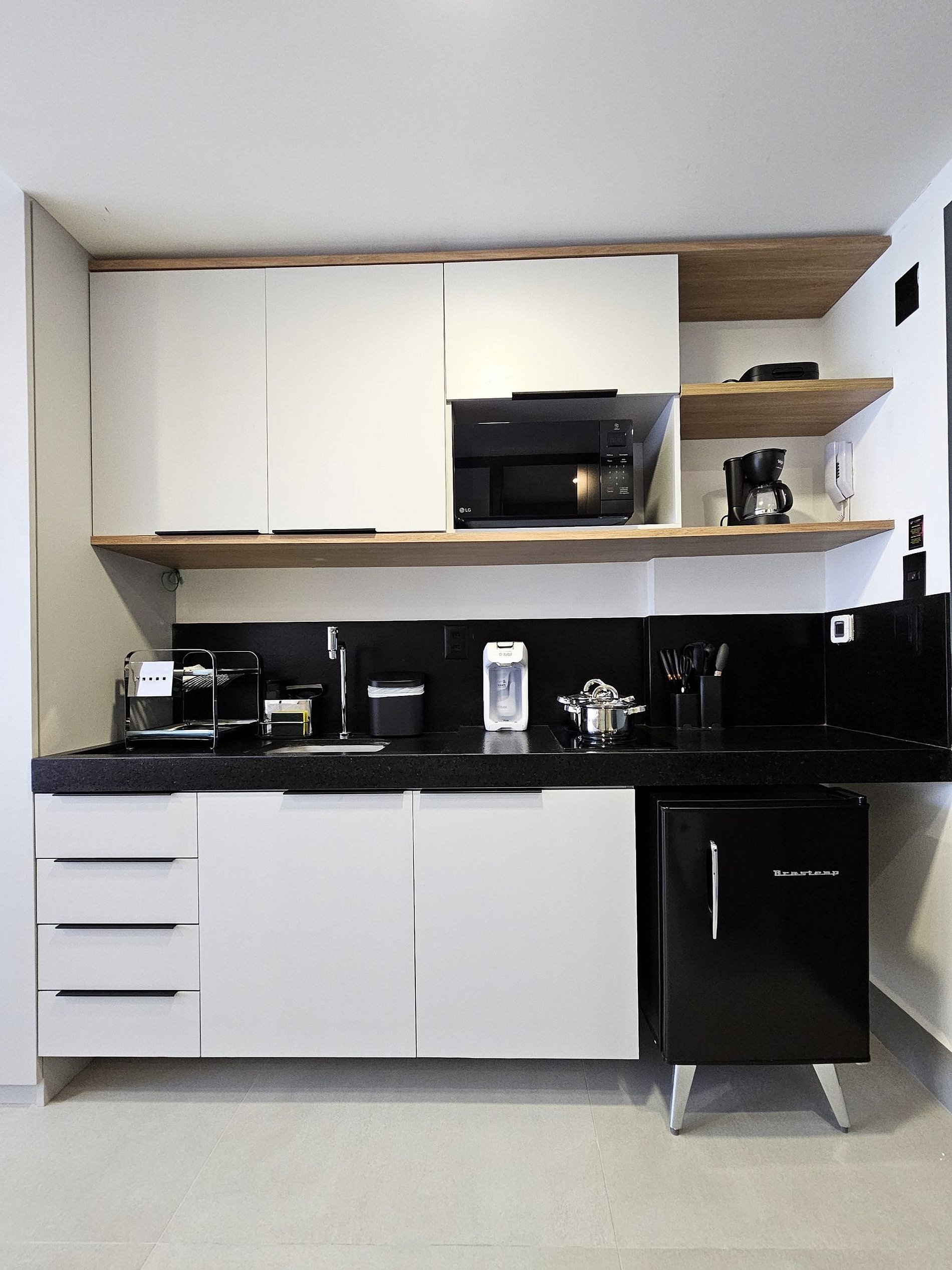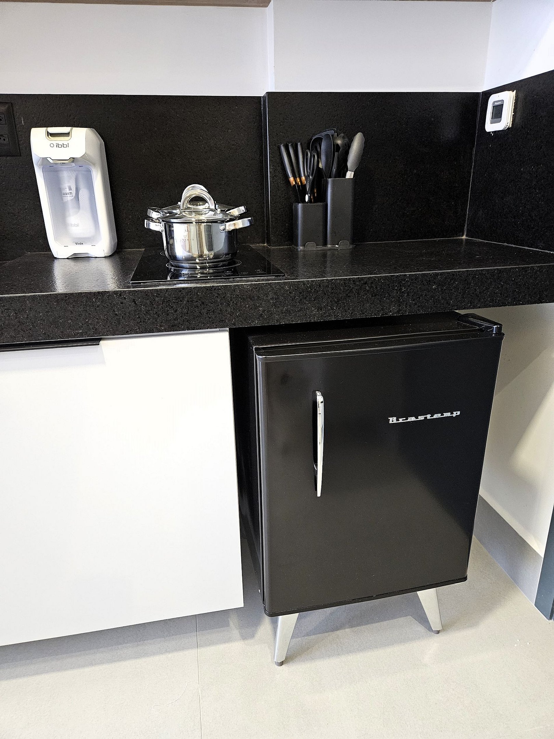A cozinha inclui frigobar, microondas, cooktop de indução, sanduicheira, cafeteira, filtro de água e utensílios para preparar refeições rápidas com toda comodidade.