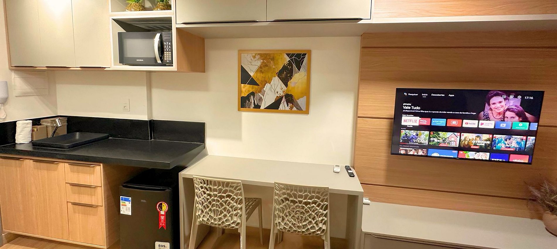 Prepare suas refeições com toda comodidade usando frigobar, micro-ondas, cooktop de indução, sanduicheira, cafeteira e utensílios completos para refeições rápidas.