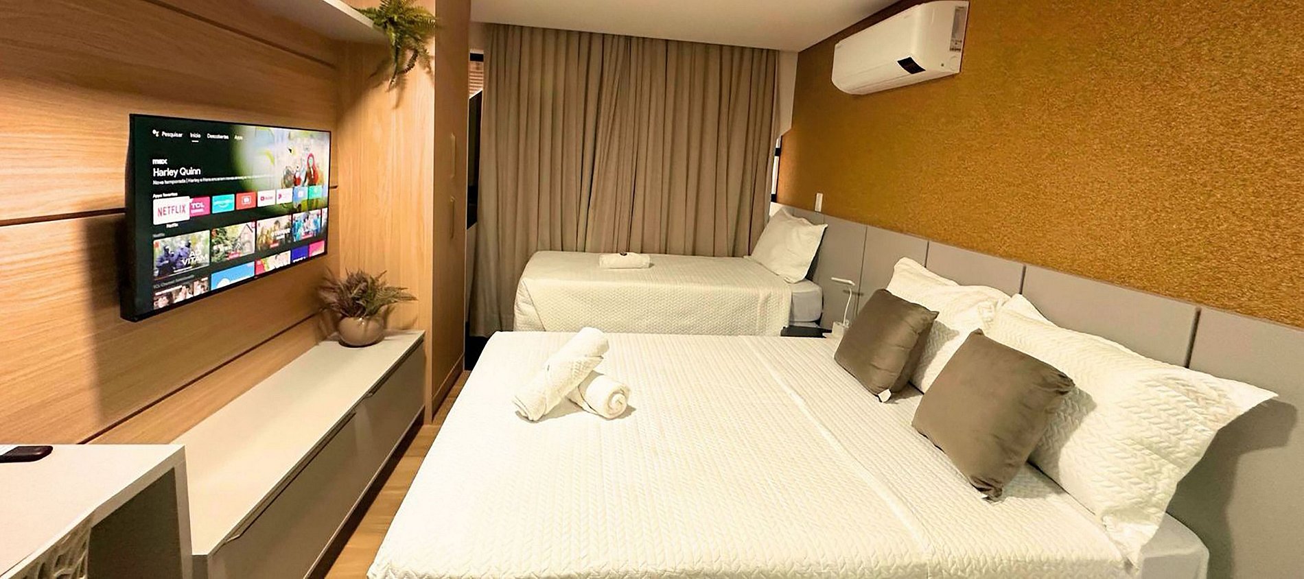 Relaxe em uma cama Queen, aproveite a cama de solteiro ou a cama auxiliar — ideal para até 4 pessoas (2 adultos e 2 crianças). O flat conta ainda com Smart TV 43", ar-condicionado, armário para roupas e banheiro privativo, garantindo conforto e praticidade e espaço para trabalho.
