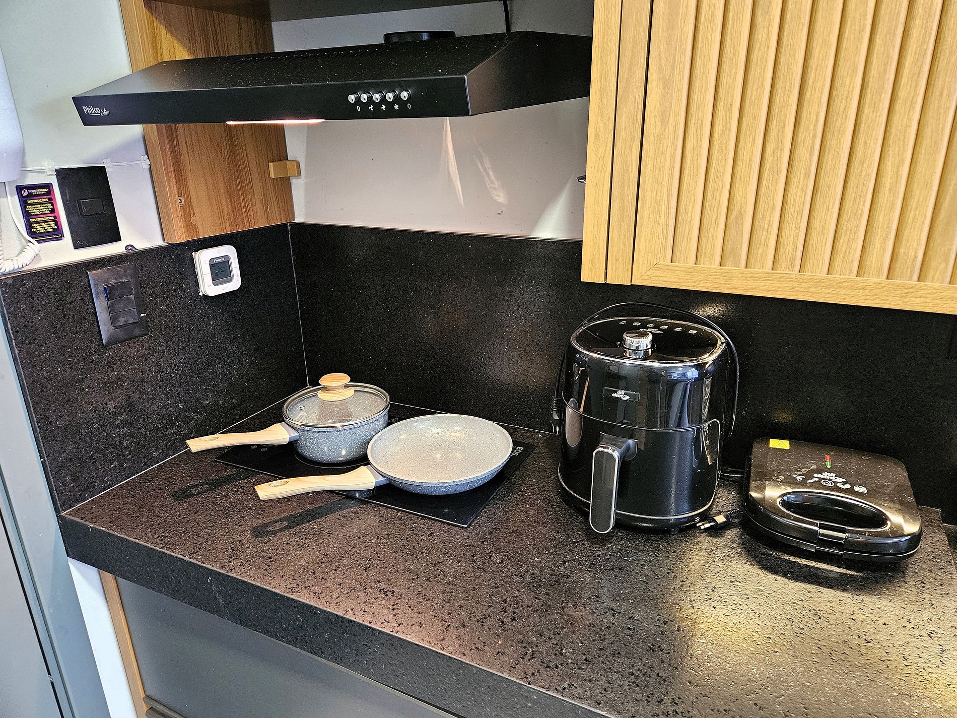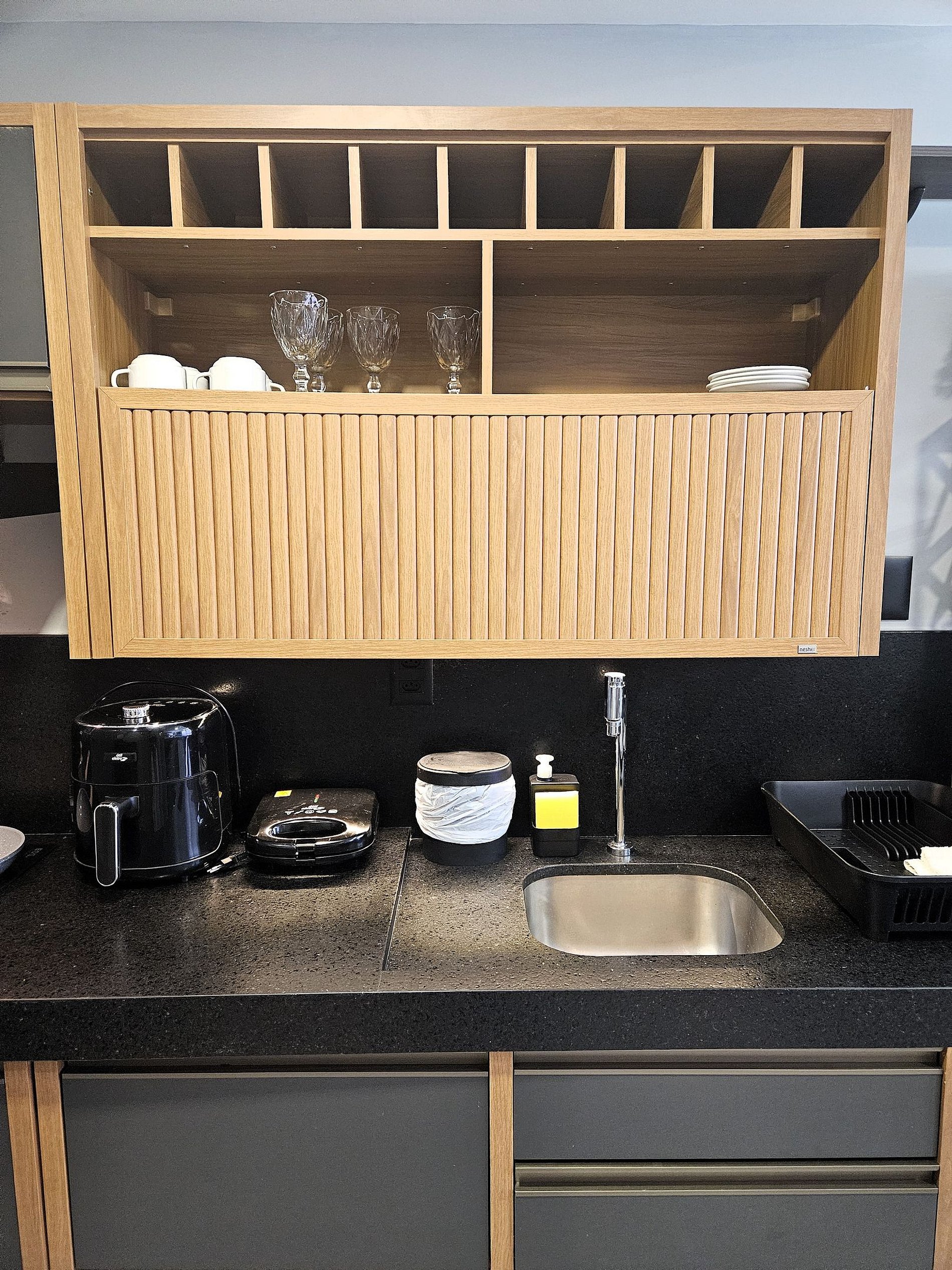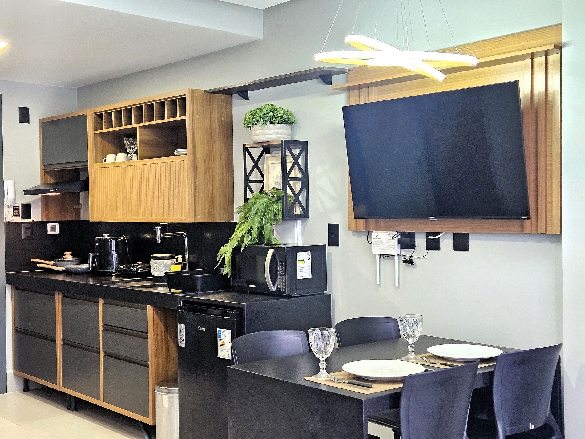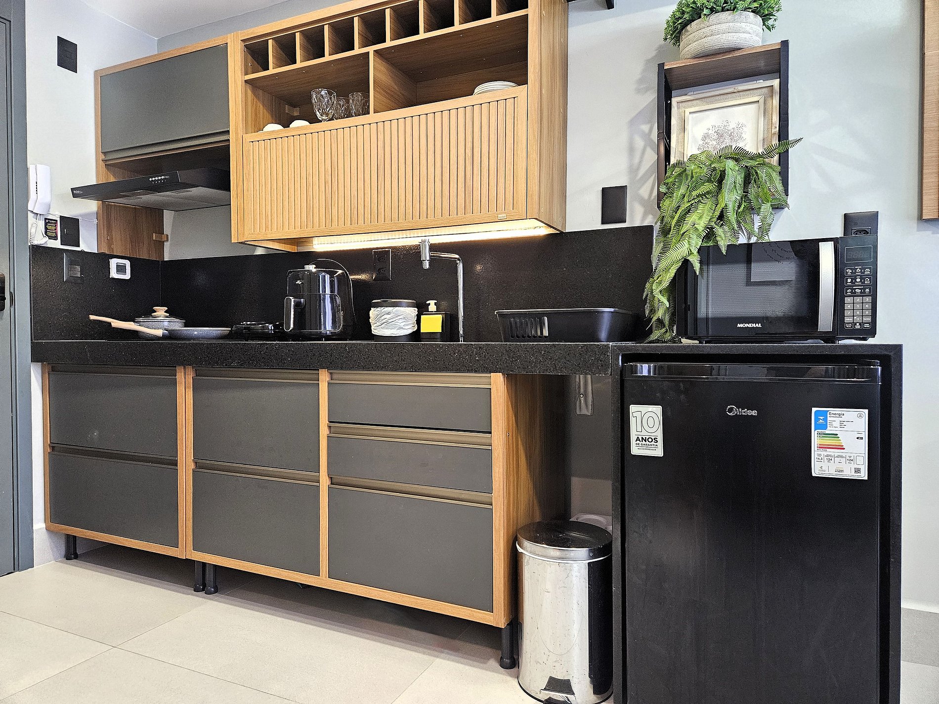 A cozinha inclui frigobar, microondas, cooktop de indução, sanduicheira, cafeteira, filtro de água e utensílios para preparar refeições rápidas com toda comodidade.
