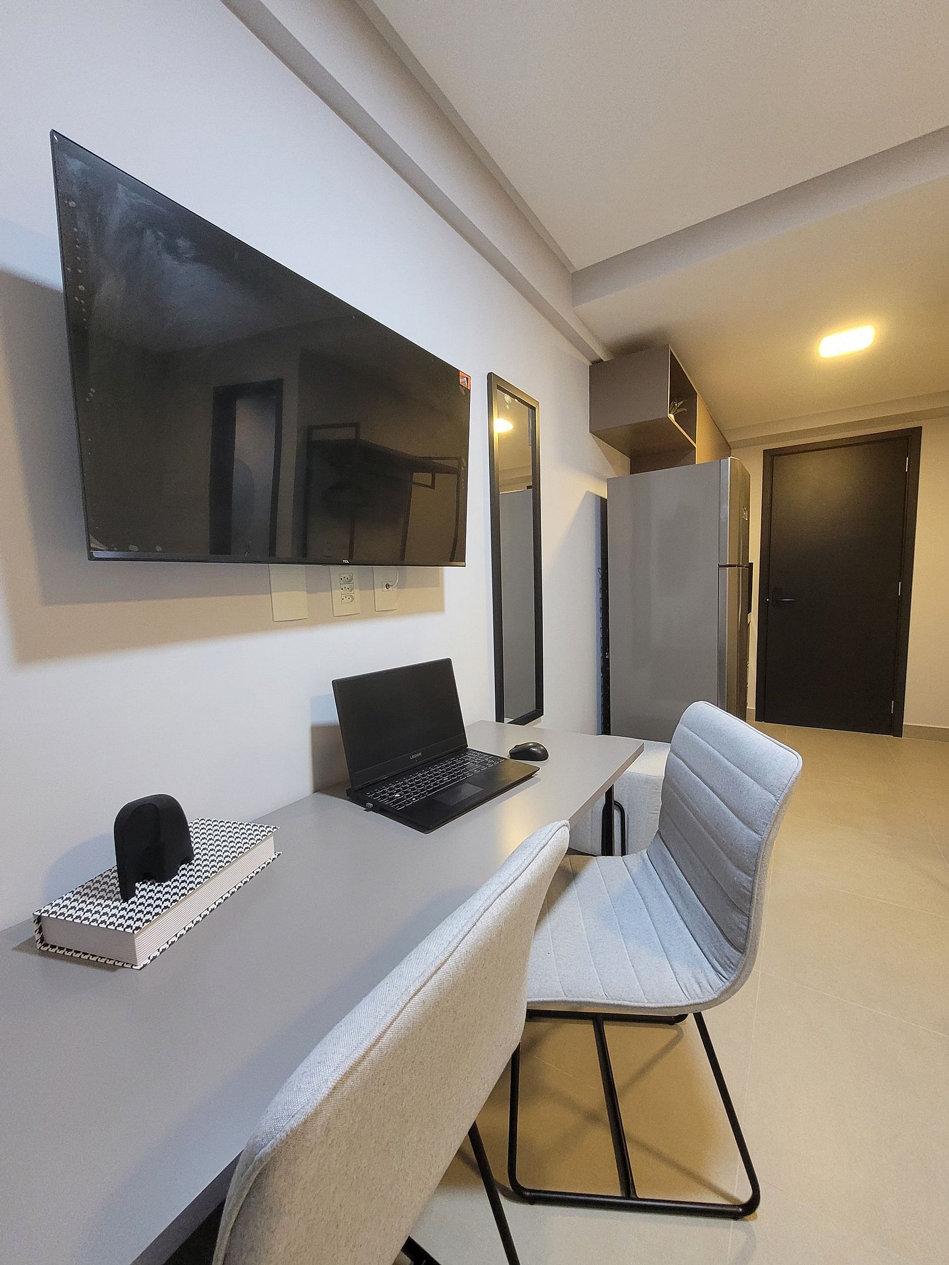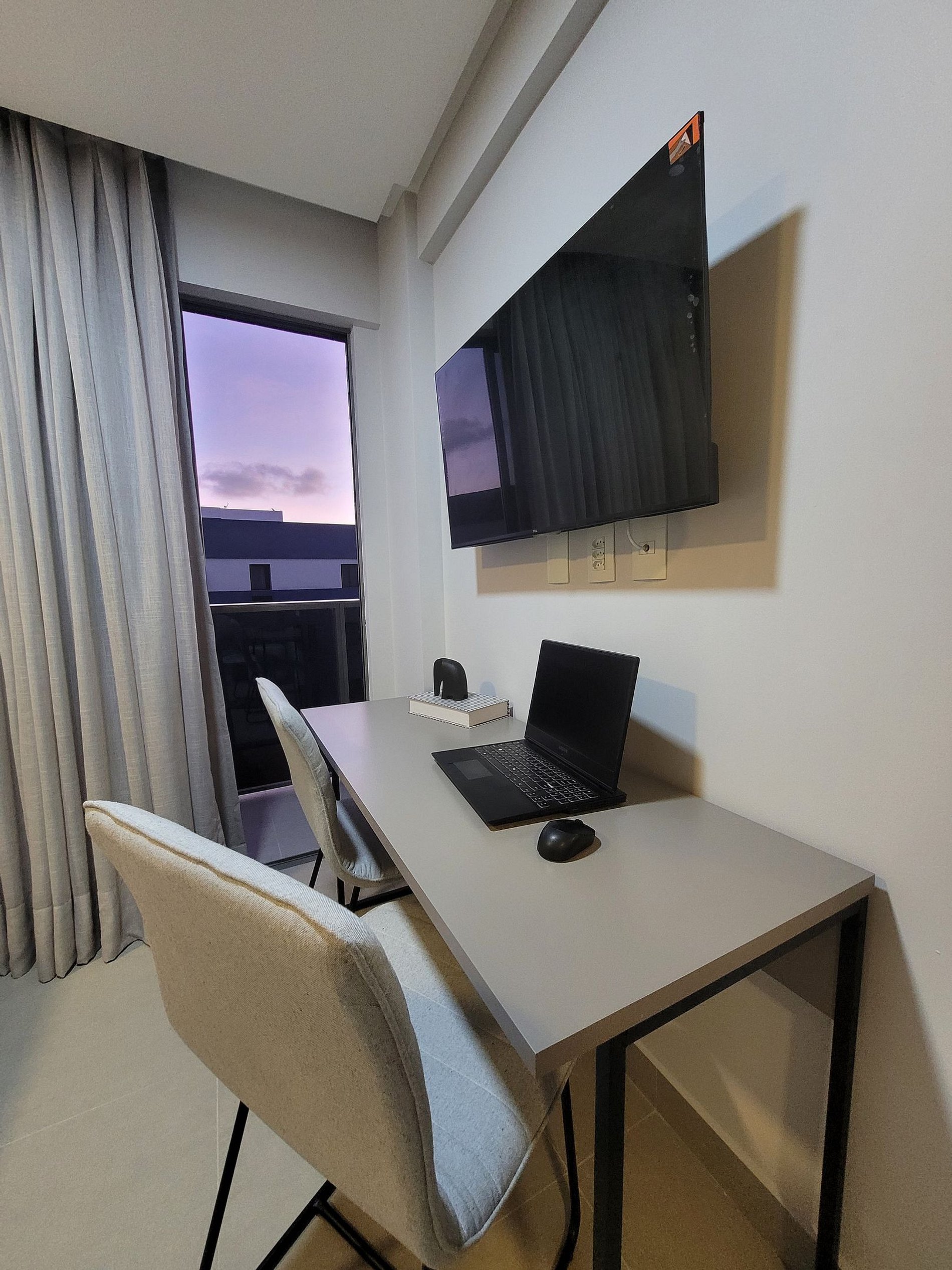 A cozinha é completa, Smart TV, ar-condicionado, espaço para trabalho e Wi-Fi. Enxoval de cama e banho, sua comodidade está garantida.