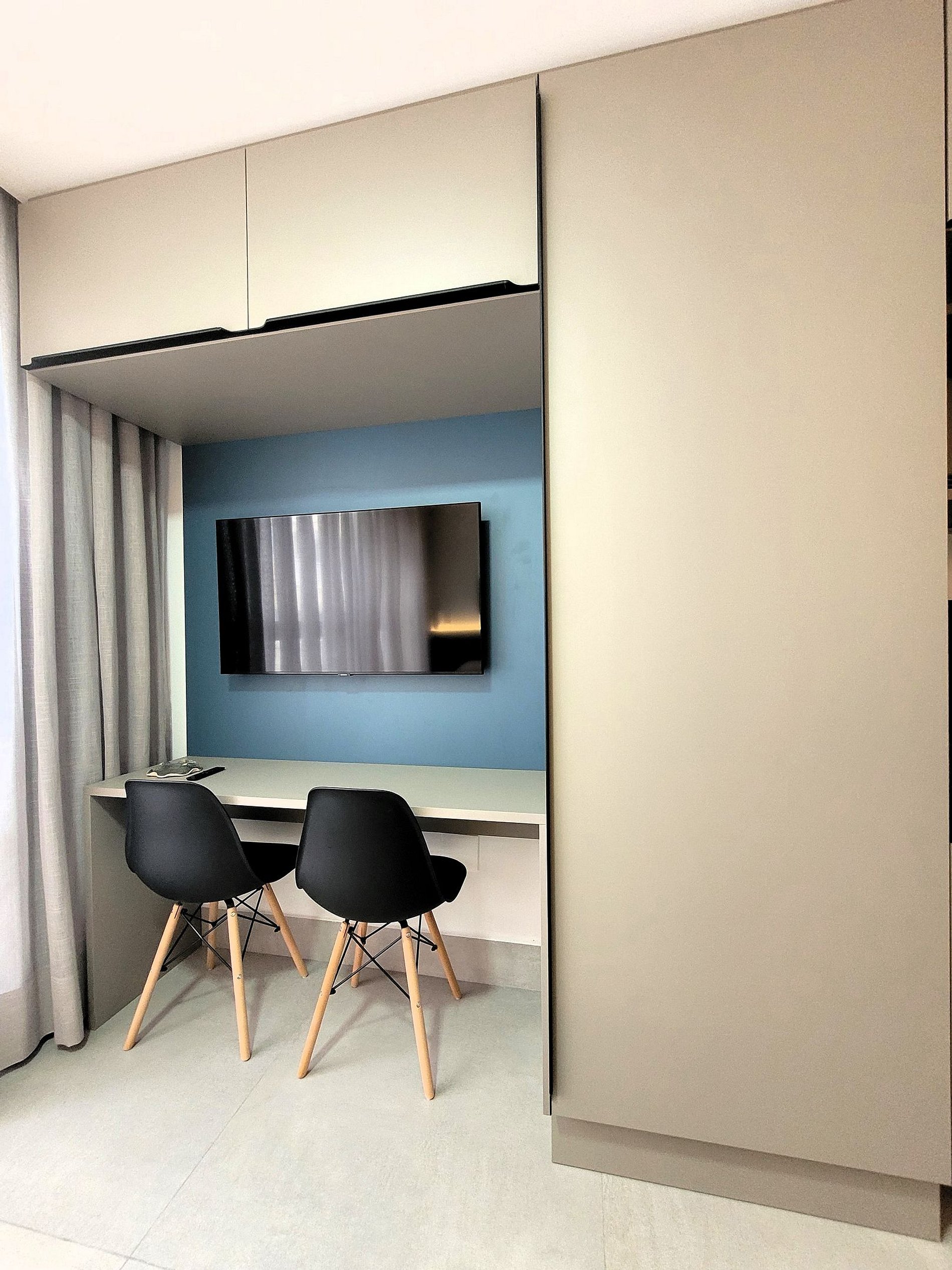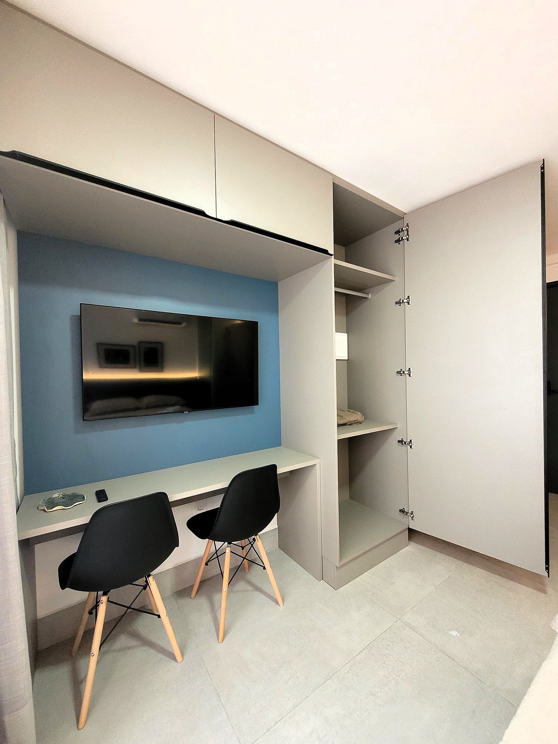 A cozinha é equipada com frigobar, sanduicheira, microondas, máquina de café Nespresso e utensílios essenciais para preparar refeições rápidas com toda a comodidade. A acomodação conta com uma cama Casal com cama AUXILIAR solteiro, para acomodar mais um adulto ou criança. Além disso, oferece Smart TV, ar condicionado, armário para roupas e banheiro.