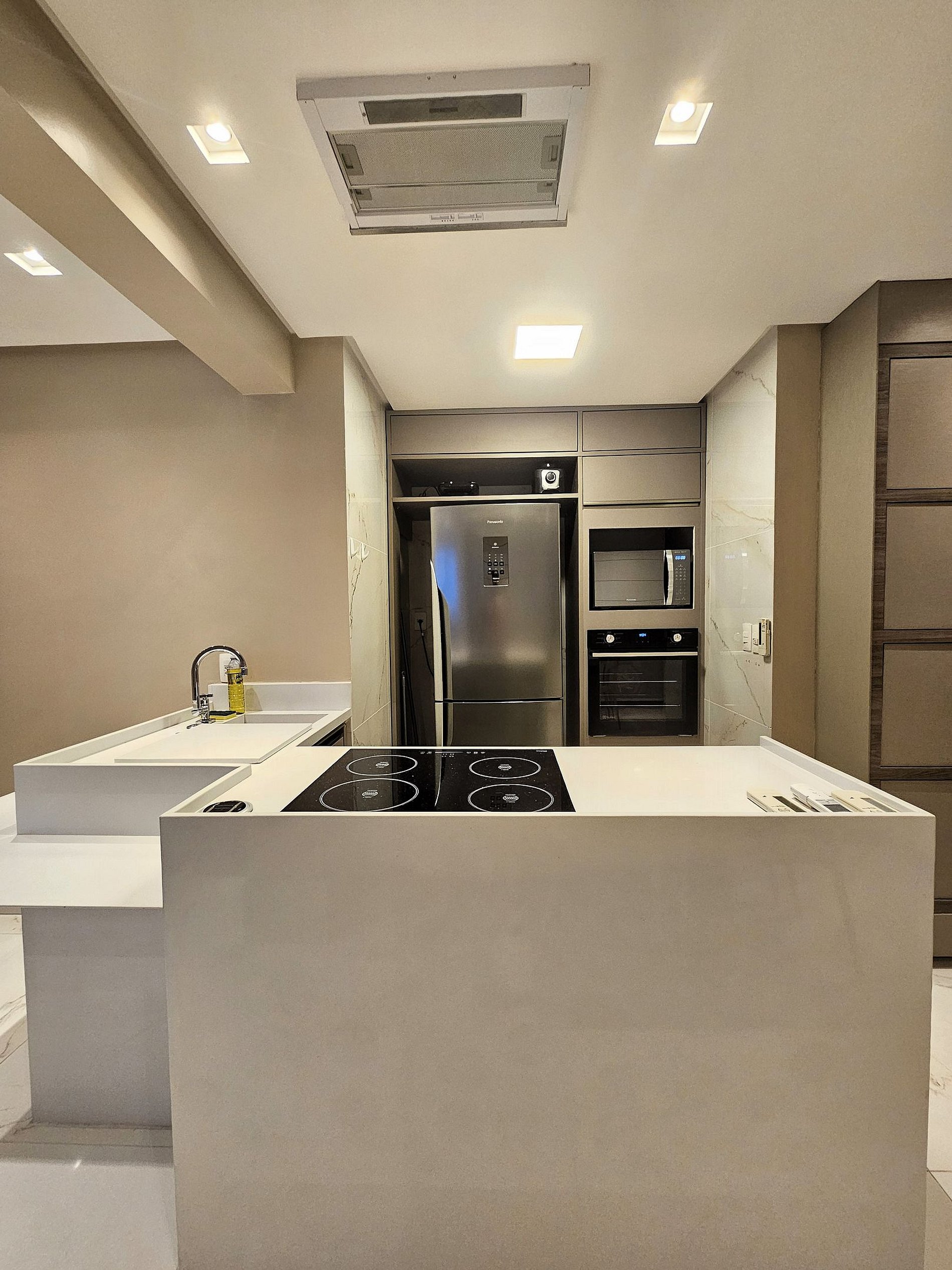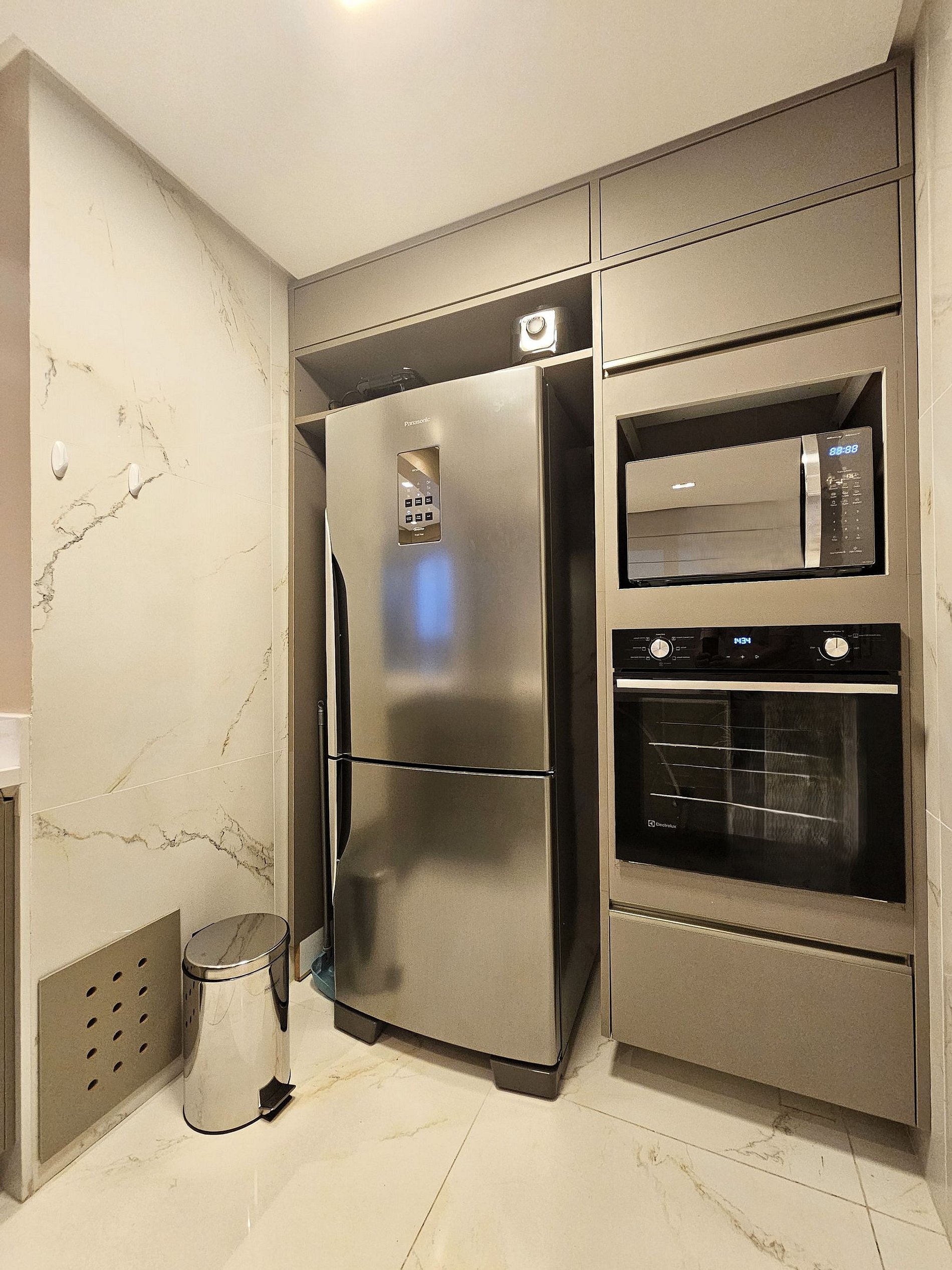 A cozinha é equipada com geladeira, forno elétrico, microondas, cooktop, sanduicheira, cafeteira, liquidificador e utensílios essenciais para preparar refeições rápidas com toda a comodidade.