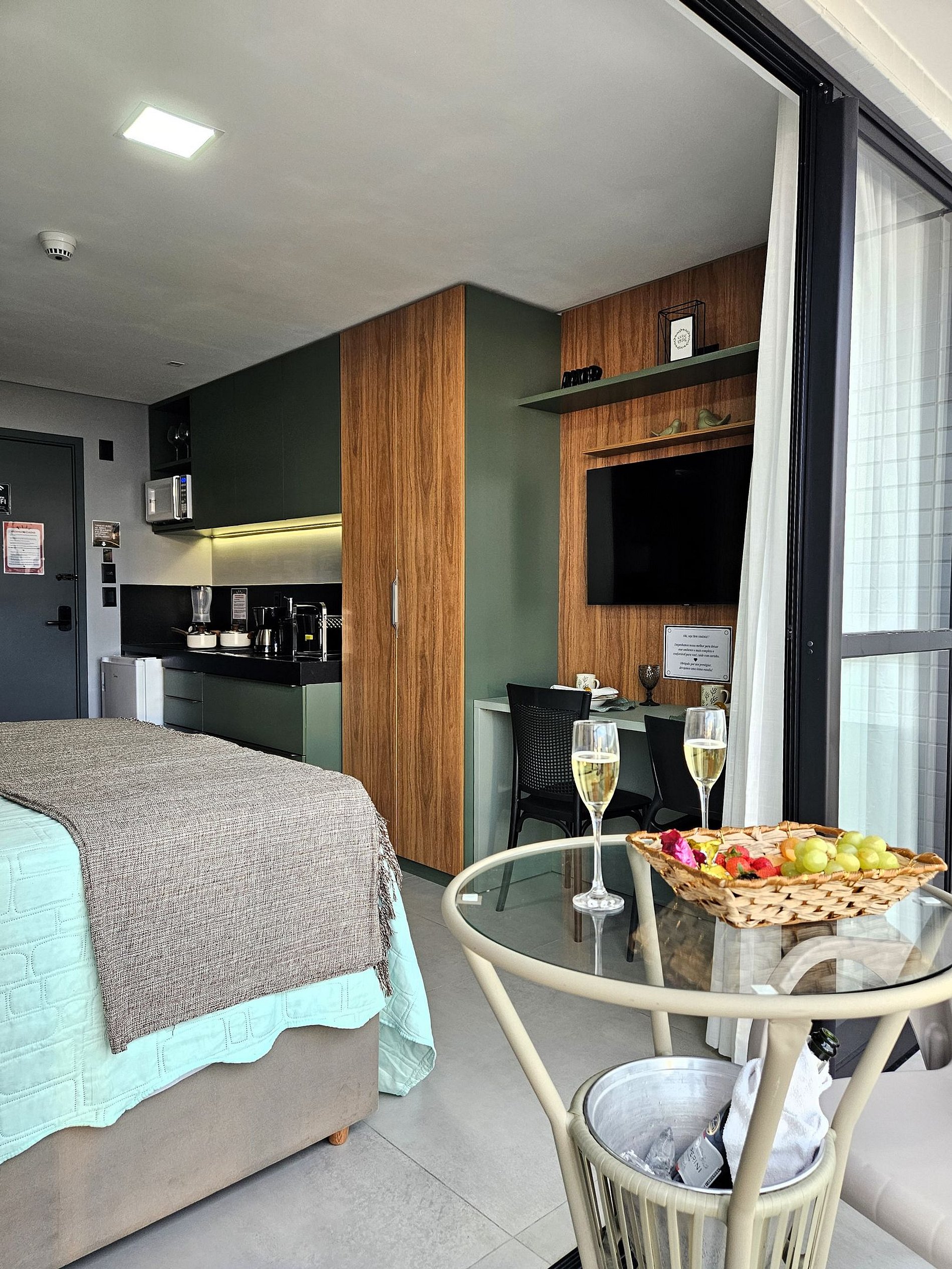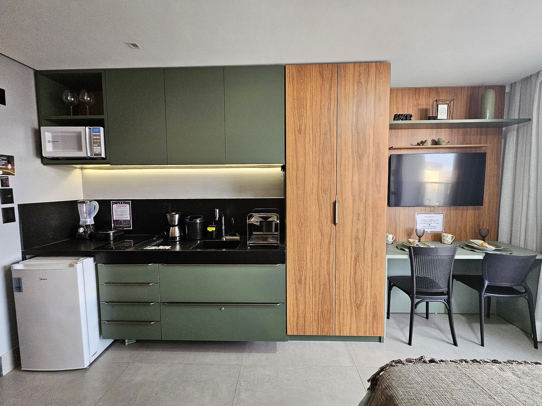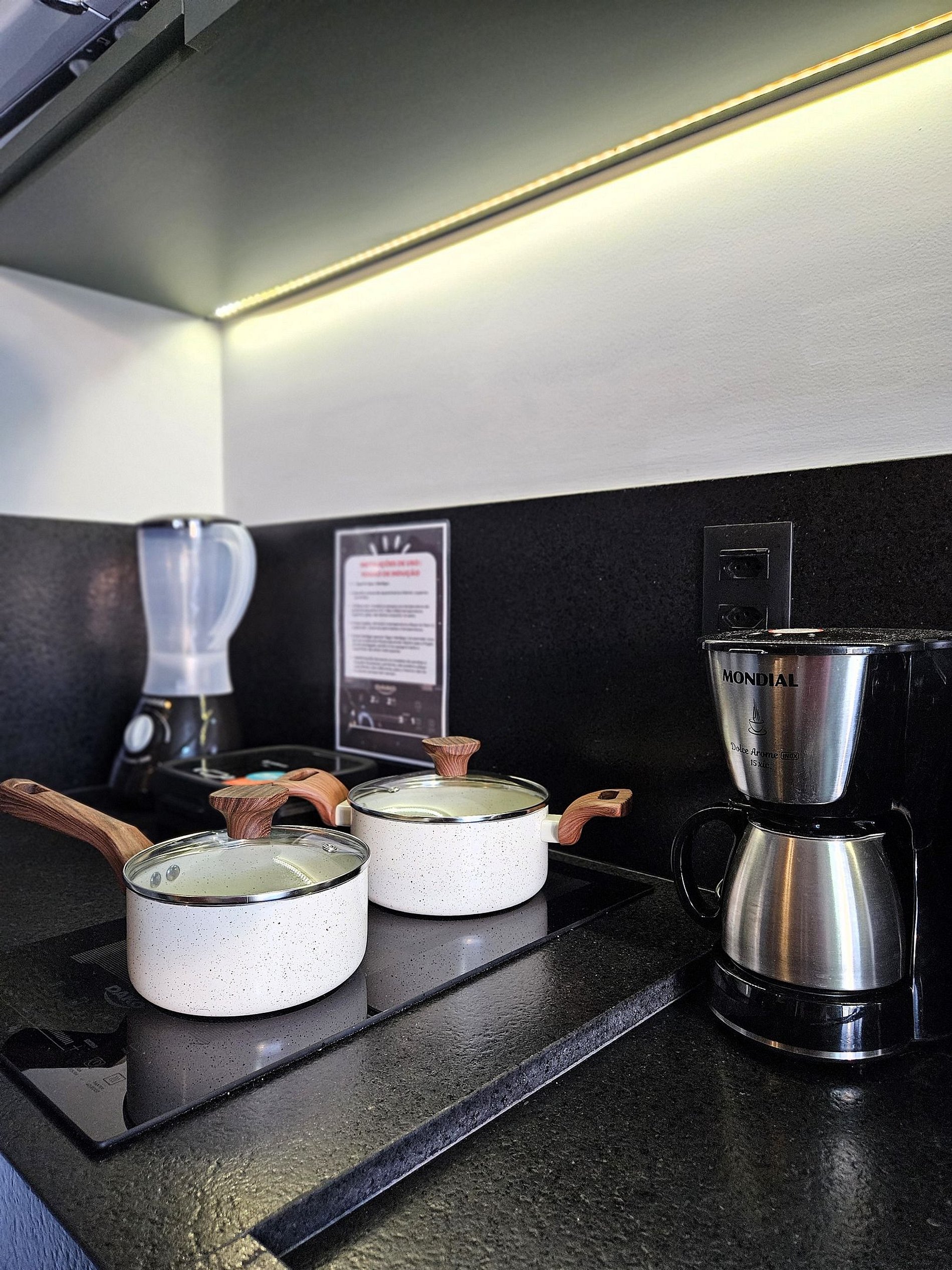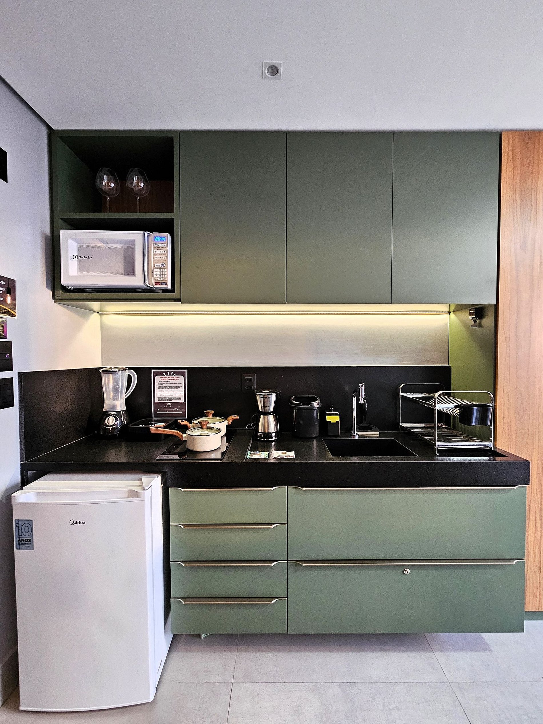 A cozinha é equipada com frigobar, sanduicheira, liquidificador, cafeteira, microondas, cooktop de indução e utensílios essenciais para preparar refeições rápidas com toda a comodidade.