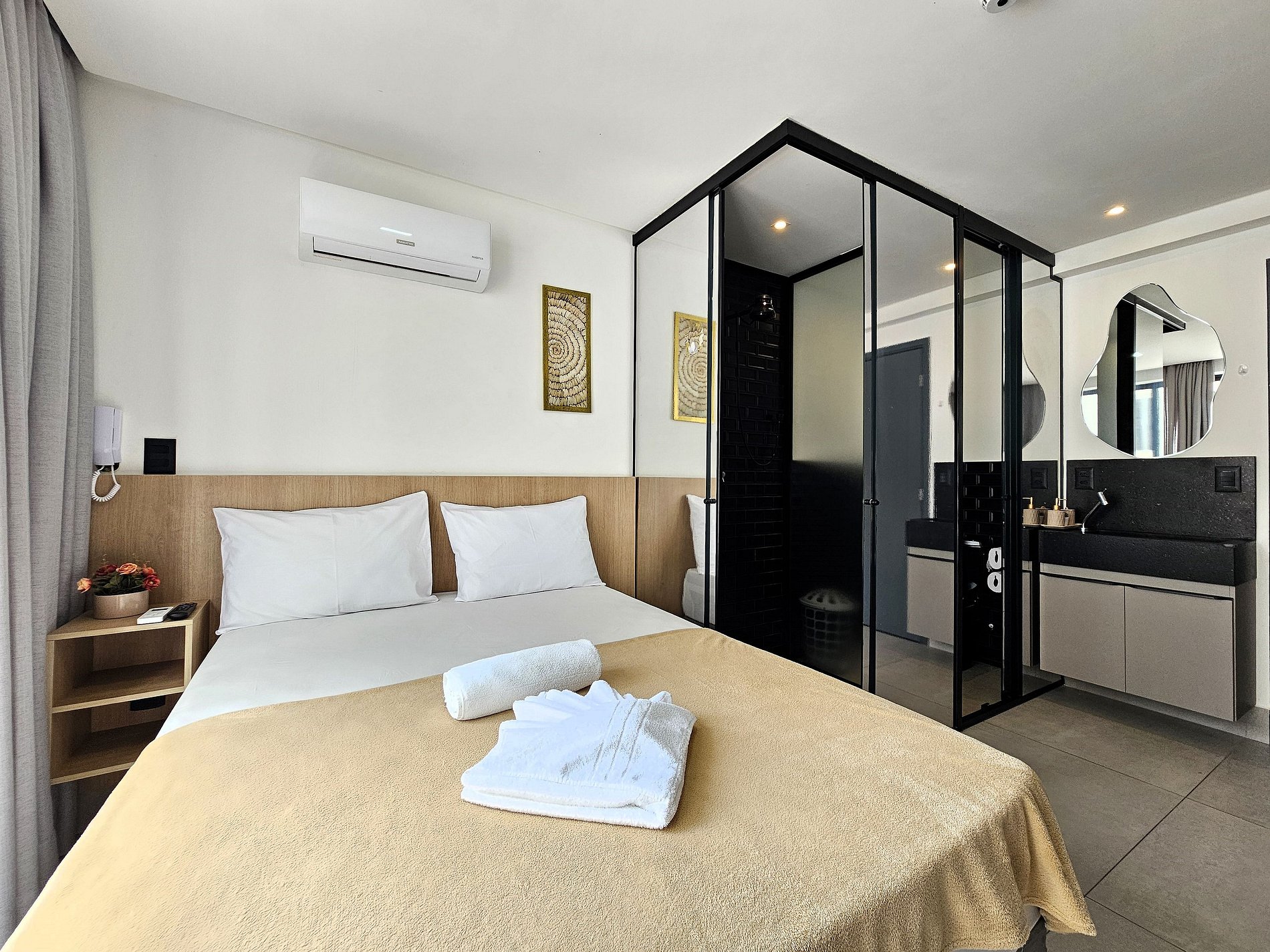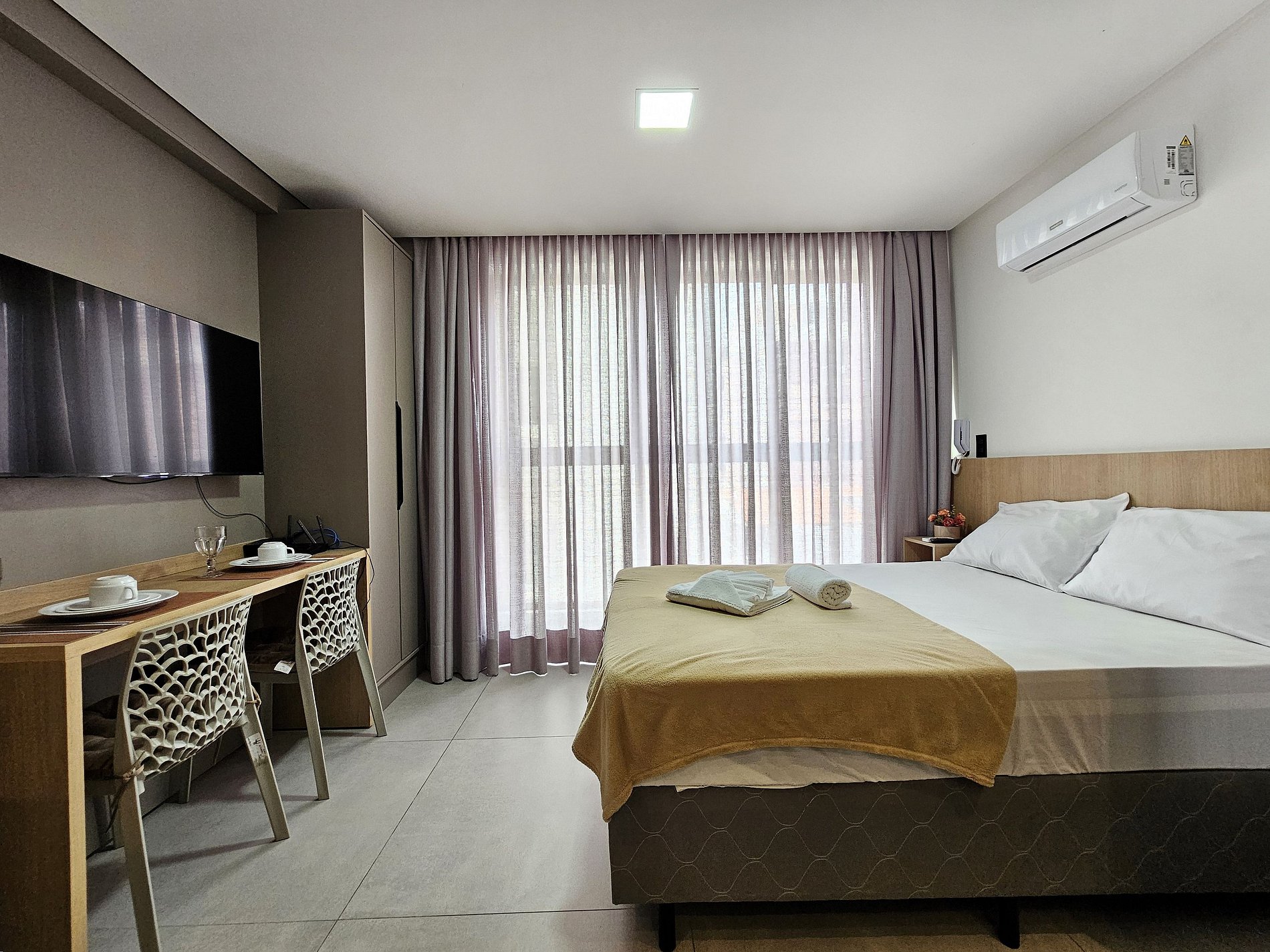 O studio conta com cozinha completa, Smart TV, ar-condicionado, internet cabeada e Wi-Fi, além de enxoval de cama e banho — tudo pensado para sua comodidade.