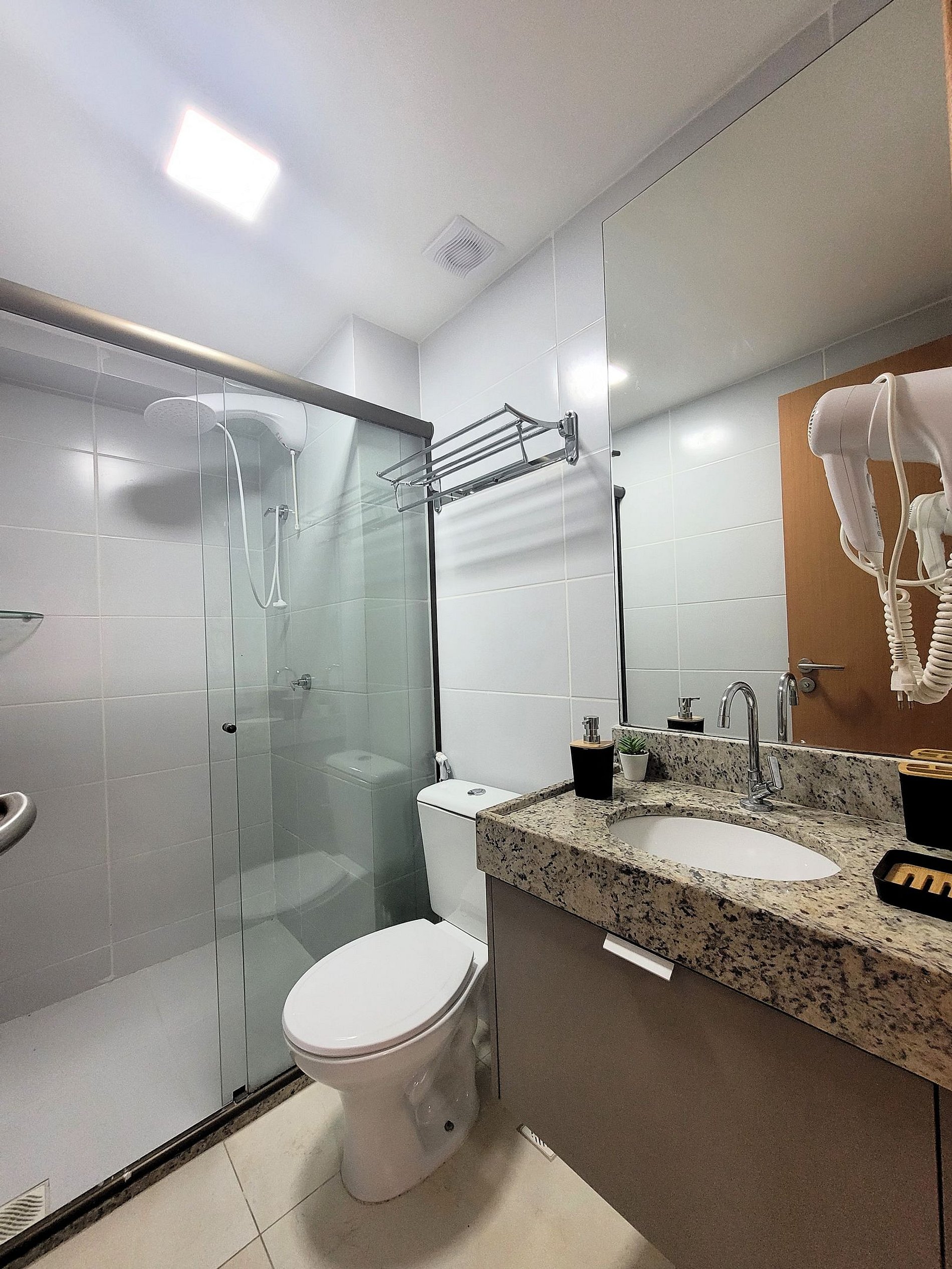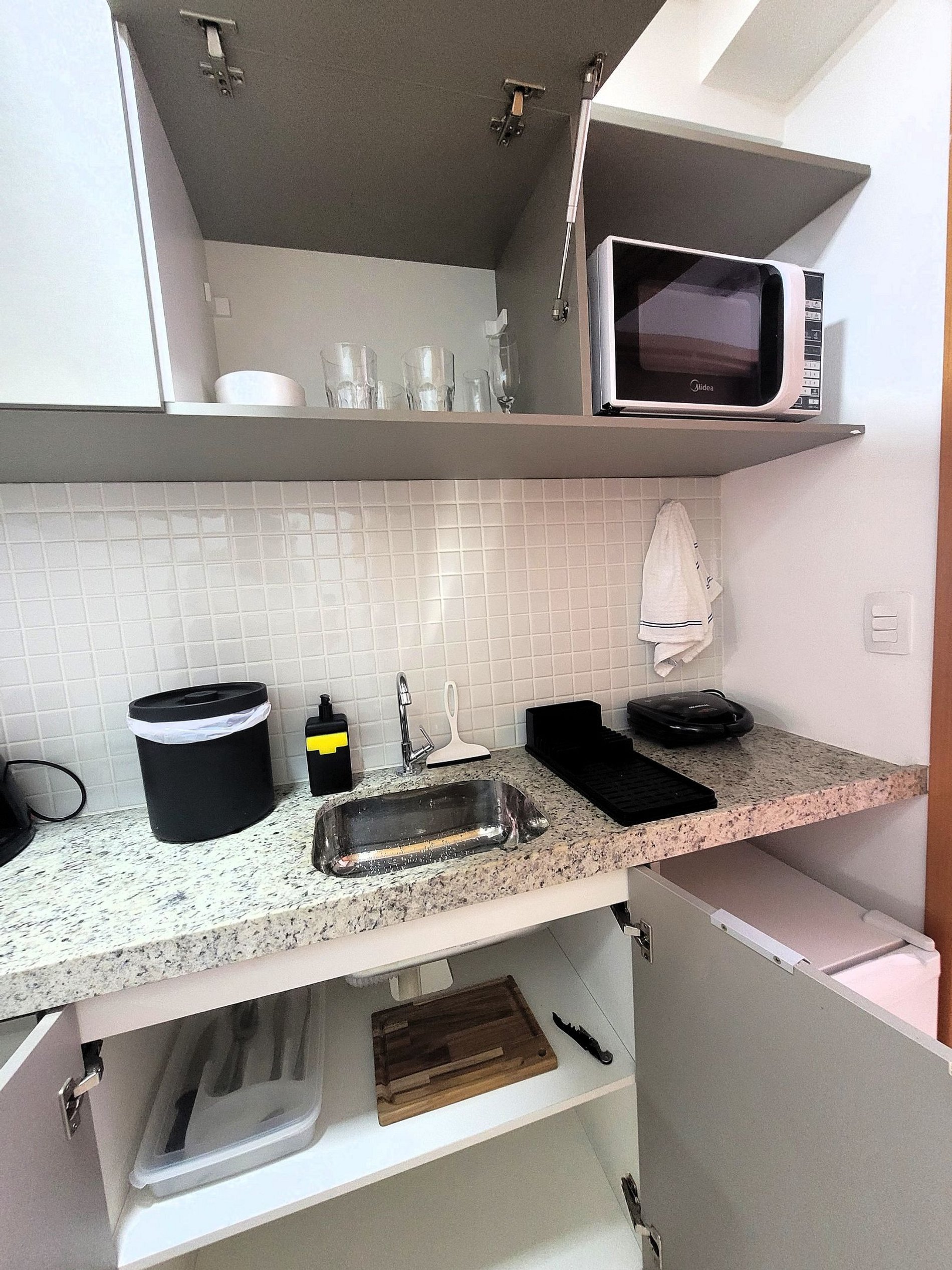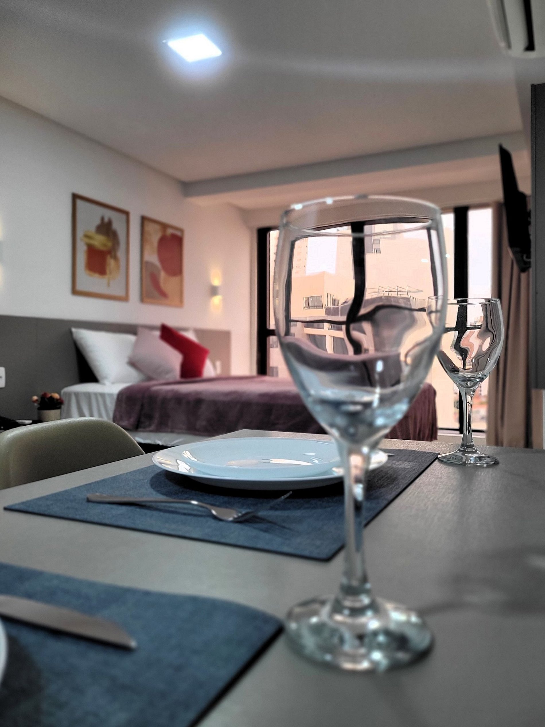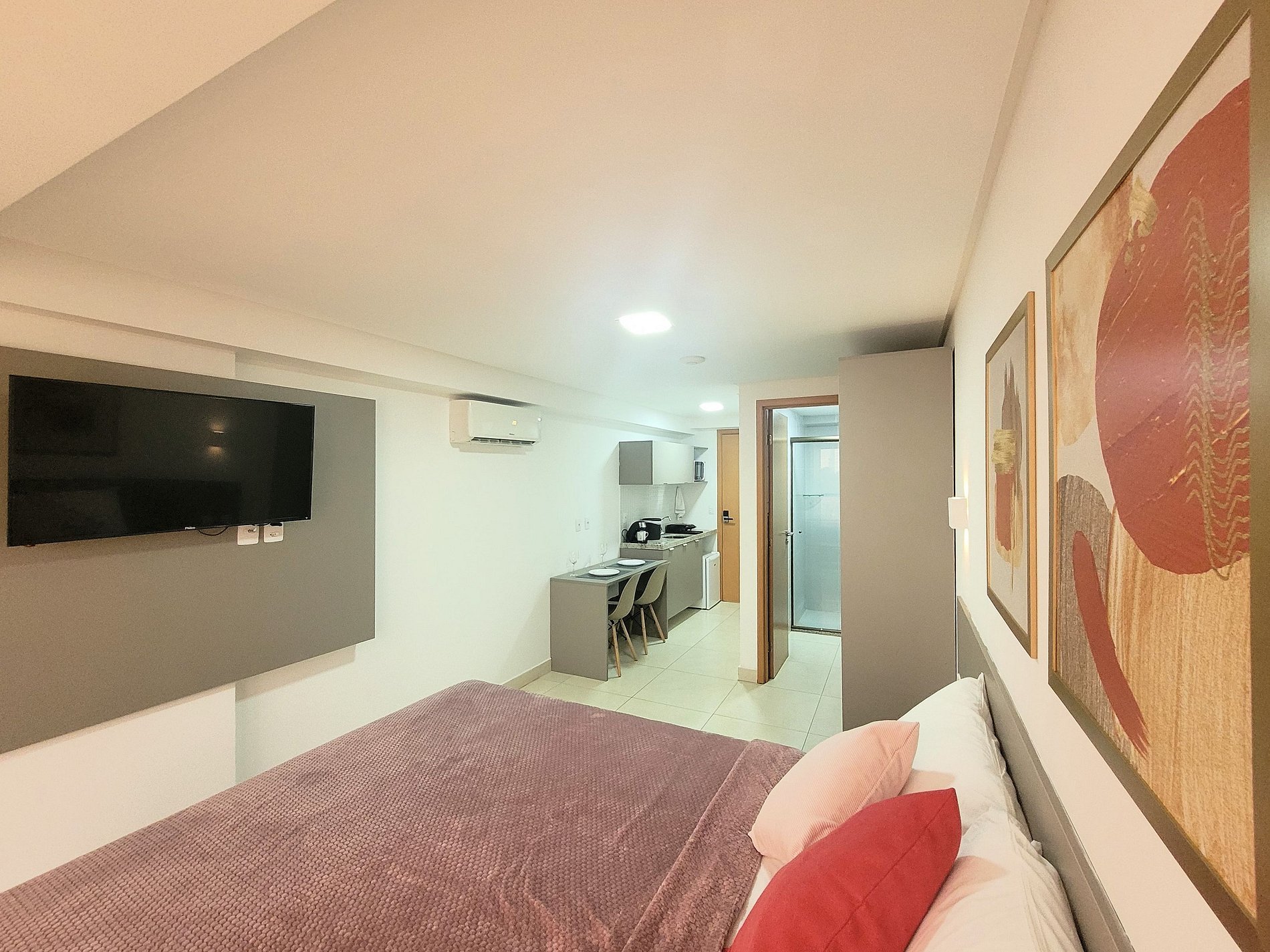 A cozinha inclui frigobar, micro-ondas, liquidificador, sanduicheira, cafeteira, ou seja, utensílios para preparar refeições rápidas com toda comodidade. Caso necessite trabalhar, temos um espaço equipado com internet Wi-Fi. Possui cama Queen e colchão extra, Smart TV, Ar-condicionado, ferro de passar, secador de cabelo, guarda-roupa e banheiro com box e ducha quente. Ou seja, totalmente equipado para hospedagem de curta ou longa duração, proporcionando uma estadia completa e sem preocupações.