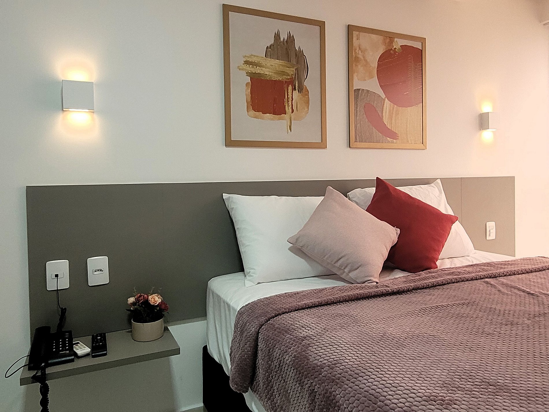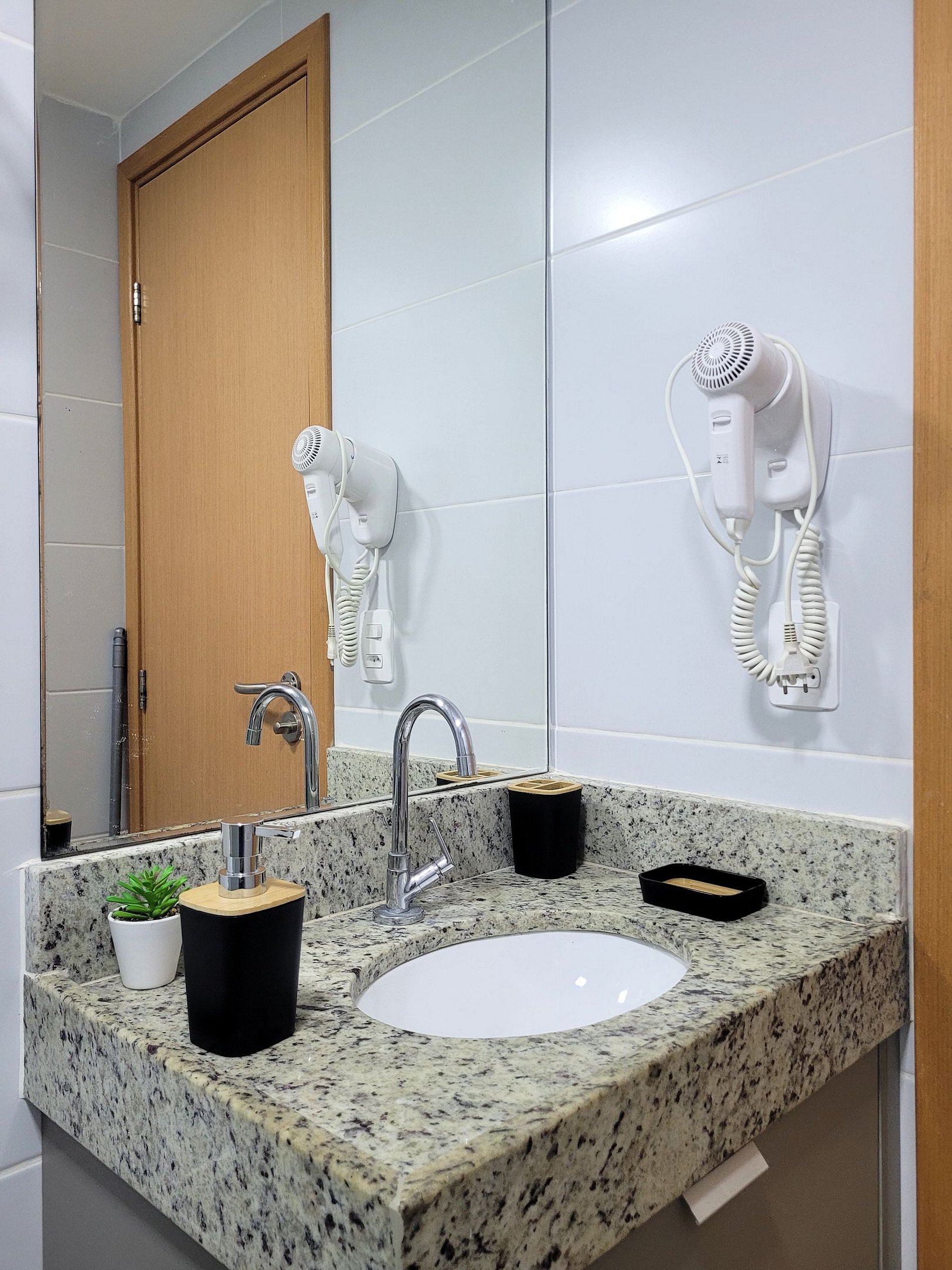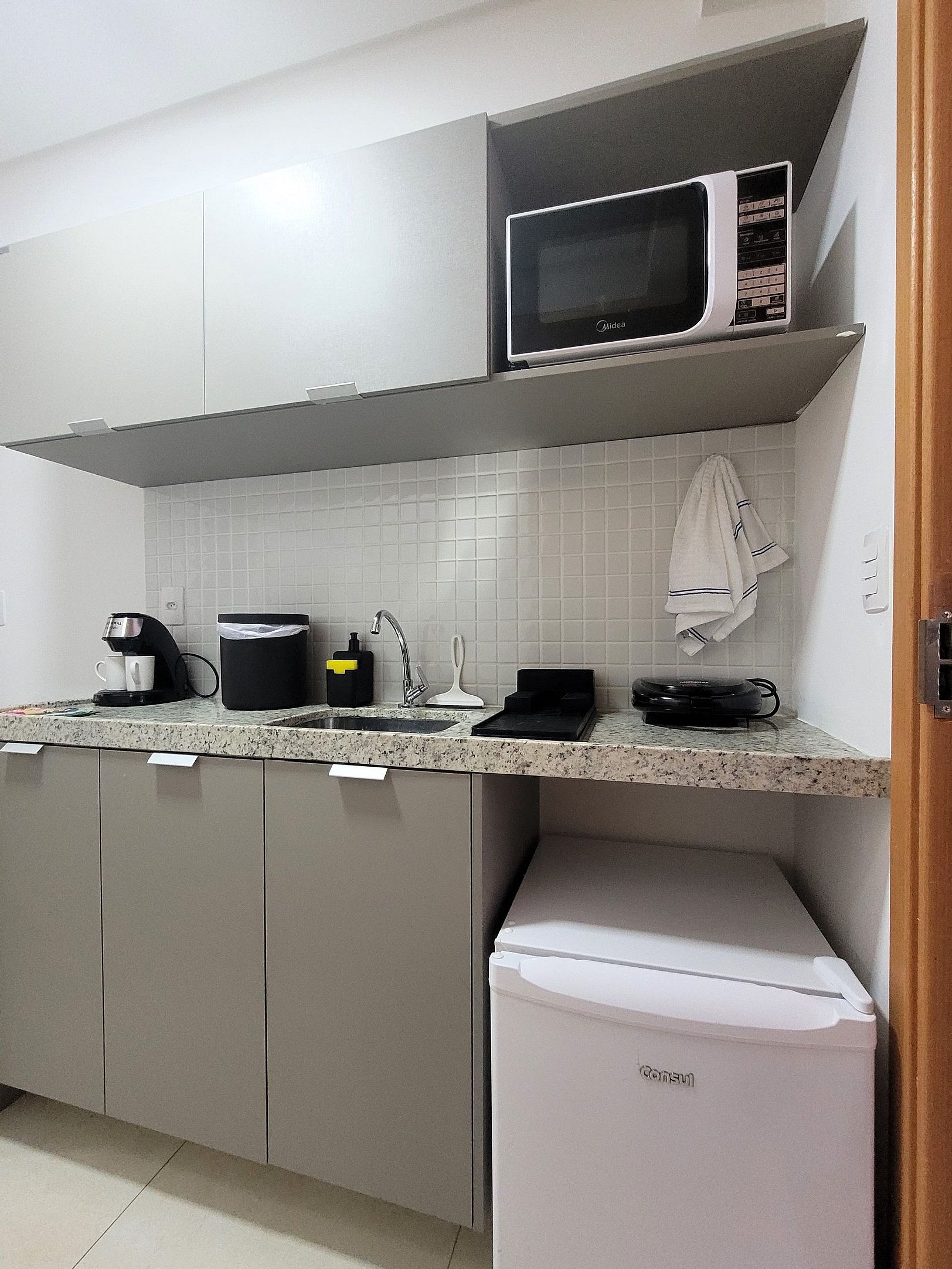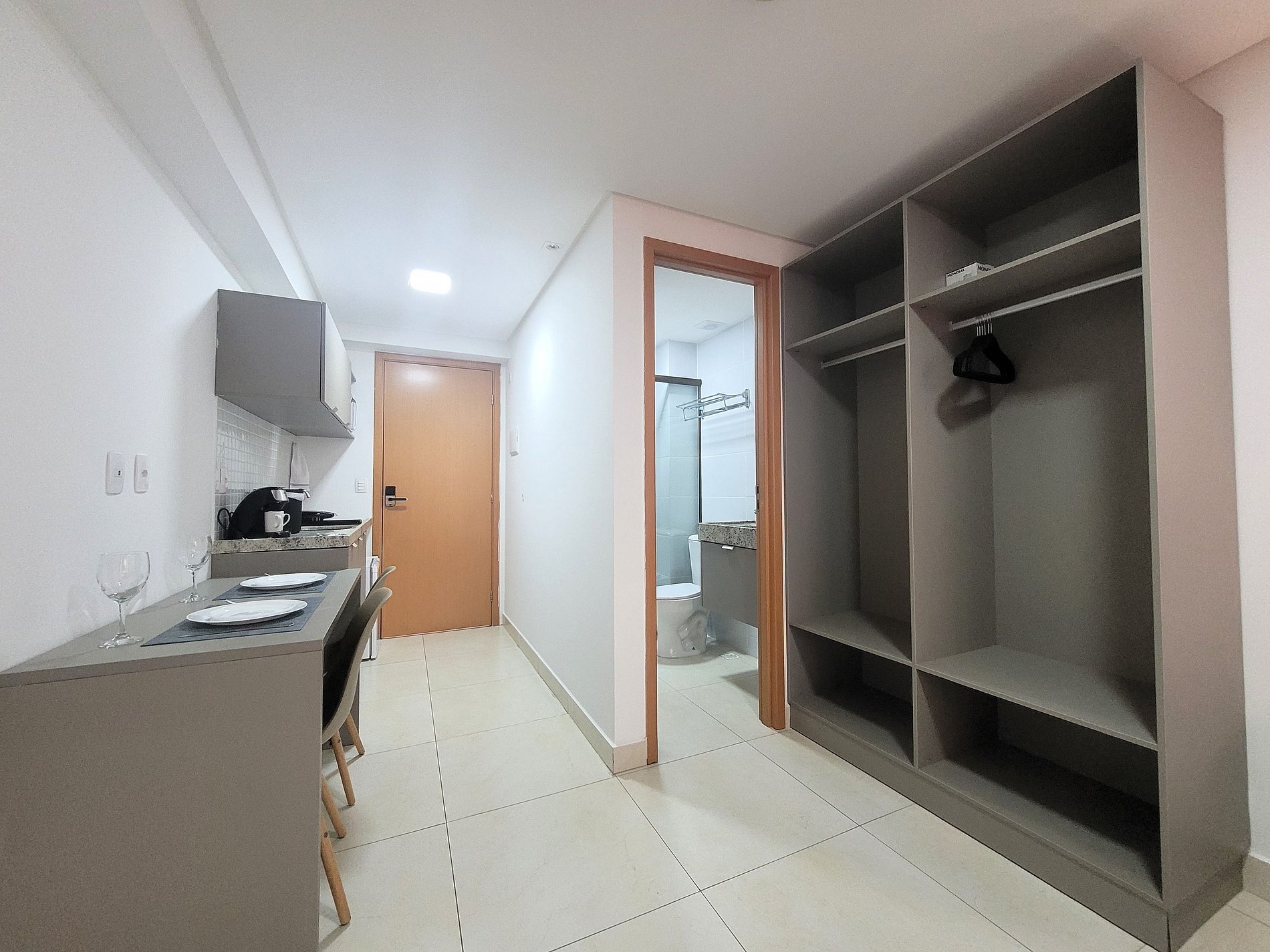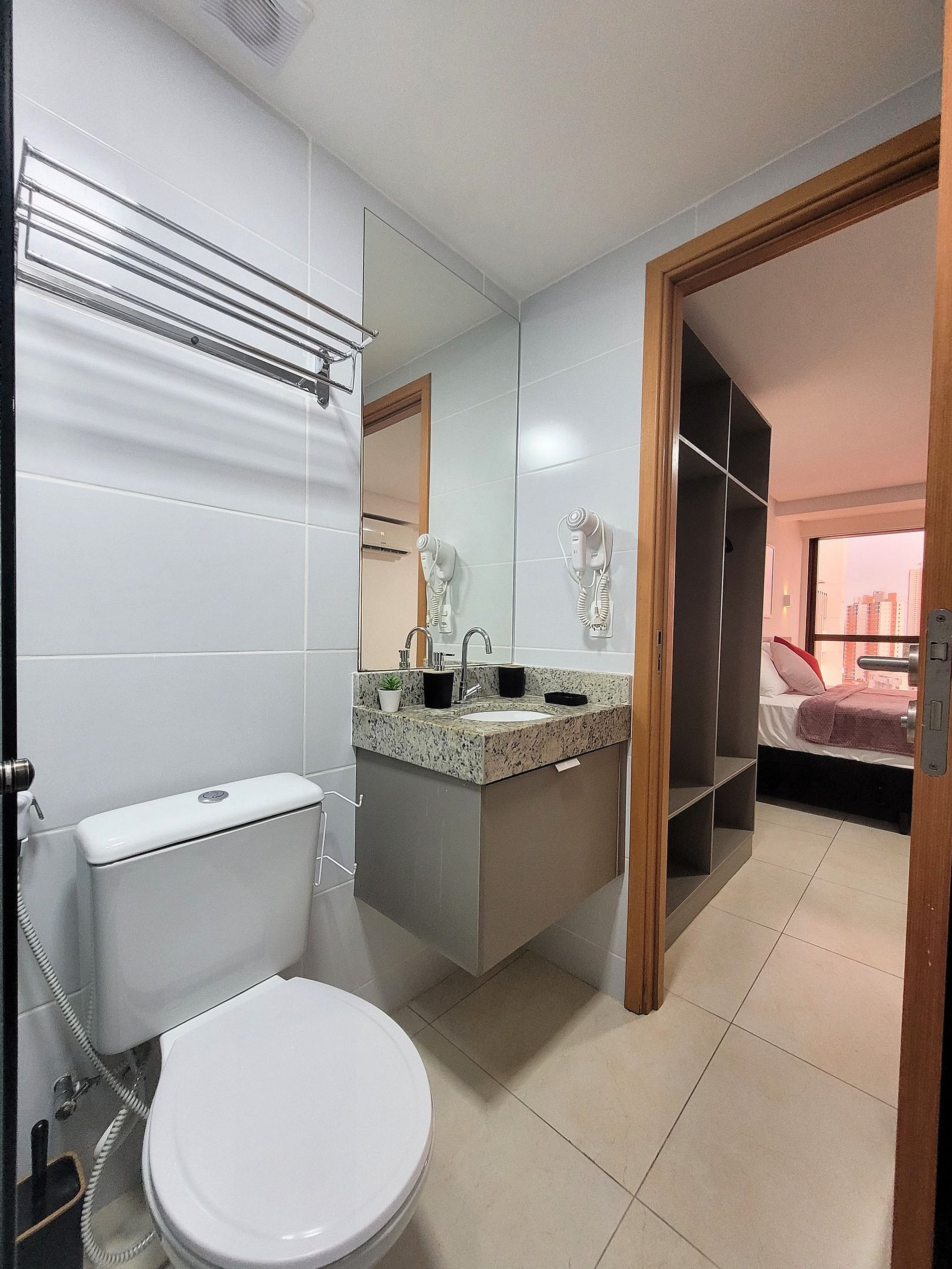 A cozinha inclui frigobar, micro-ondas, liquidificador, sanduicheira, cafeteira, ou seja, utensílios para preparar refeições rápidas com toda comodidade. Caso necessite trabalhar, temos um espaço equipado com internet Wi-Fi. Possui cama Queen e colchão extra, Smart TV, Ar-condicionado, ferro de passar, secador de cabelo, guarda-roupa e banheiro com box e ducha quente. Ou seja, totalmente equipado para hospedagem de curta ou longa duração, proporcionando uma estadia completa e sem preocupações.
