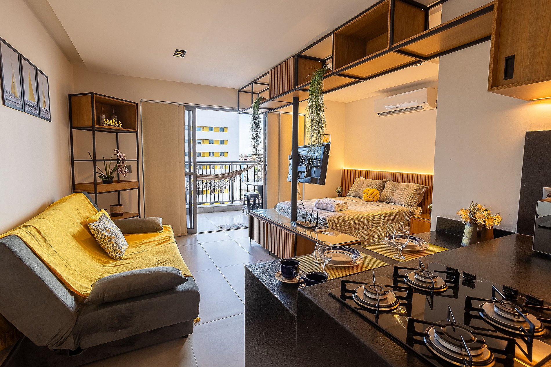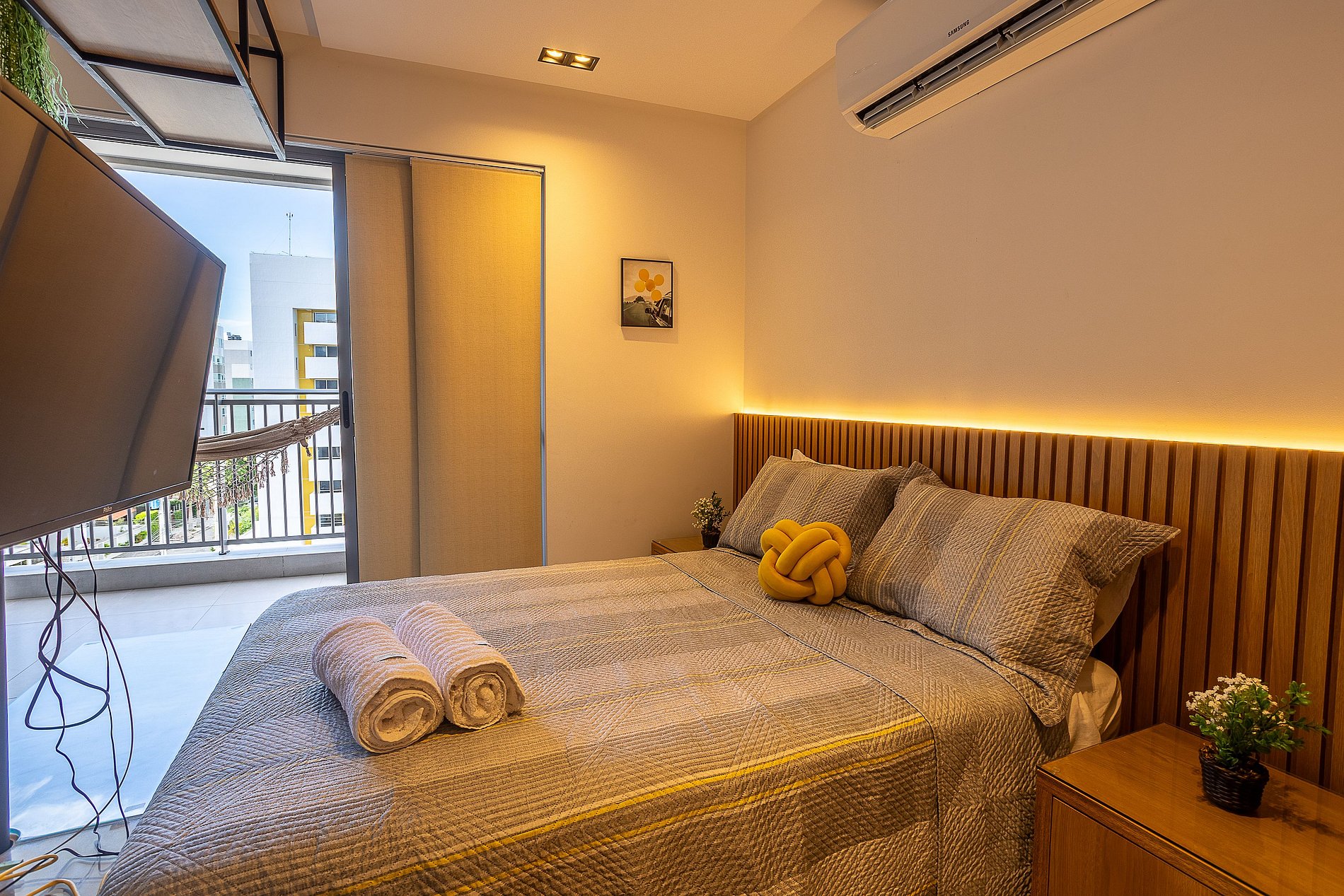 A acomodação conta com uma Cama Casal e um Sofá-Cama, perfeita para receber até quatro pessoas com conforto. Está equipado com TV, ar condicionado, armário para roupas e banheiro privativo. E ainda possui uma varanda, ideal para relaxar e aproveitar a brisa.