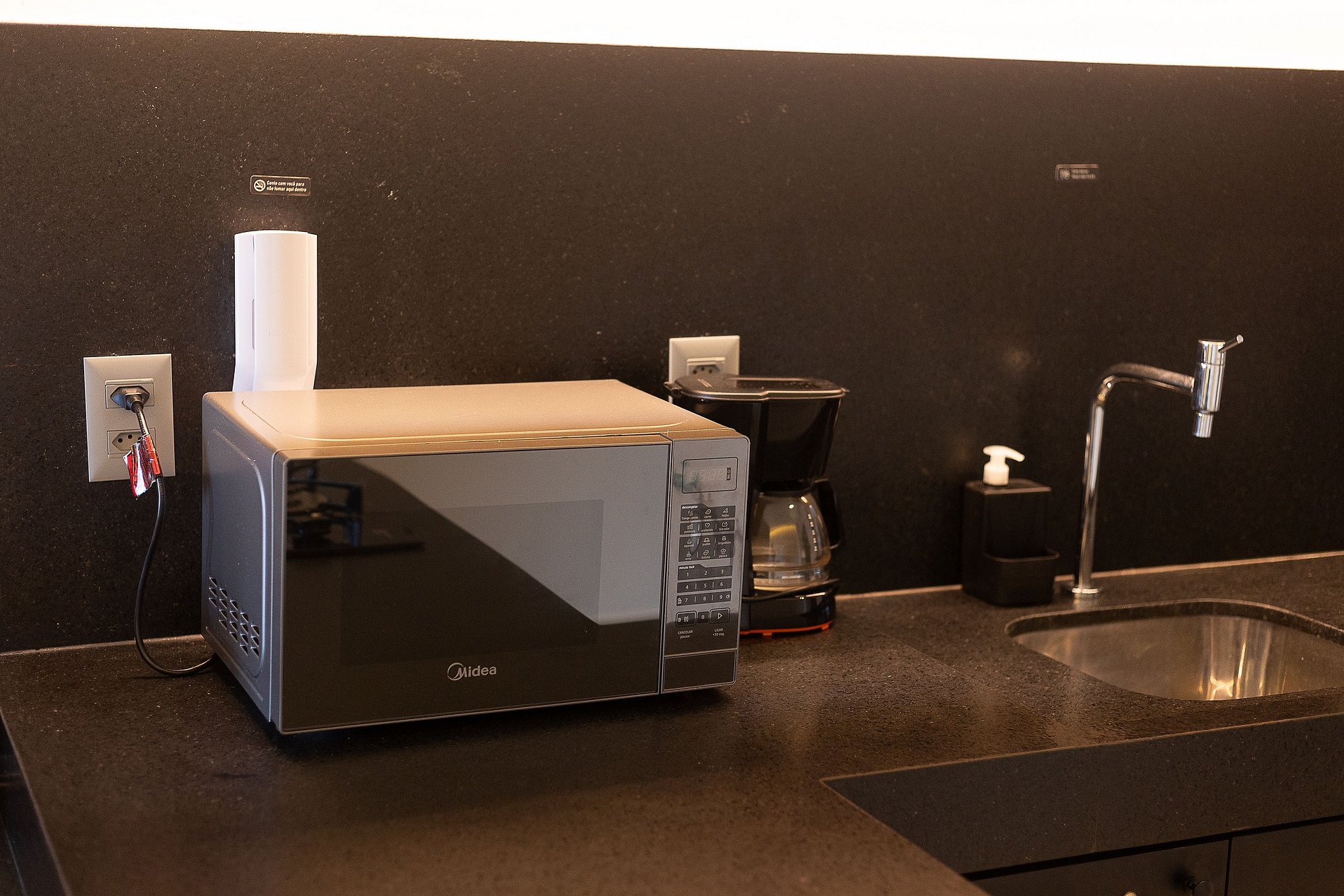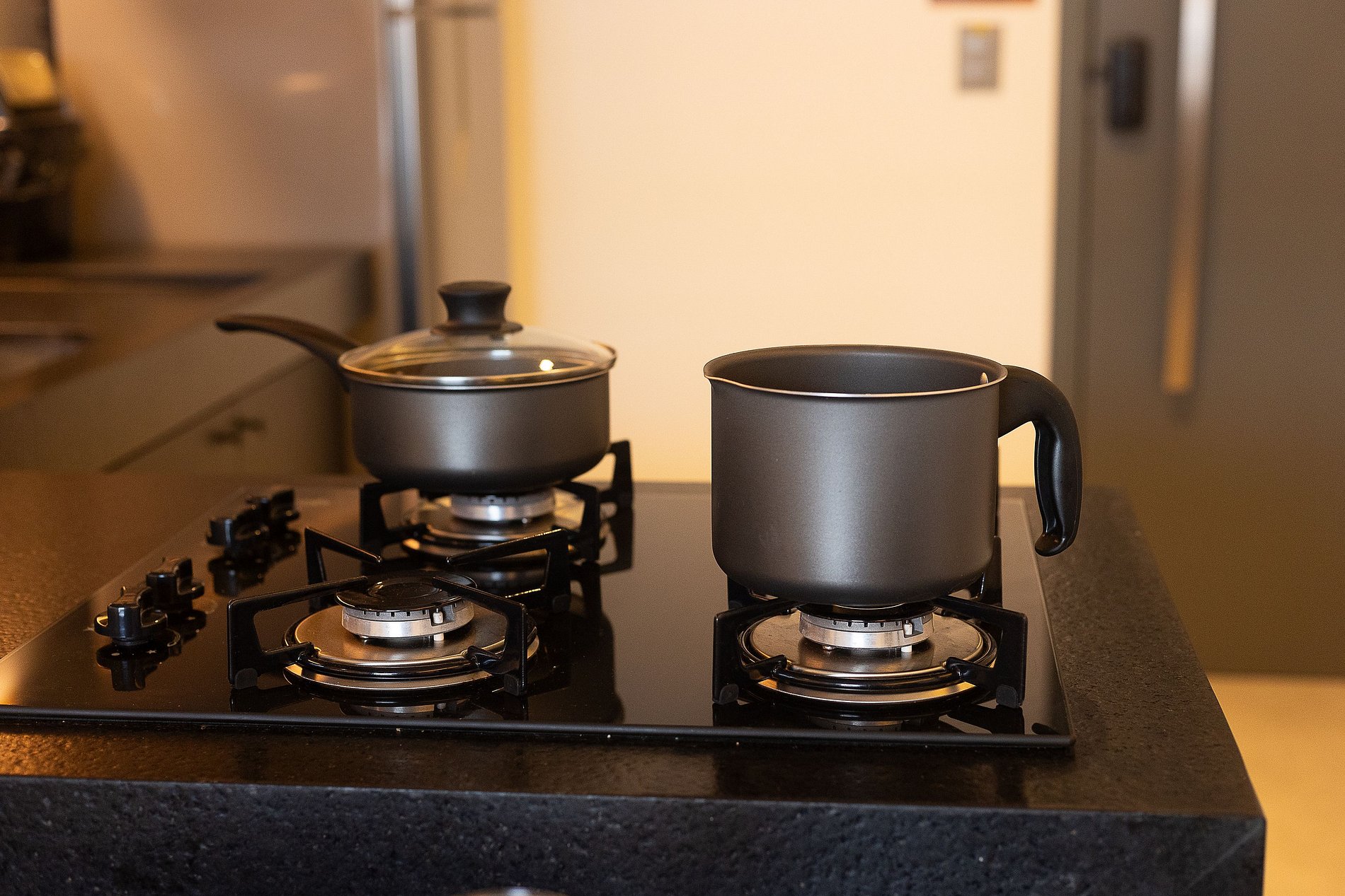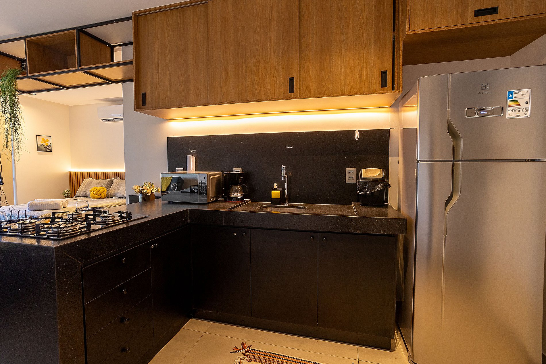 A cozinha é equipada com geladeira, microondas, liquidificador, sanduicheira, cafeteira, fogão a gás e utensílios essenciais para preparar refeições rápidas com toda a comodidade.