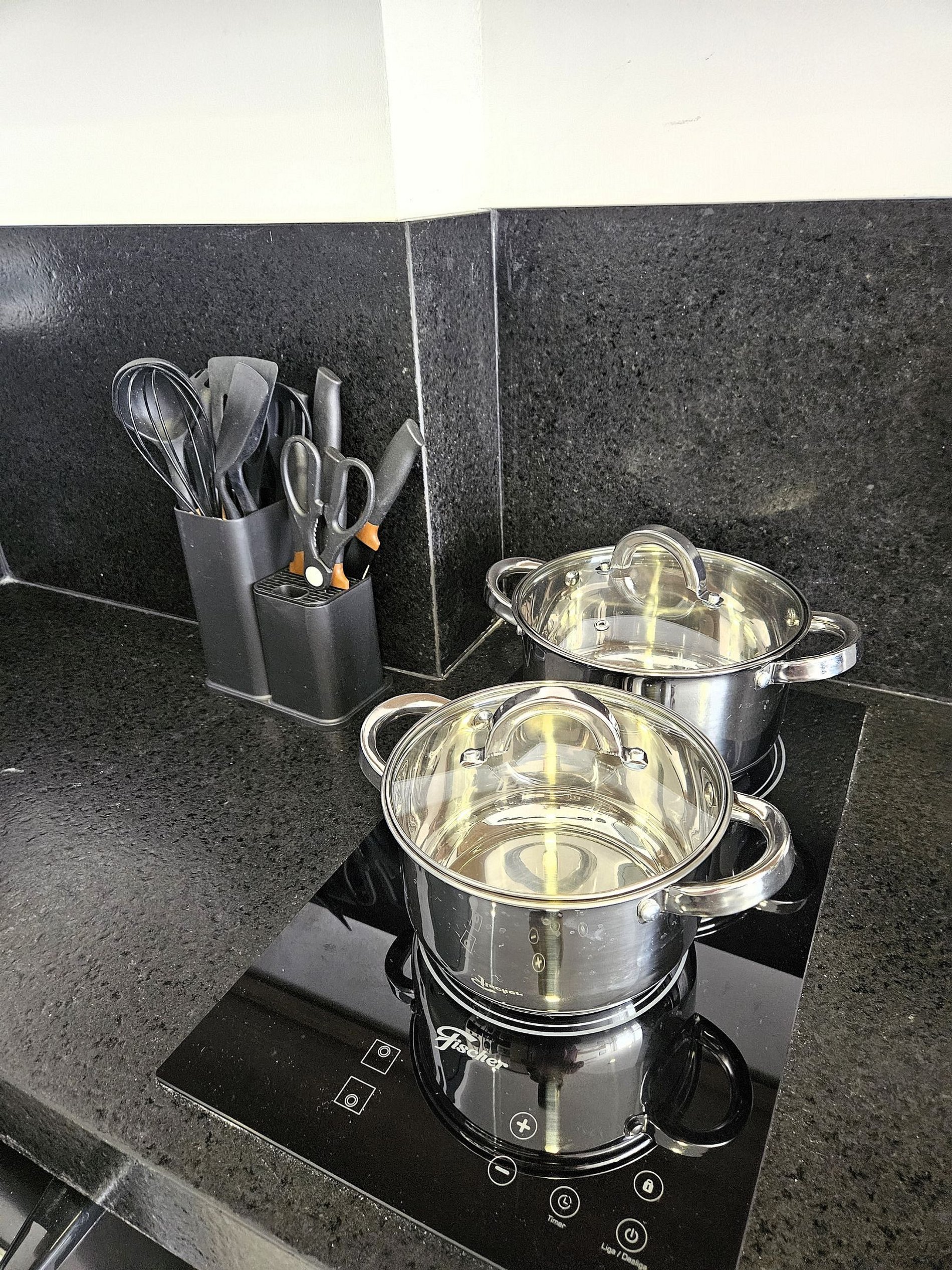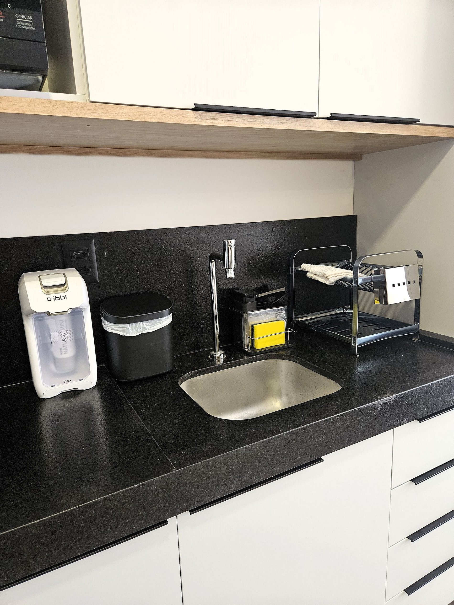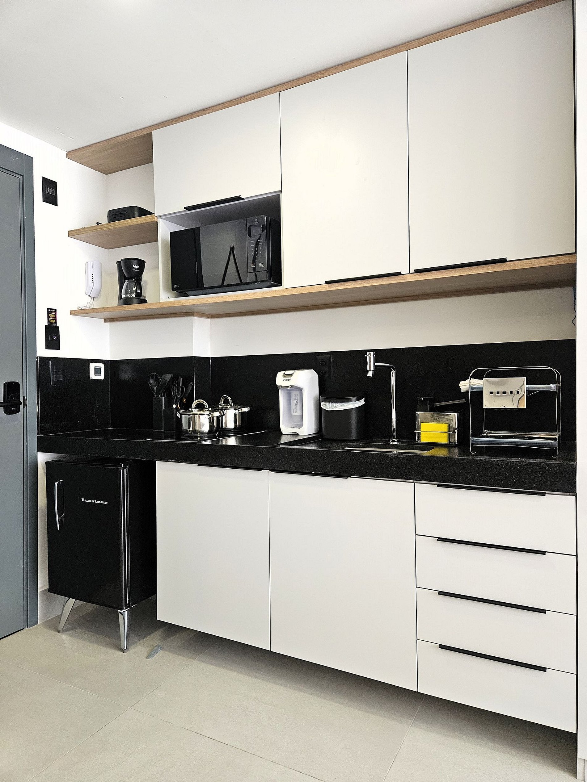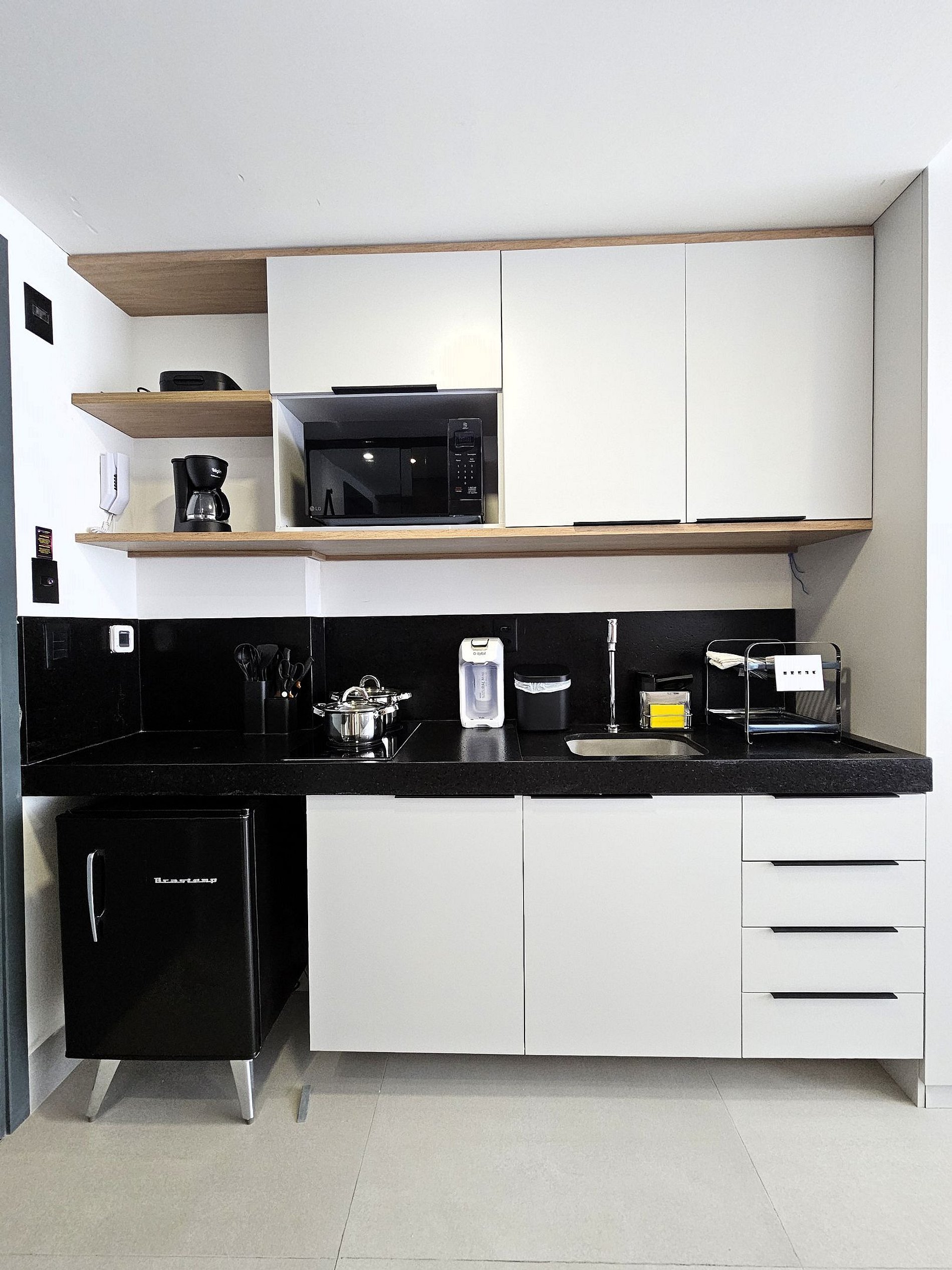 A cozinha inclui frigobar, microondas, cooktop de indução, sanduicheira, cafeteira, filtro de água e utensílios para preparar refeições rápidas com toda comodidade.