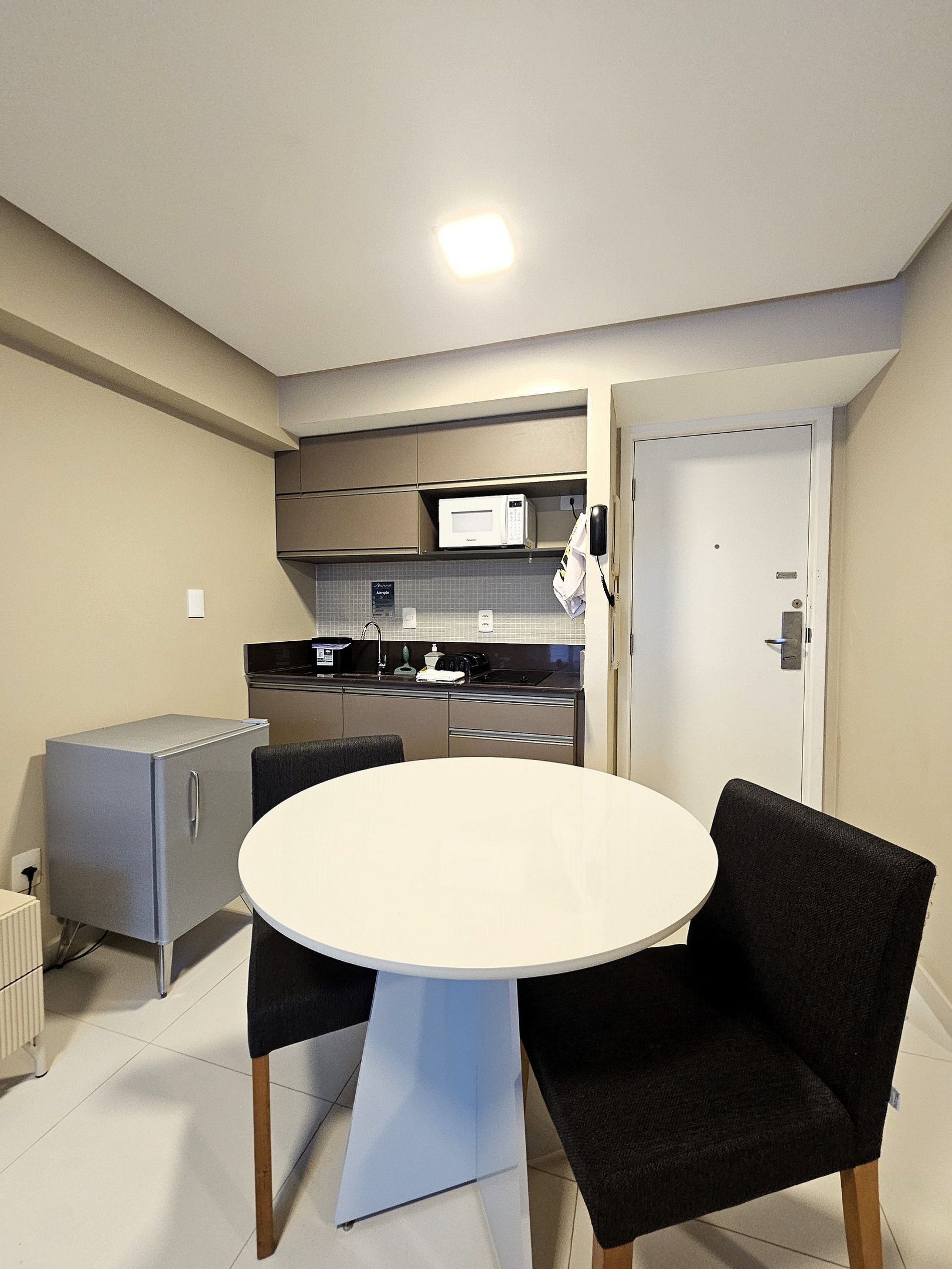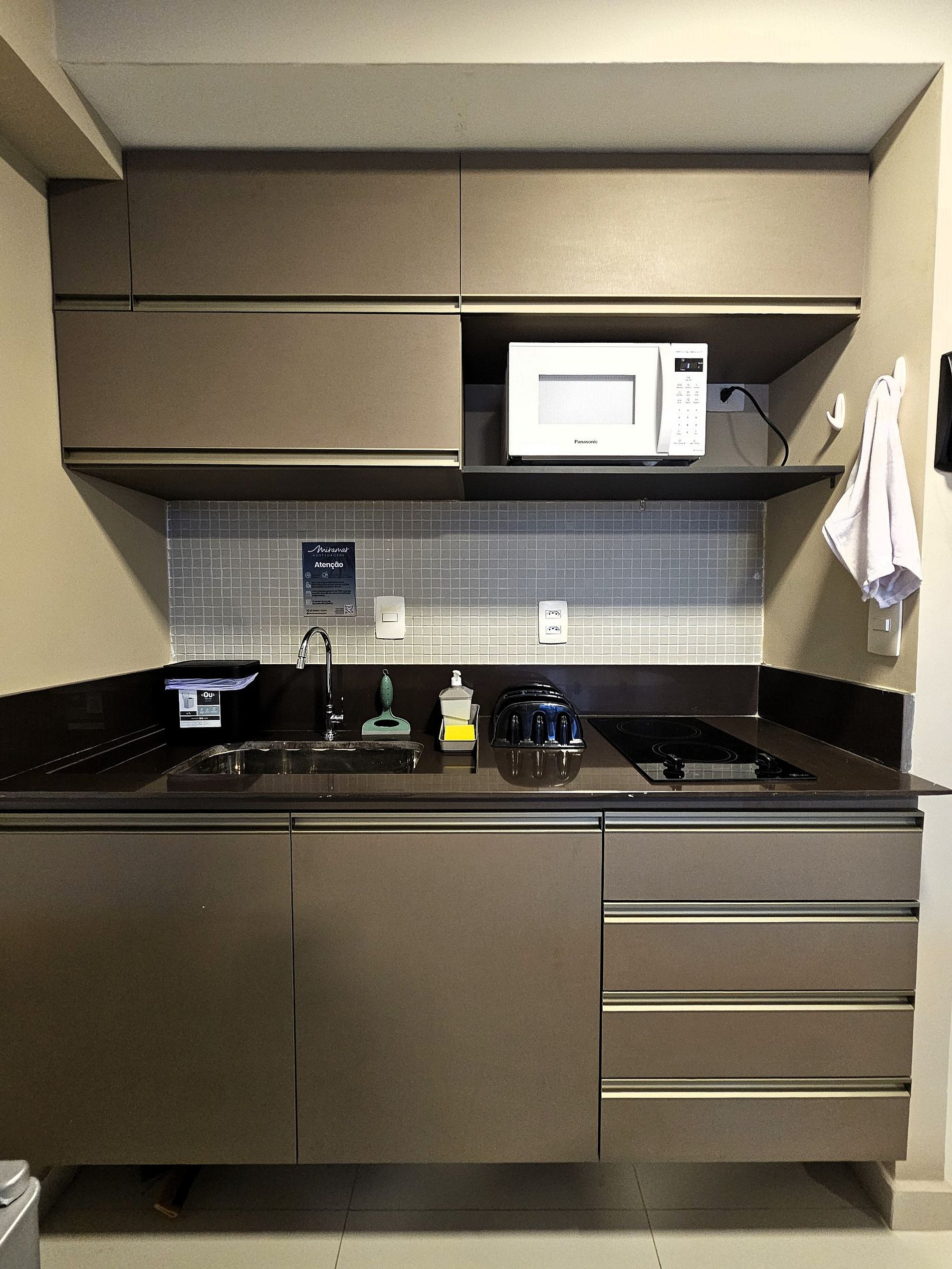 A cozinha é equipada com frigobar, microondas, cooktop, liquidificador, sanduicheira e utensílios essenciais para preparar refeições rápidas com toda a comodidade.