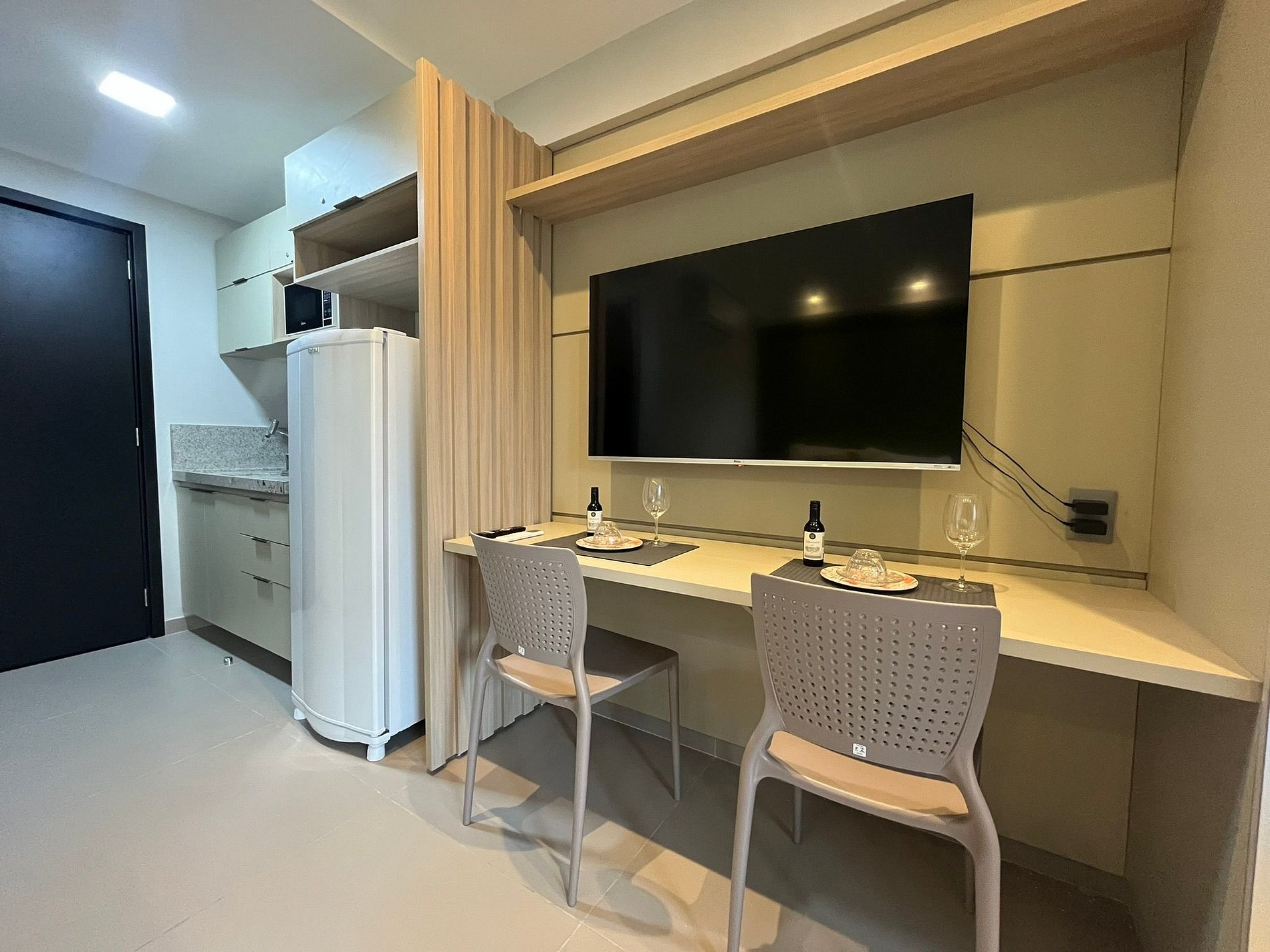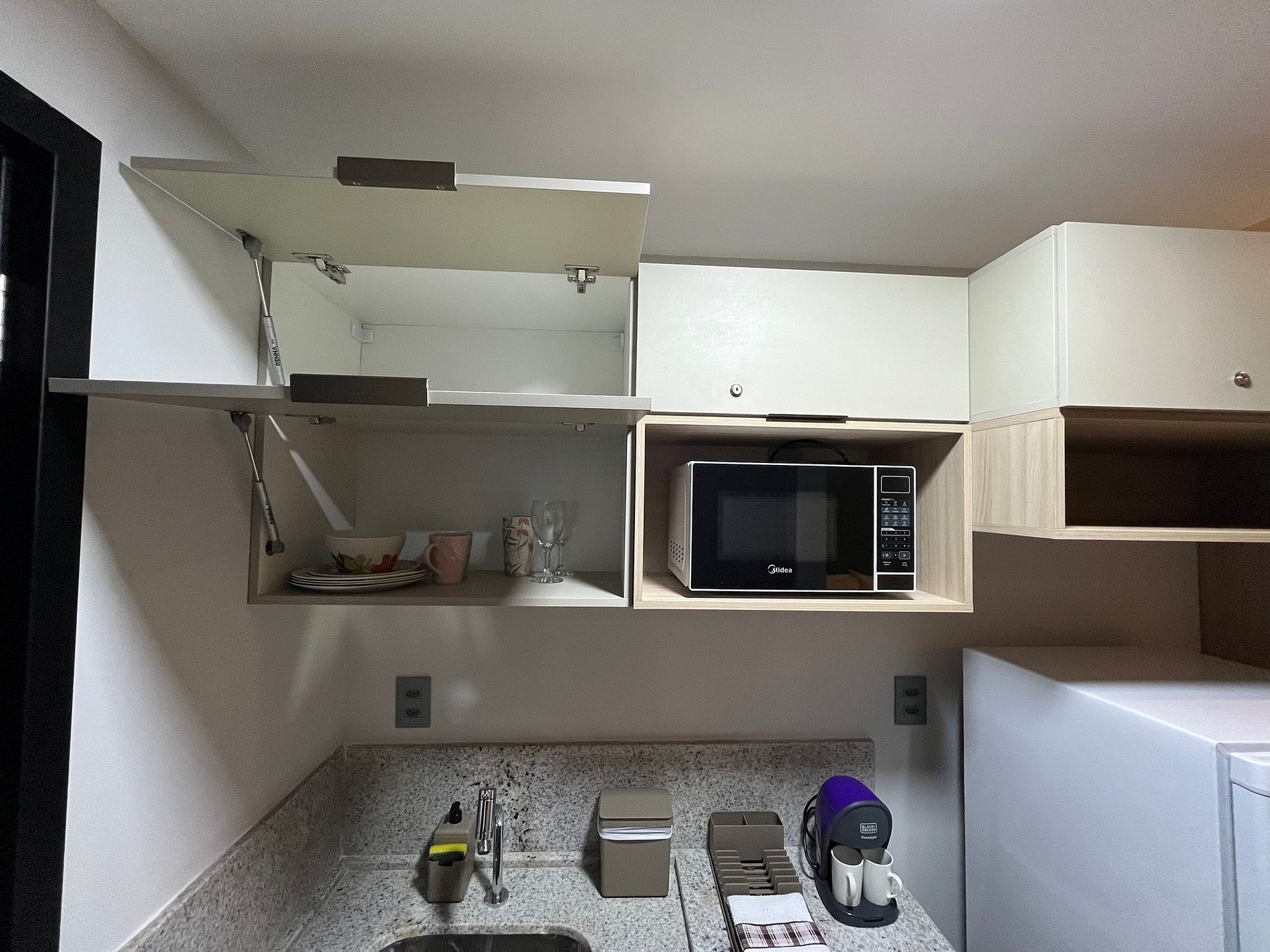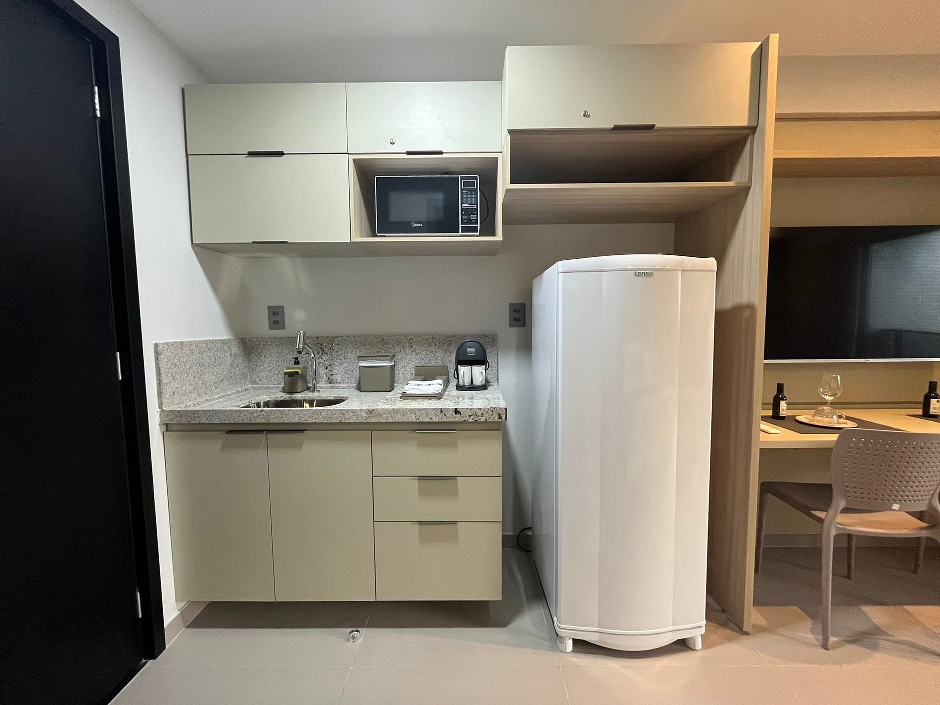 A cozinha é equipada com frigobar, fogão de mesa, microondas, liquidificador, sanduicheira, chaleira elétrica e utensílios essenciais para preparar refeições rápidas com toda a comodidade.