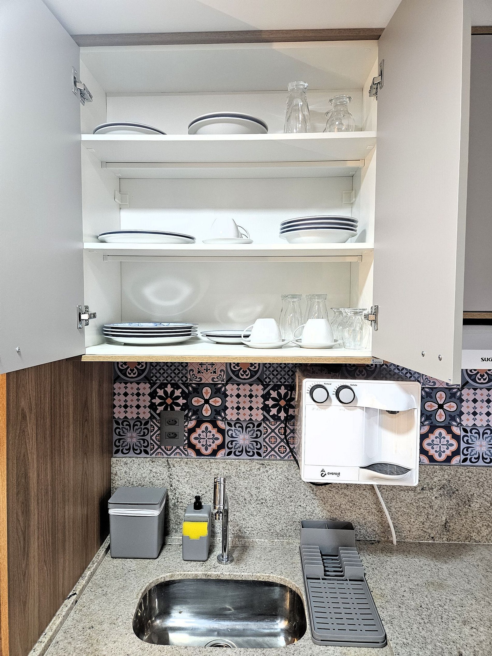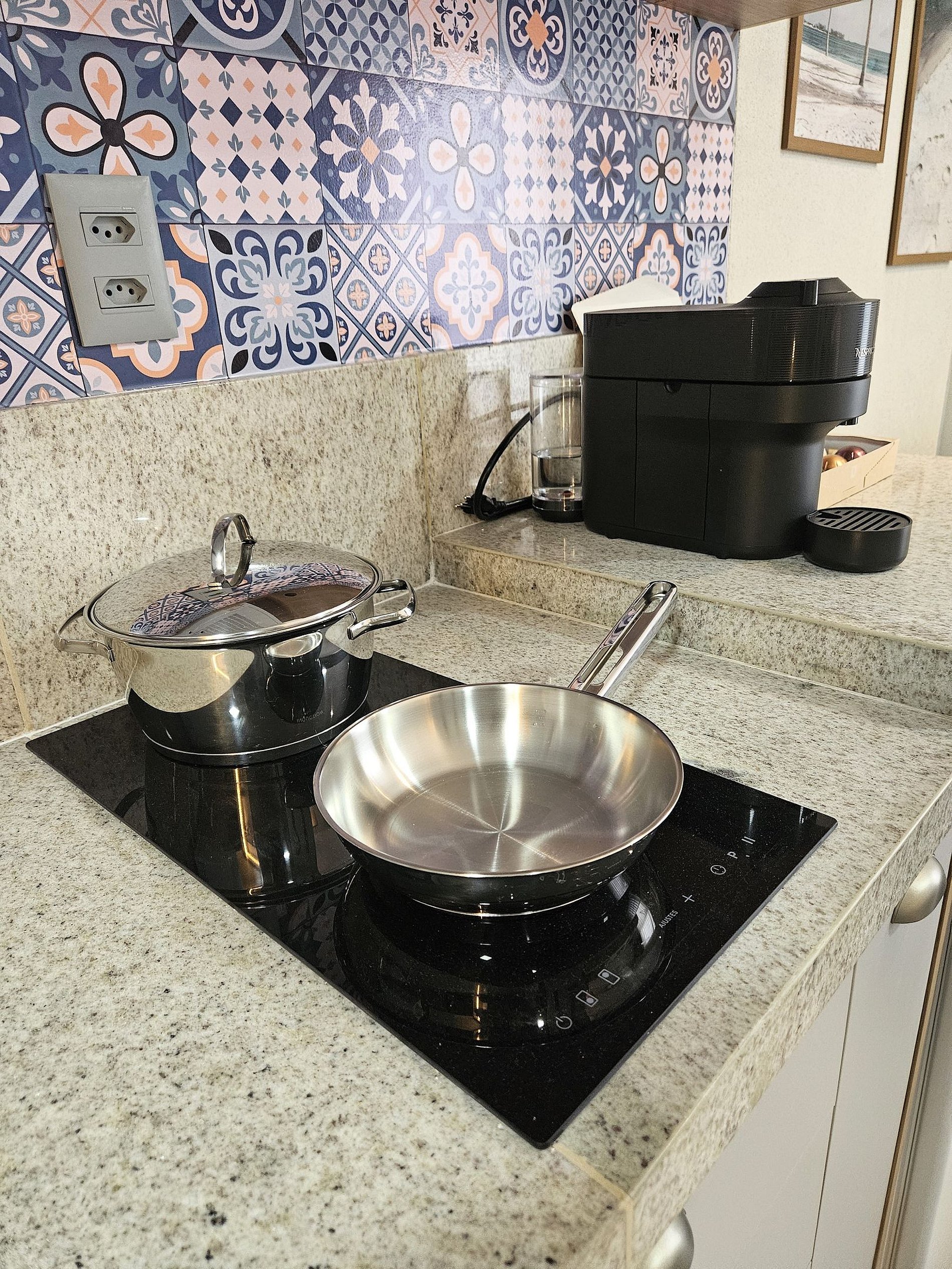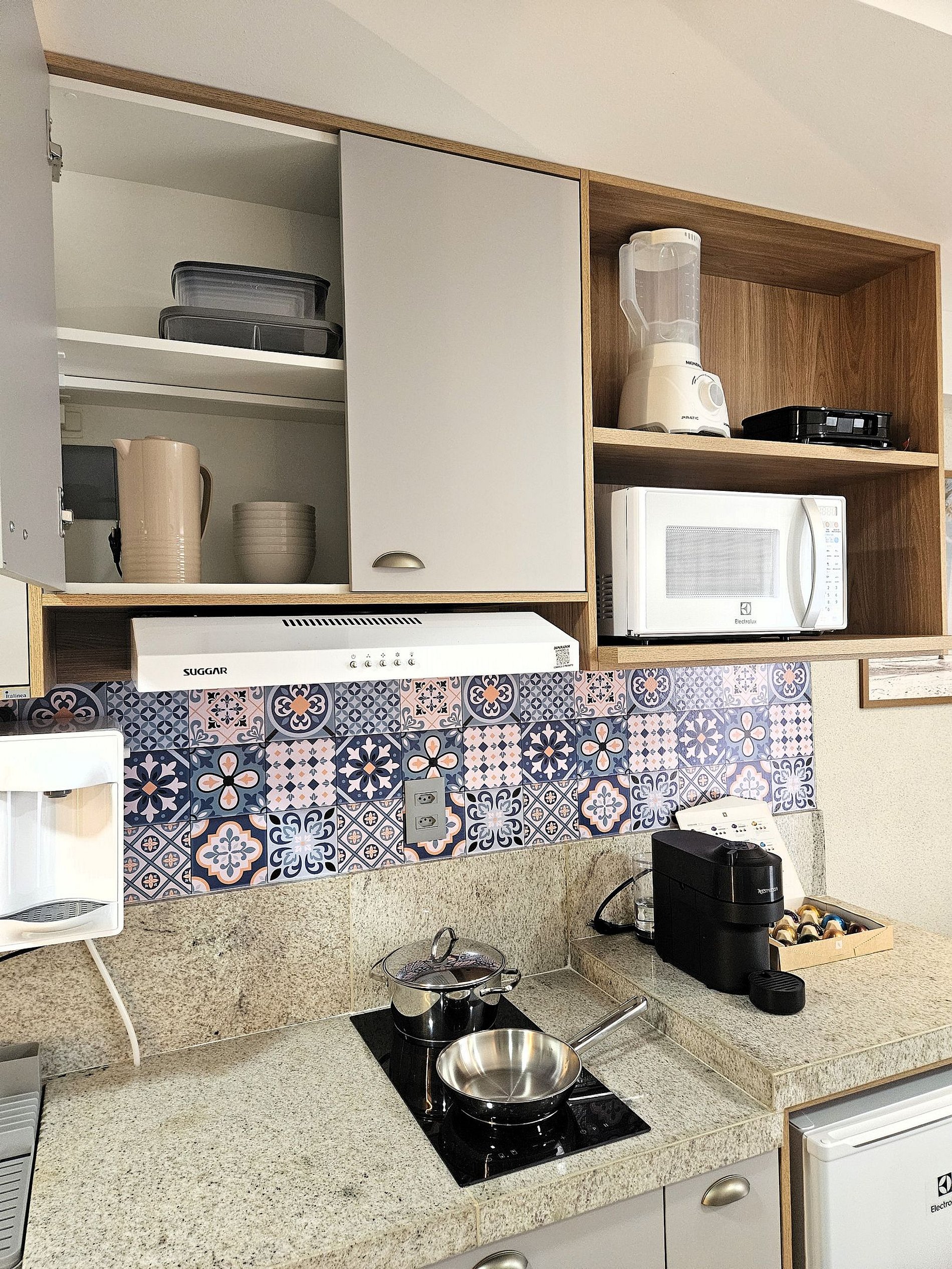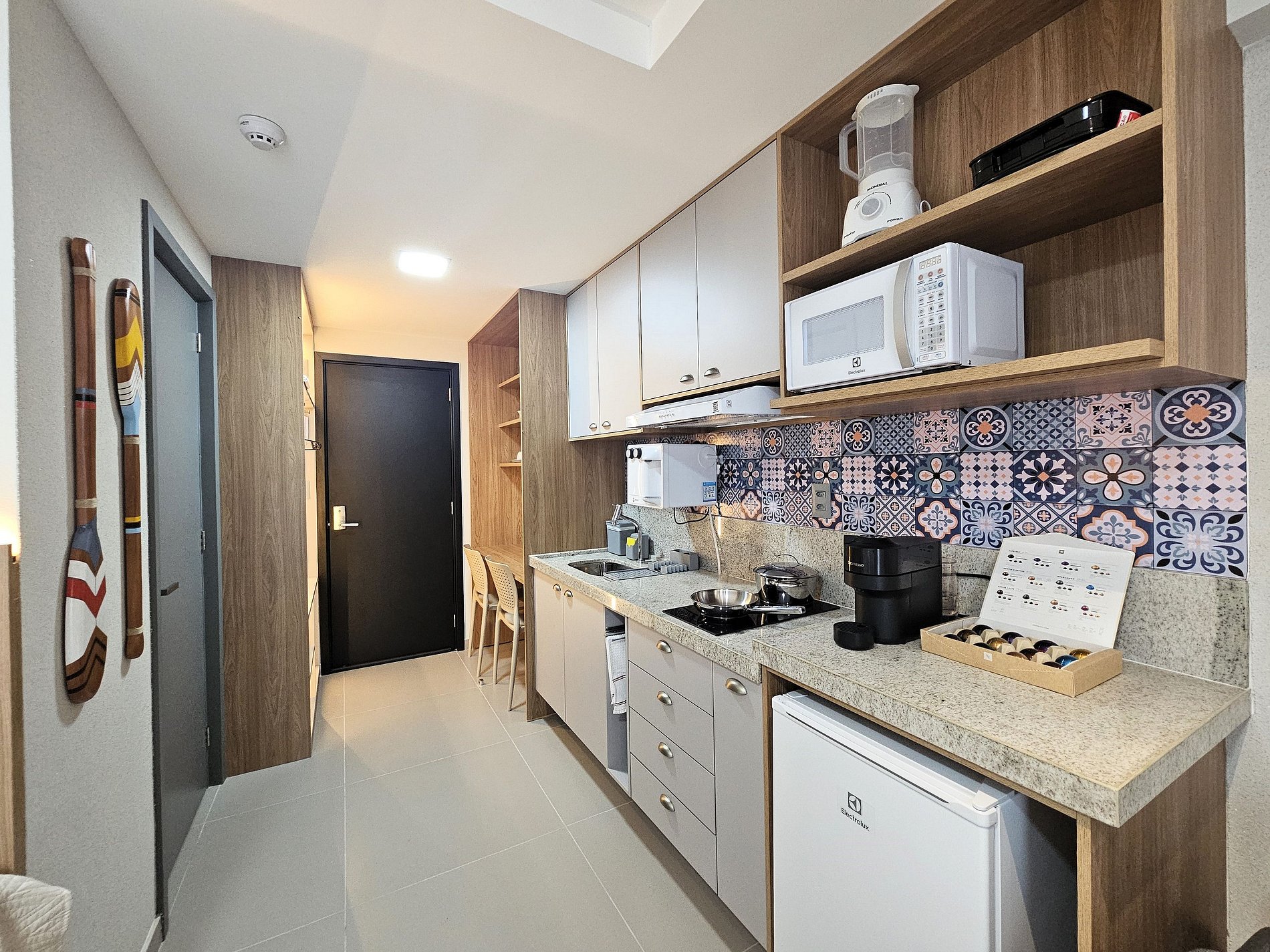 A cozinha é equipada com frigobar, máquina de café Nespresso, micro-ondas, liquidificador, sanduicheira e utensílios para preparar refeições rápidas com toda comodidade.