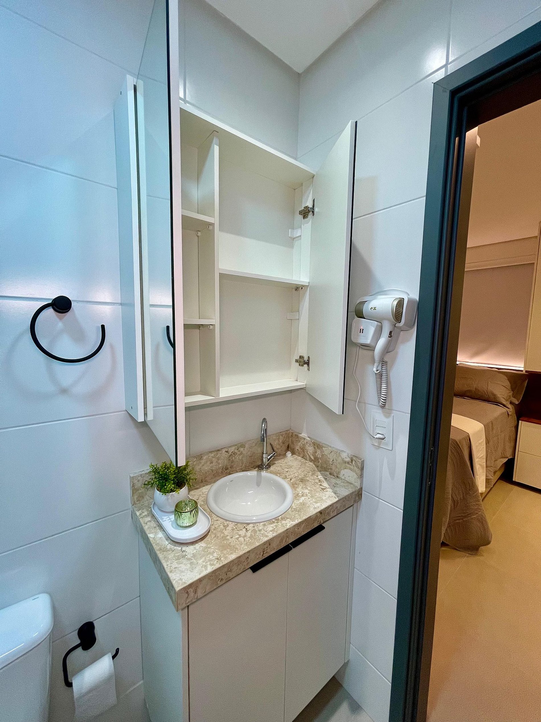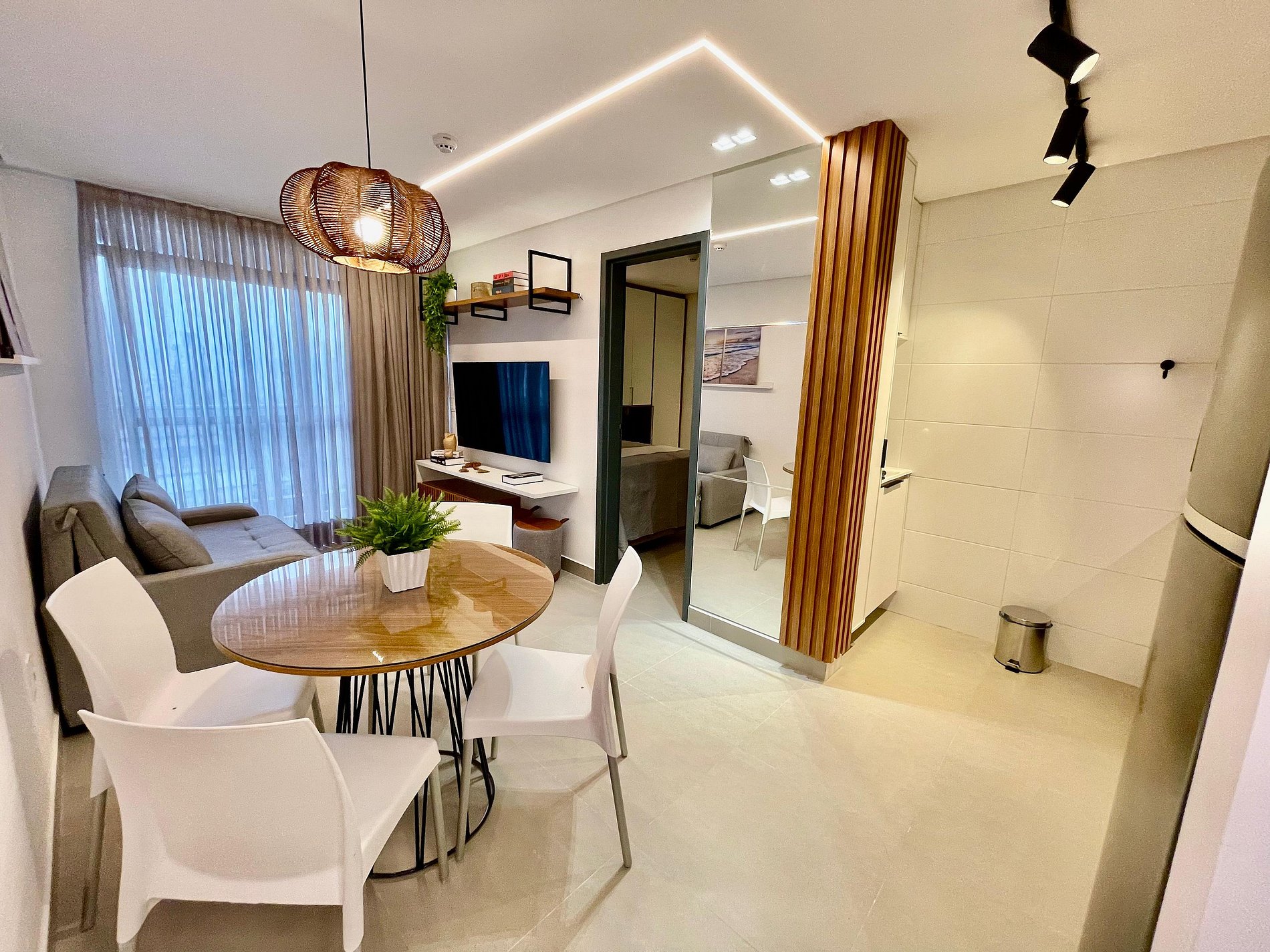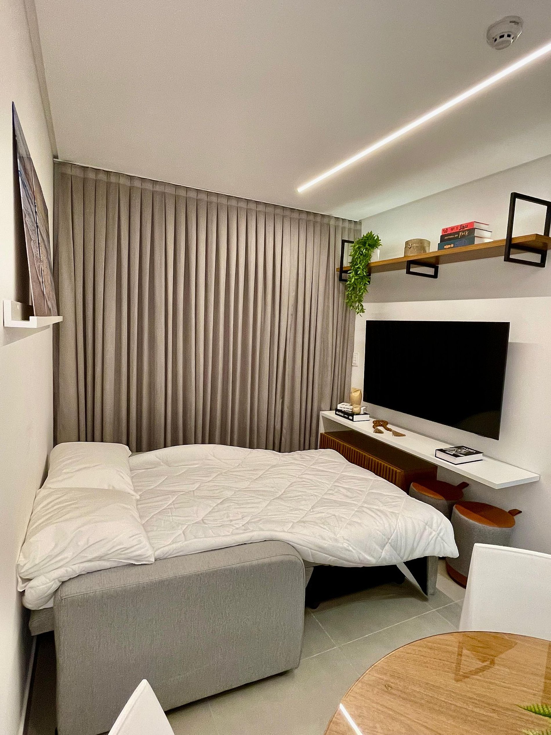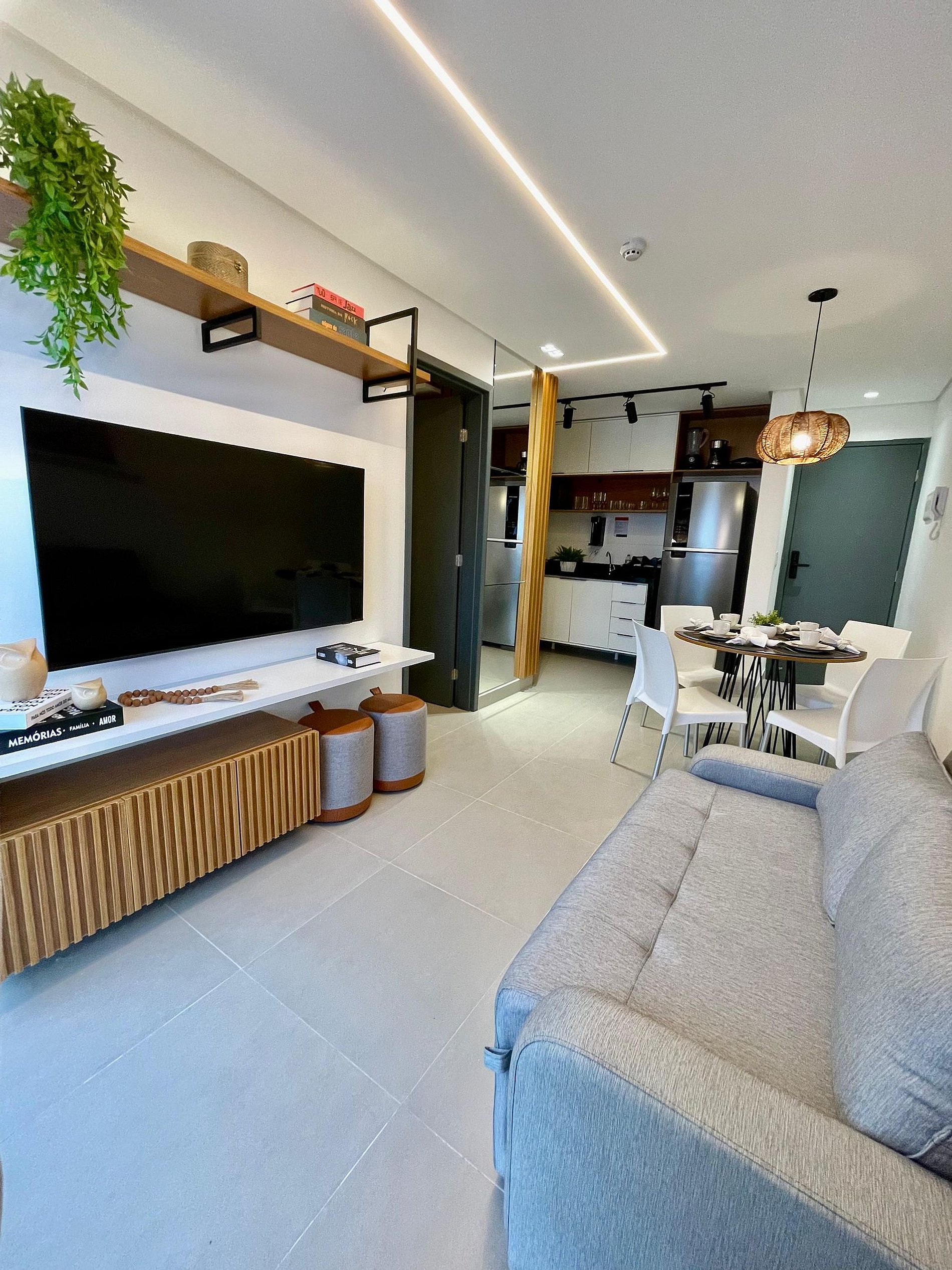 No quarto a cama tem tamanho casal com cama de solteiro auxiliar, guarda-roupa, ar-condicionado, TV 32" e ventilador. A sala conta com uma Smart TV de 42’’ e um confortável sofá-cama, ideal para acomodar até duas pessoas extras. O ambiente se integra à varanda, perfeita para relaxar e apreciar a vista do bairro e do mar.