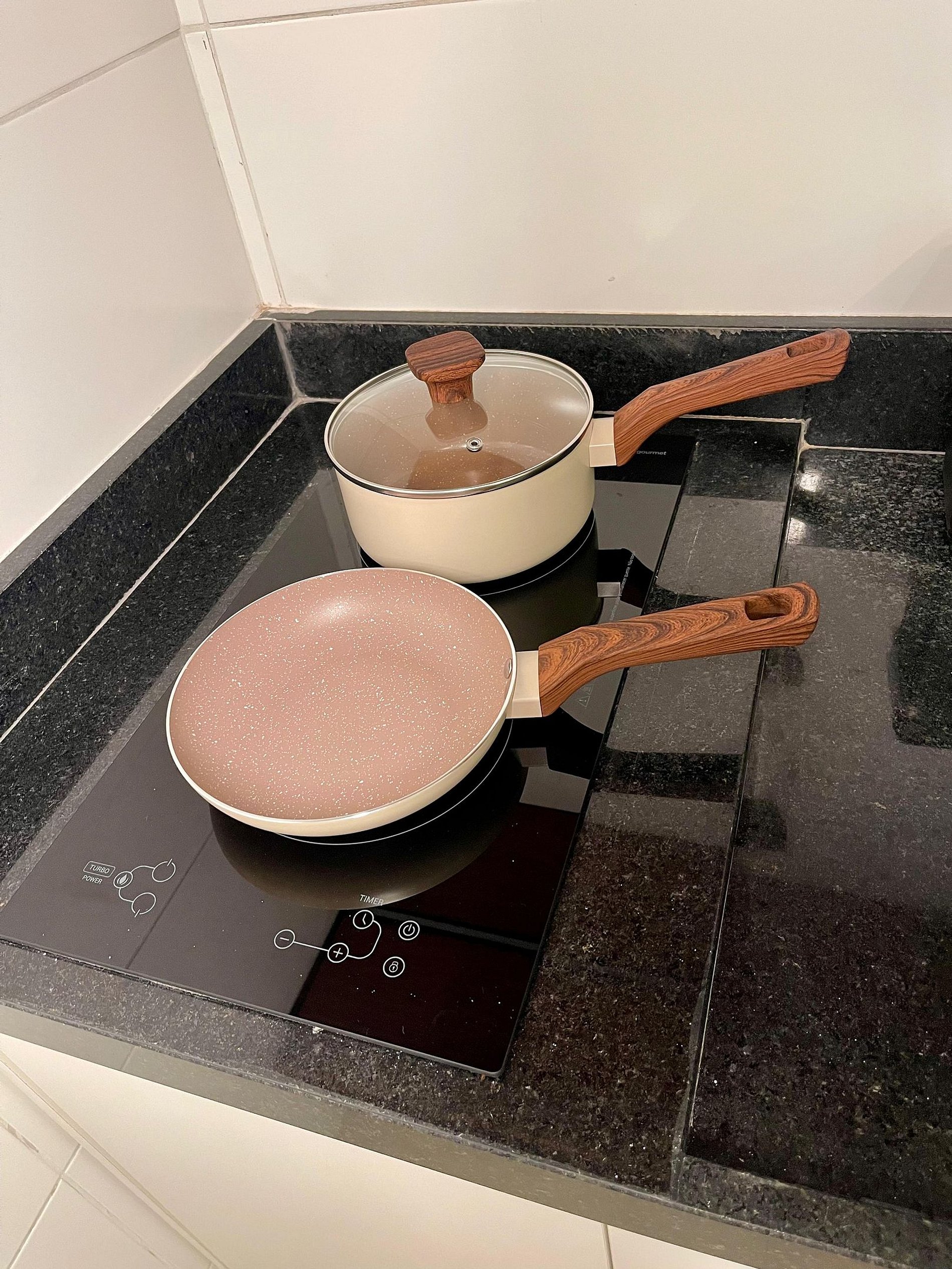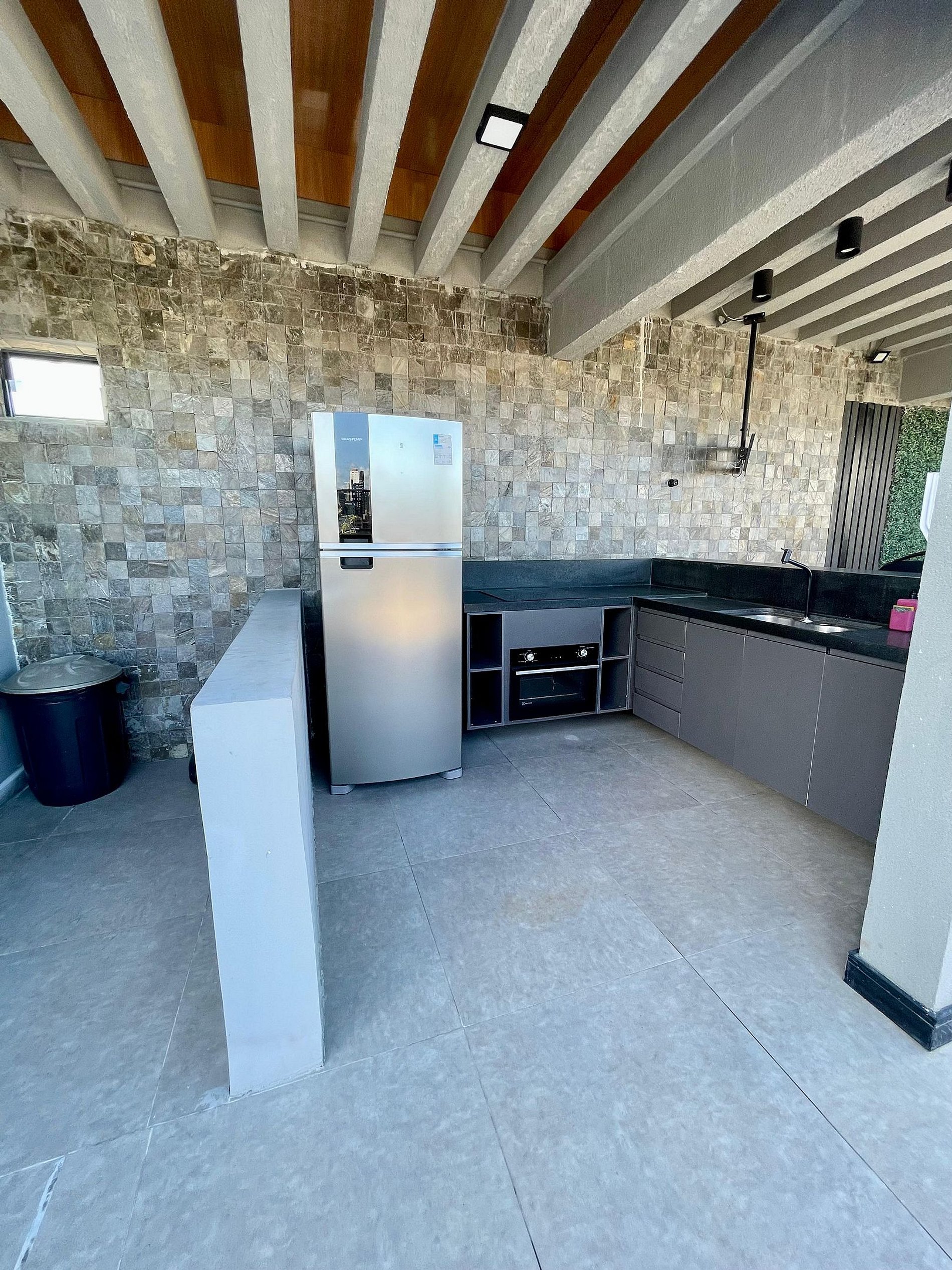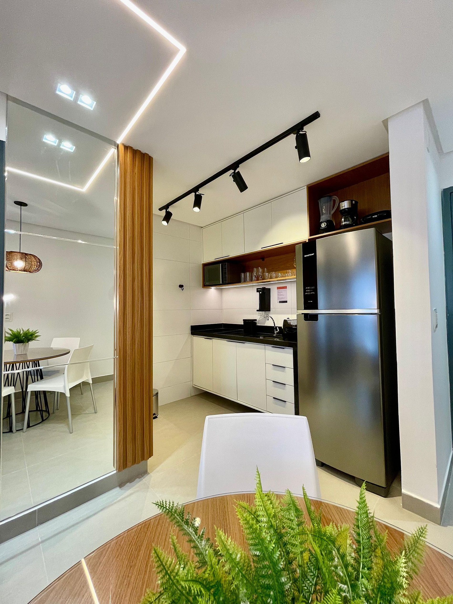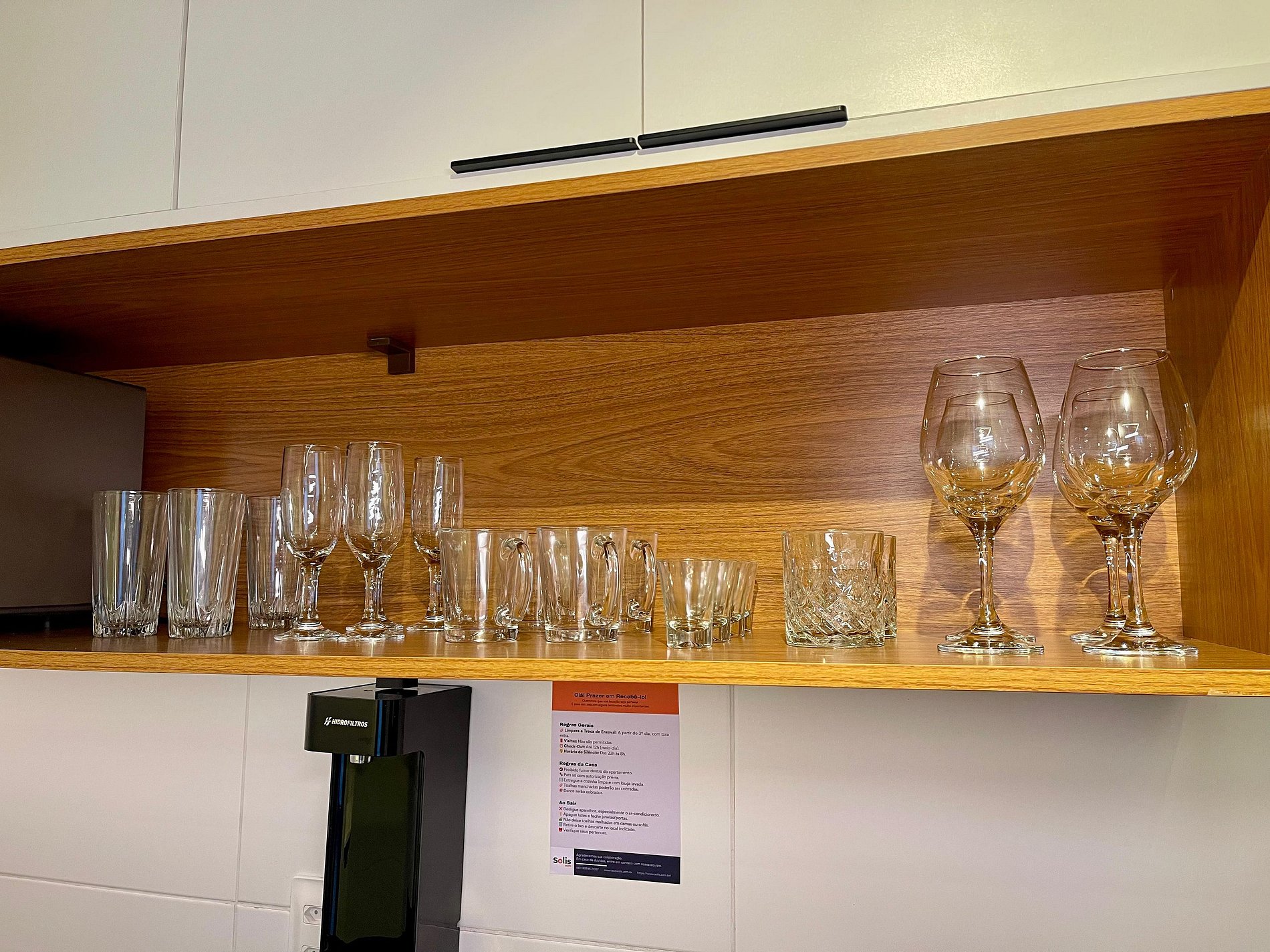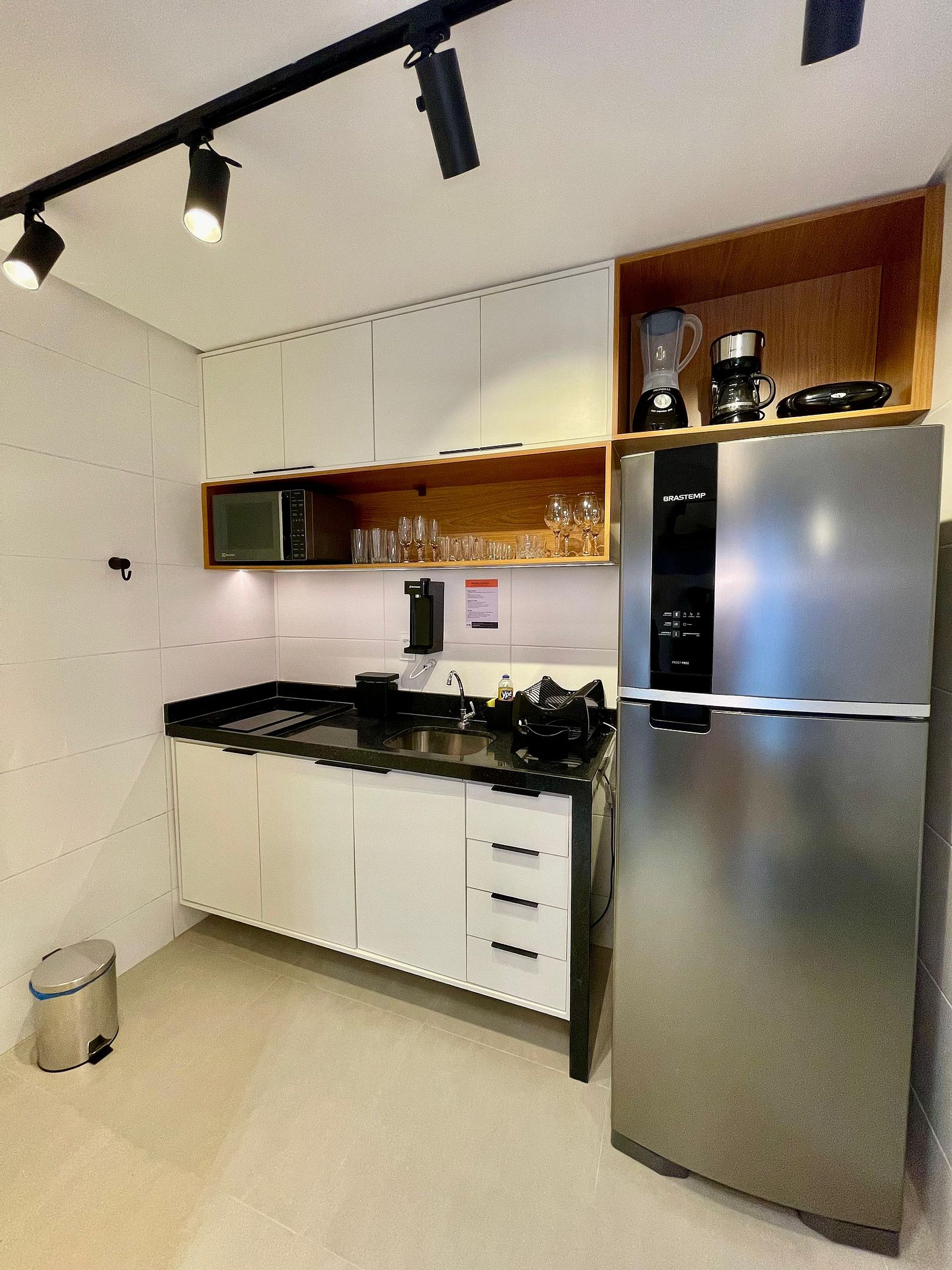 A cozinha inclui geladeira, filtro de água, micro-ondas, cafeteira, liquidificador, sanduicheira e utensílios para preparar refeições rápidas com toda comodidade.