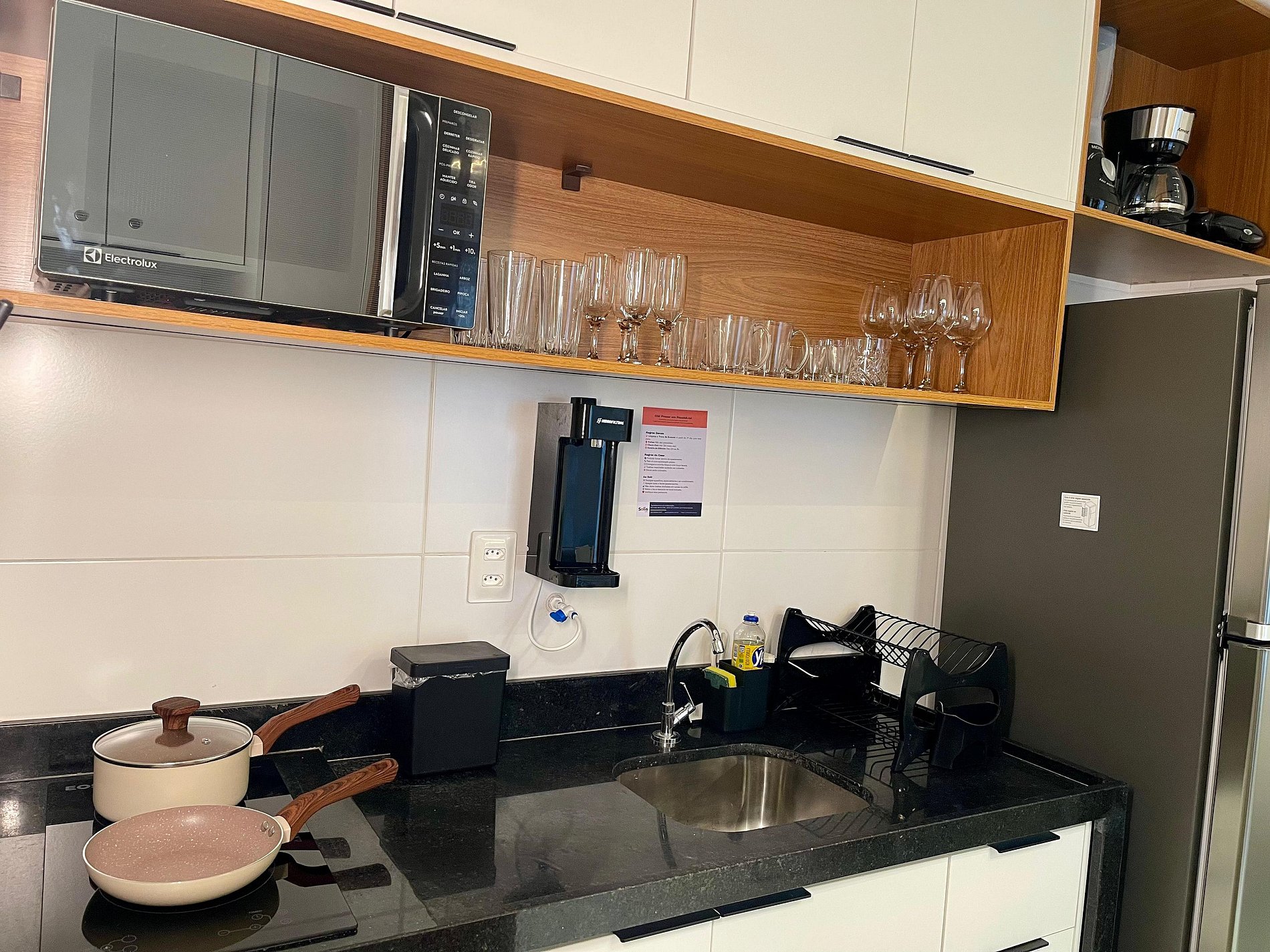 A cozinha inclui geladeira, filtro de água, micro-ondas, cafeteira, liquidificador, sanduicheira e utensílios para preparar refeições rápidas com toda comodidade.