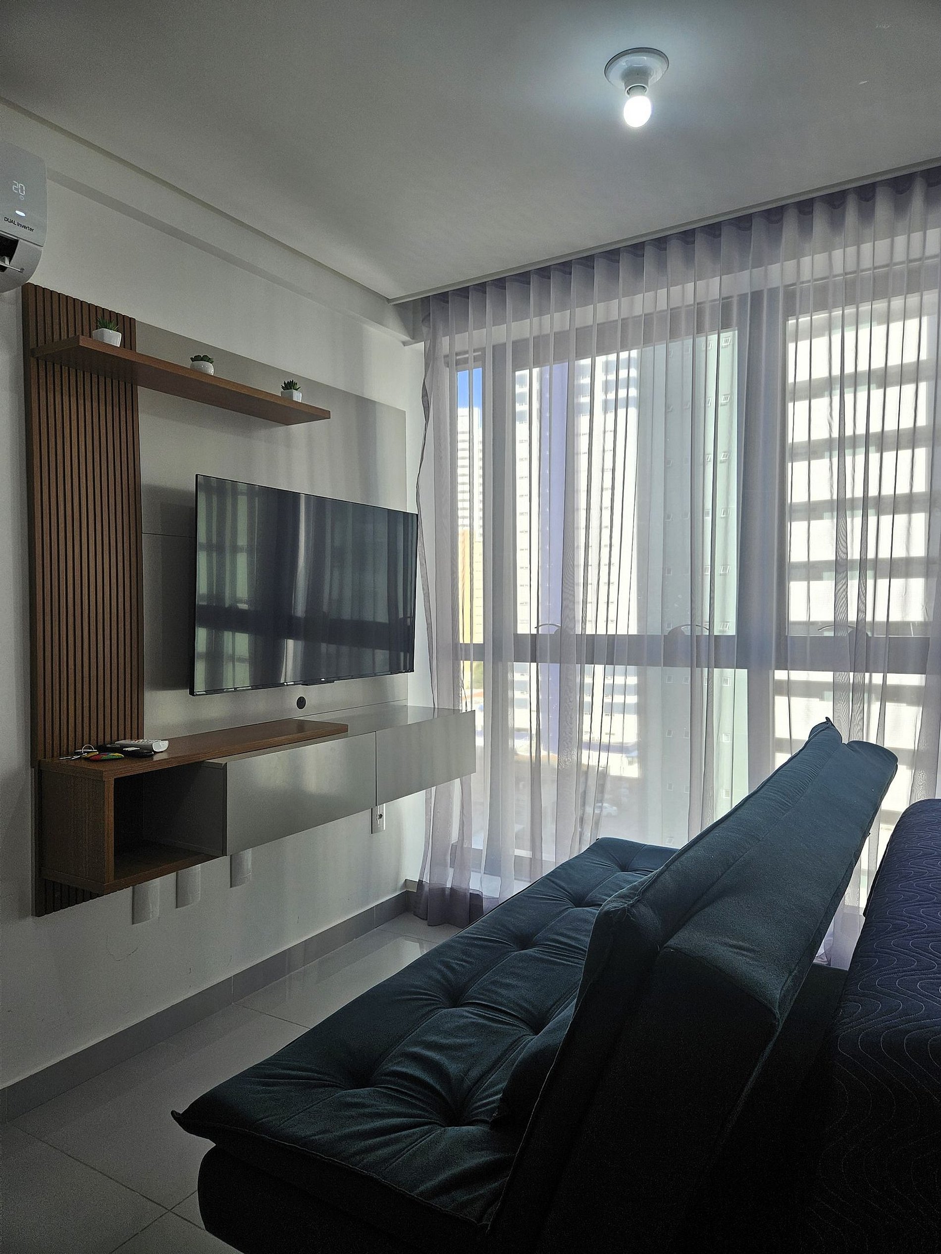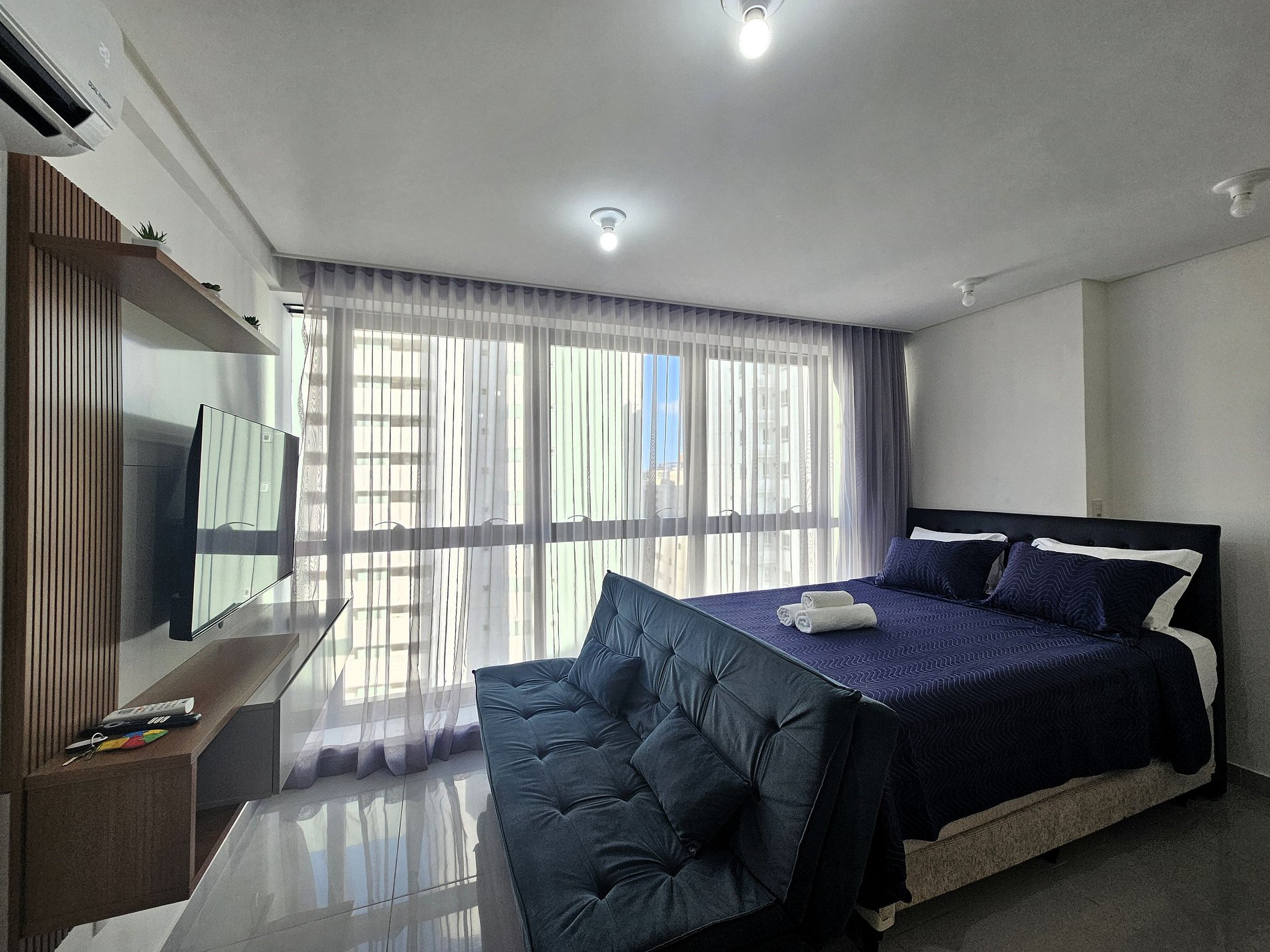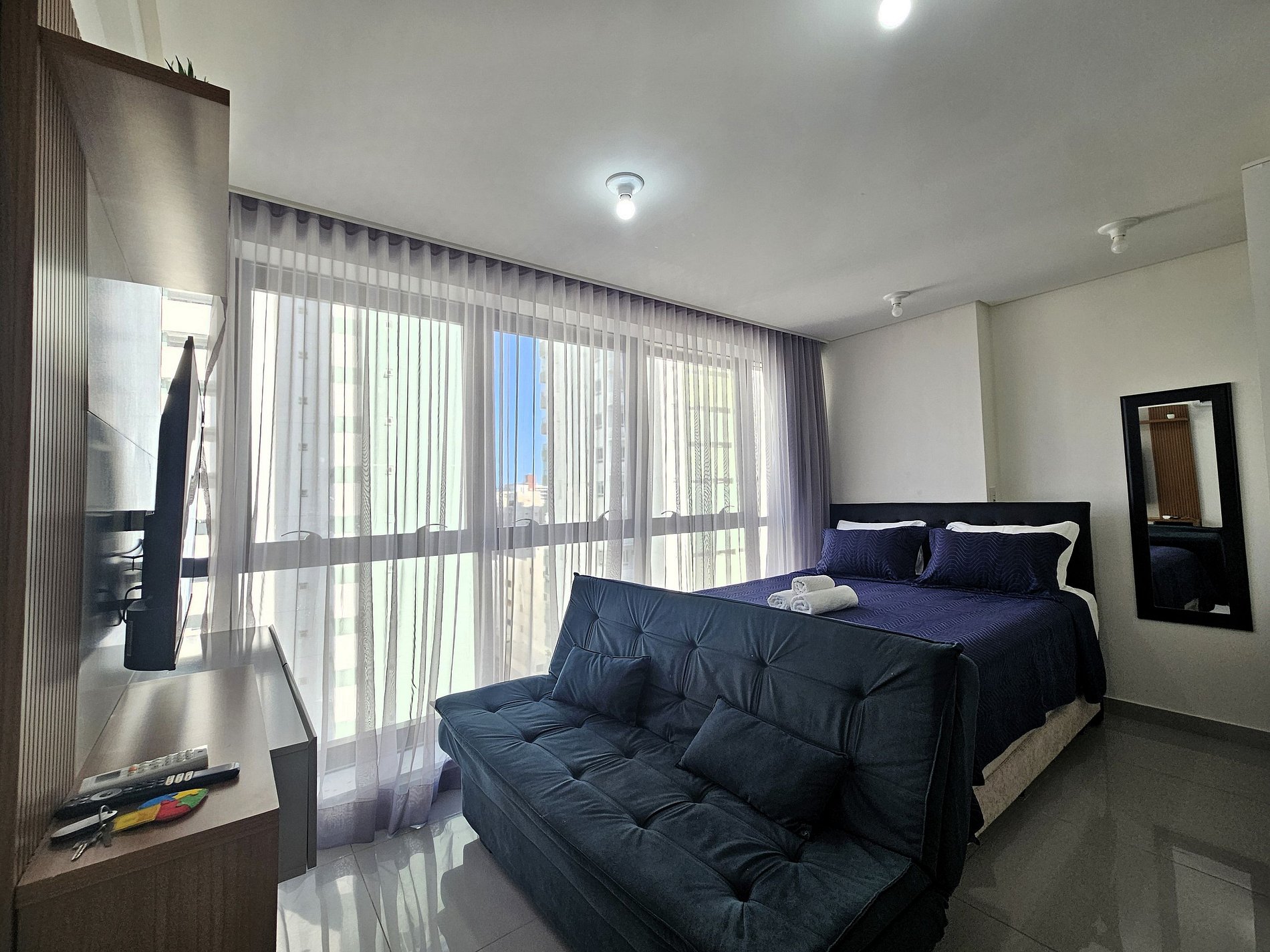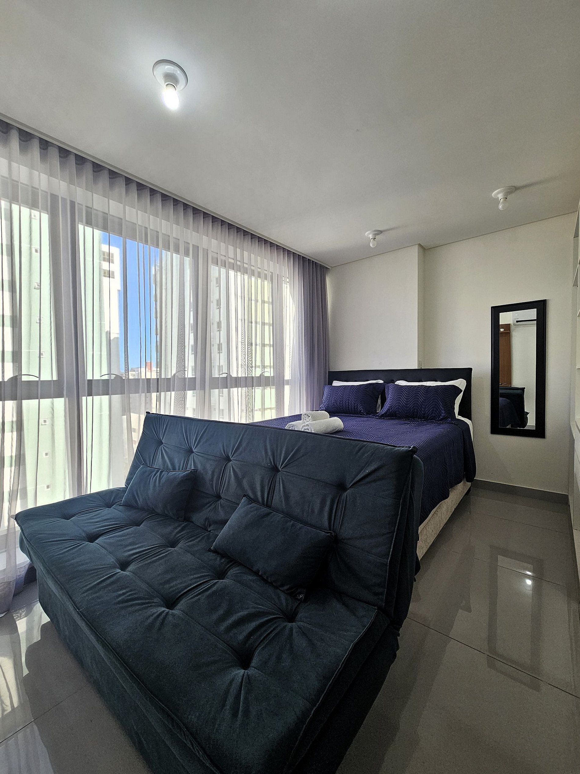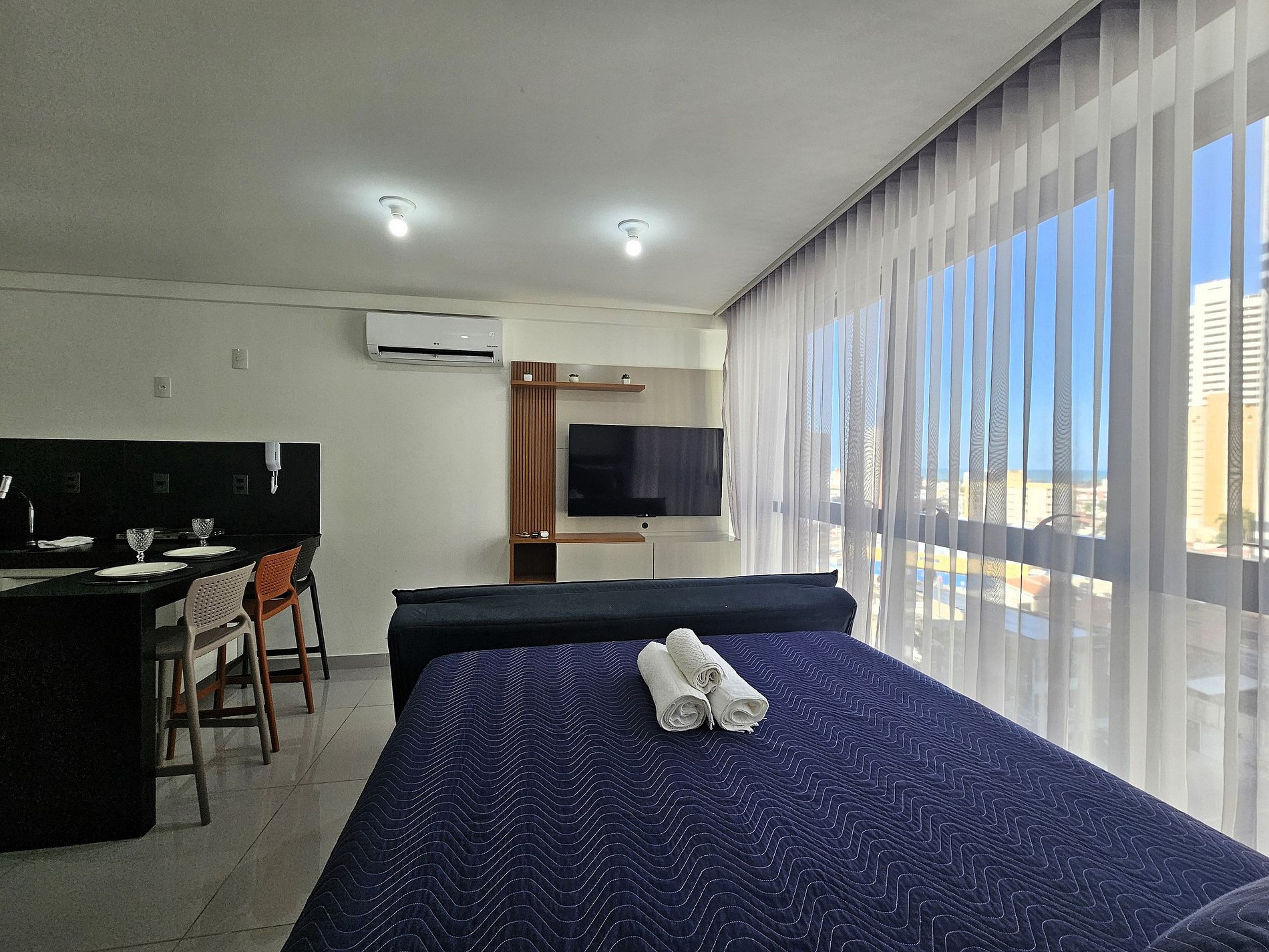 Possui um incrível janelão com vista para a cidade. A cama tem tamanho Queen e possui ainda sofá-cama para acomodar mais duas pessoas. Equipado com Smart TV 43", ar-condicionado, armário para roupas, banheiro.