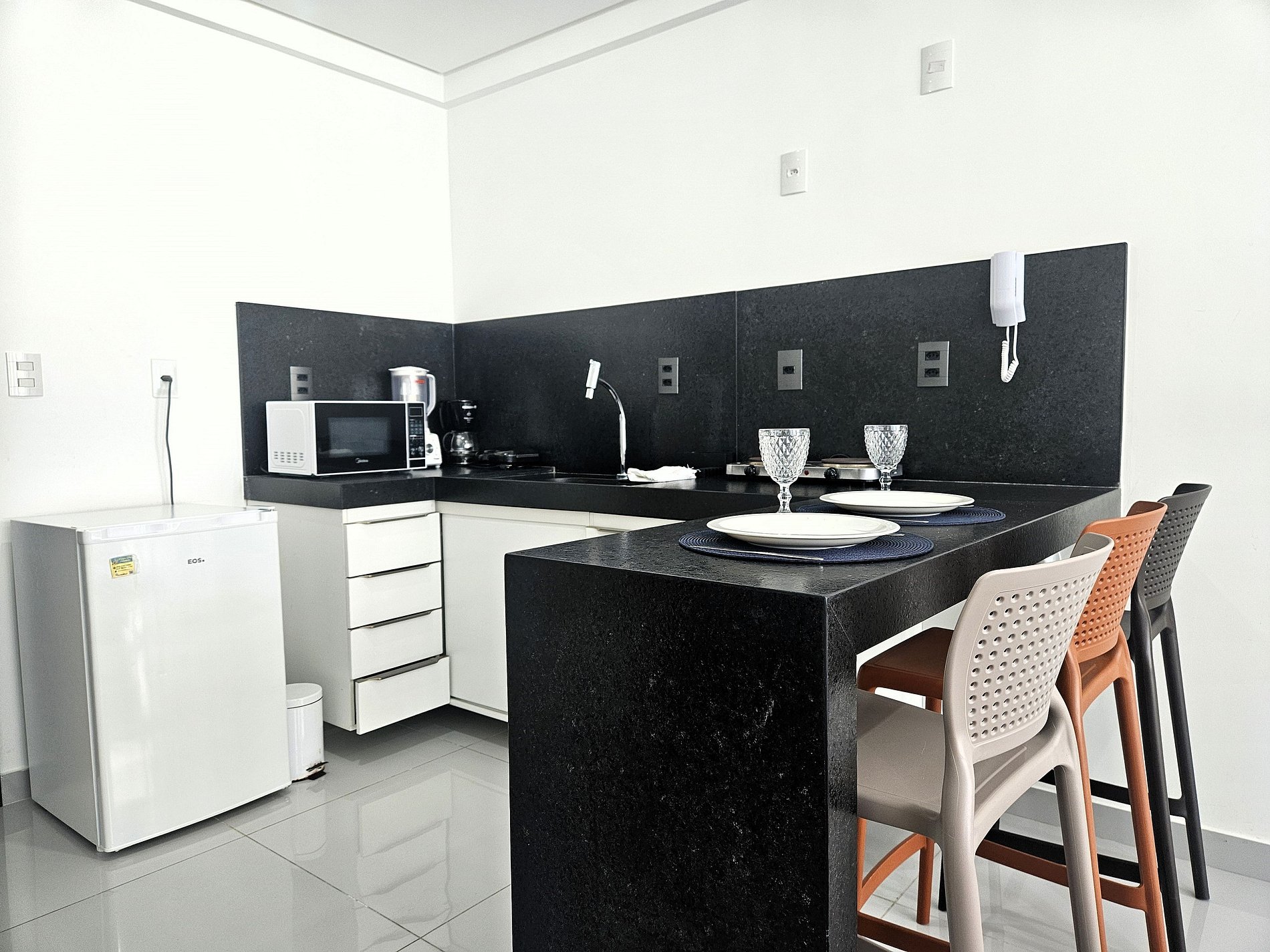 A cozinha inclui frigobar, cafeteira, micro-ondas, liquidificador, sanduicheira e utensílios para preparar refeições rápidas com toda comodidade.