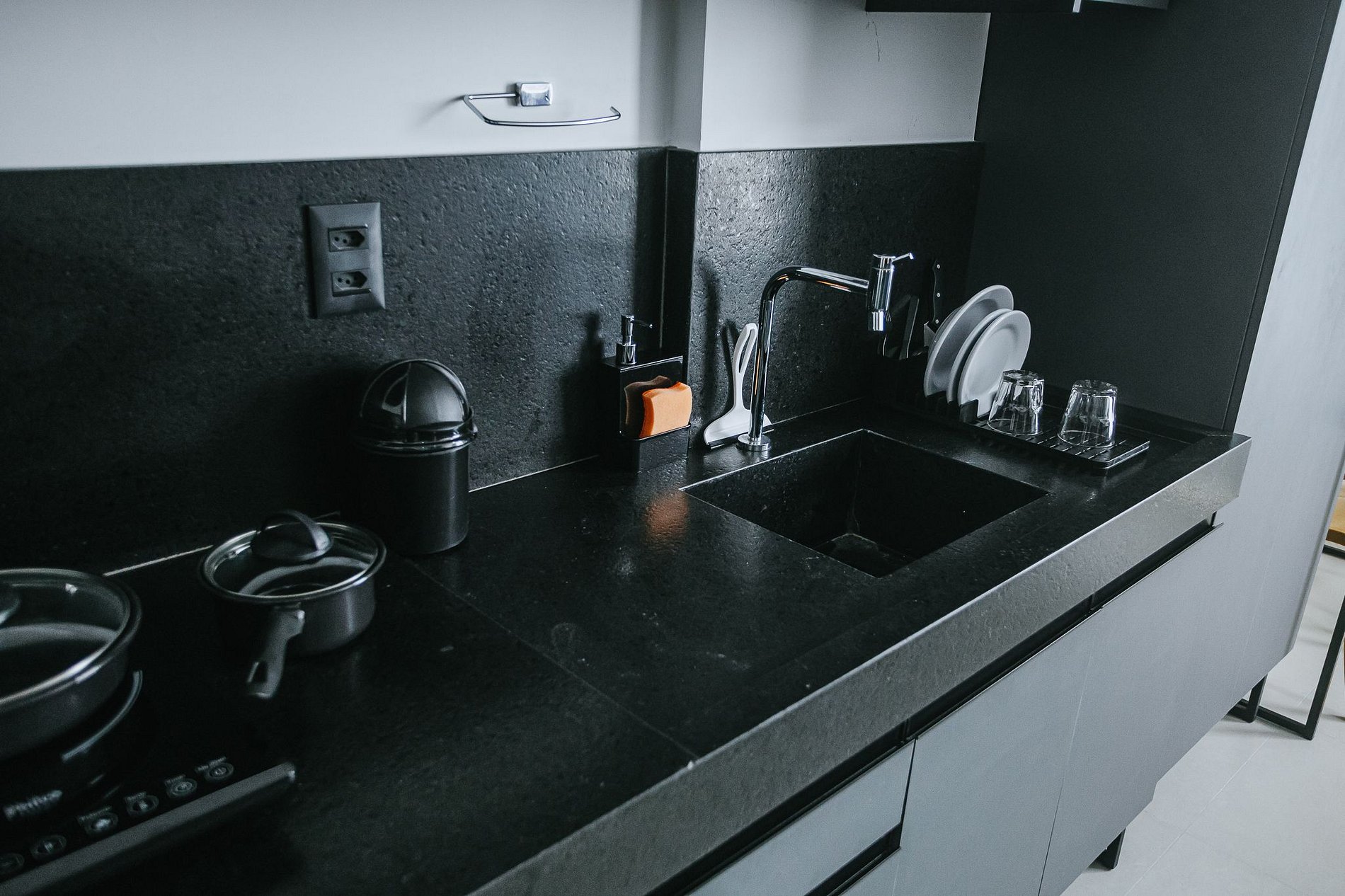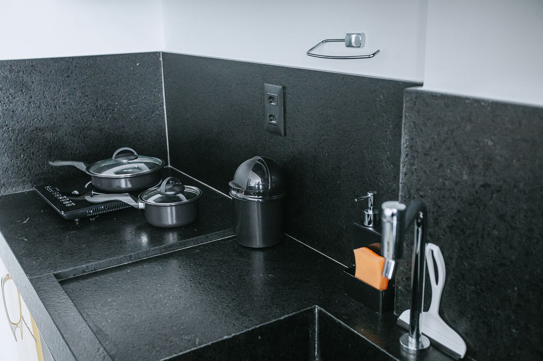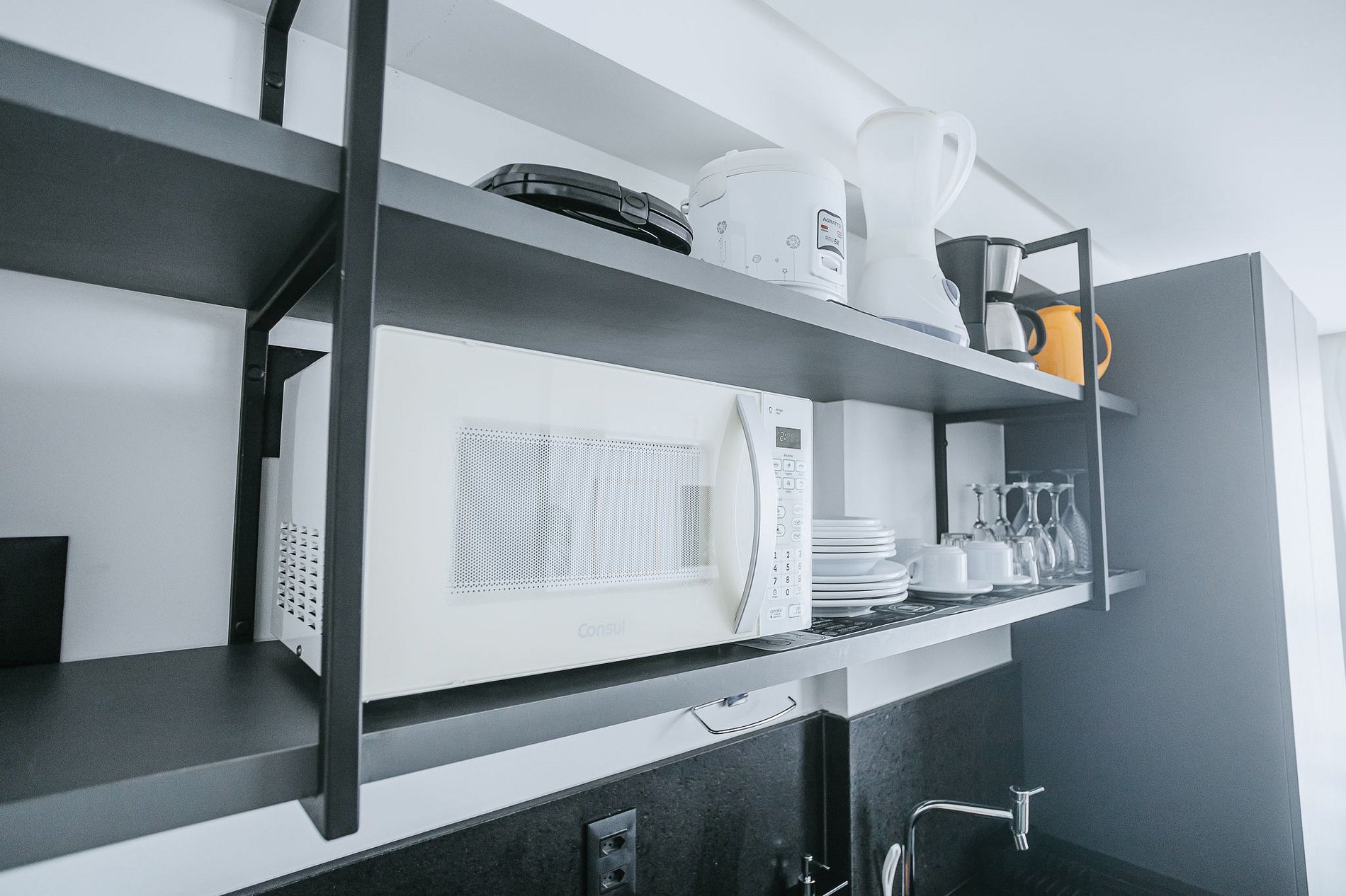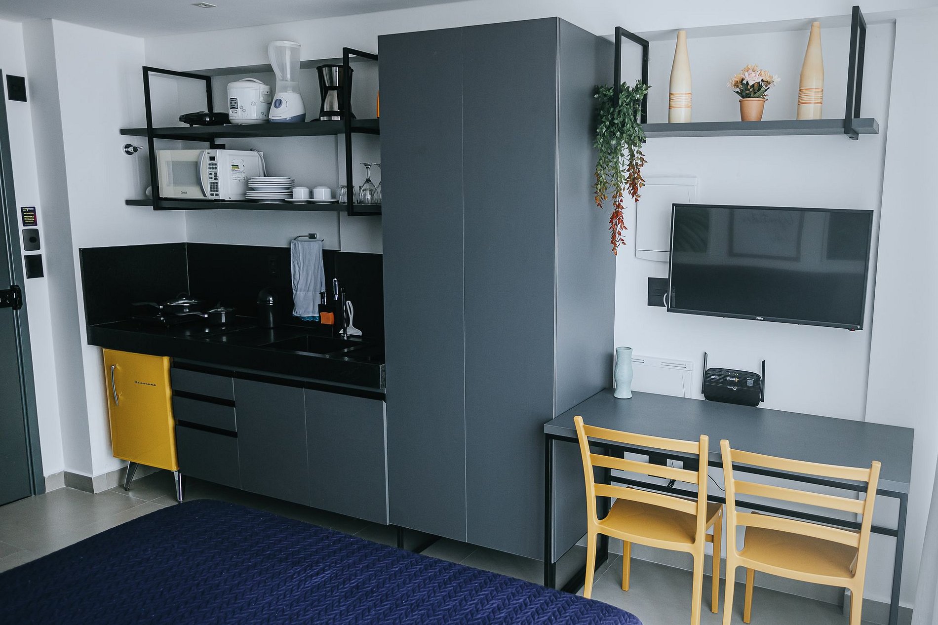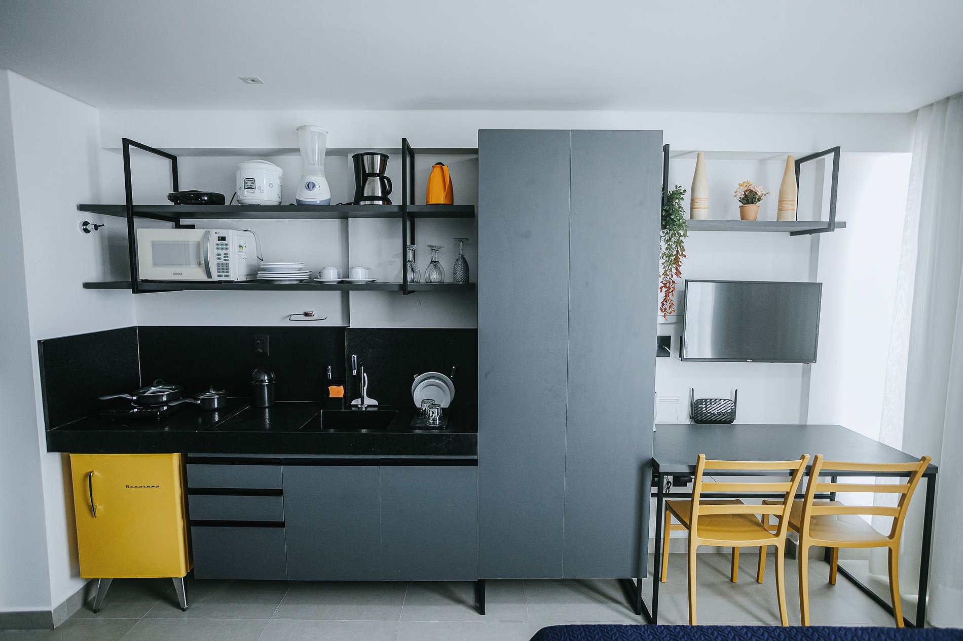 A cozinha do flat é equipada, ideal para preparar refeições rápidas com praticidade e conforto.