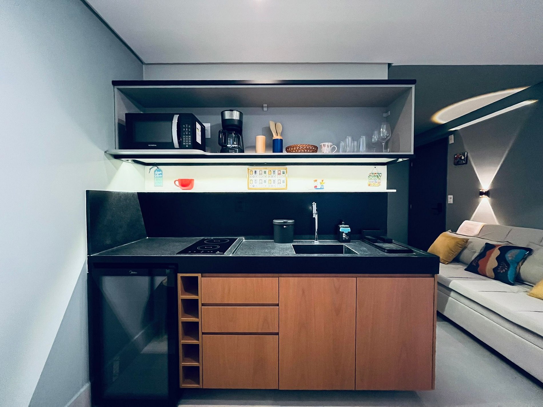 A cozinha é equipada com frigobar, sanduicheira, microondas, cafeteira, fogão elétrico e utensílios essenciais para preparar refeições rápidas com toda a comodidade.