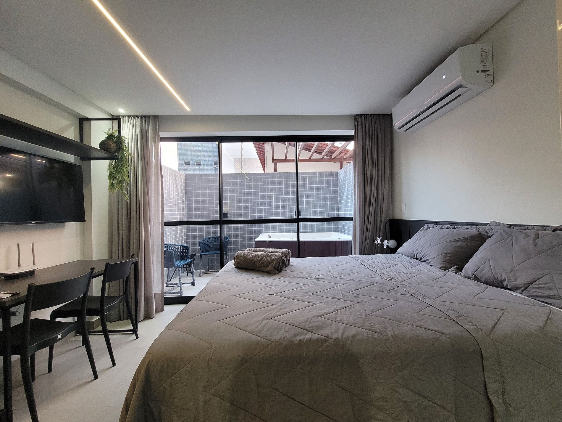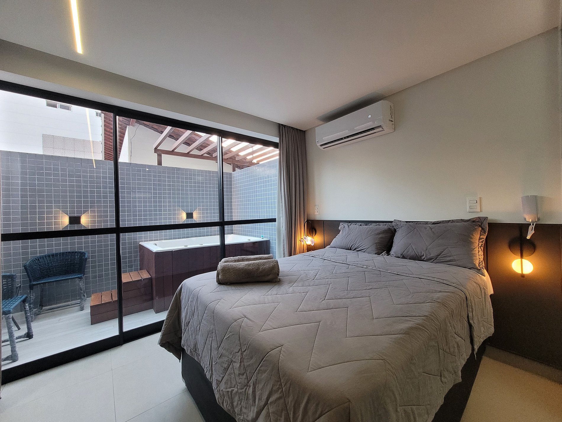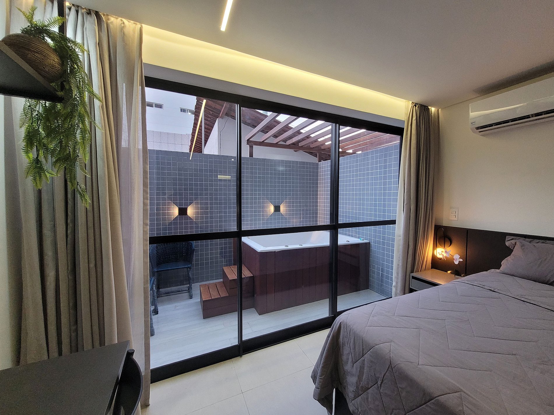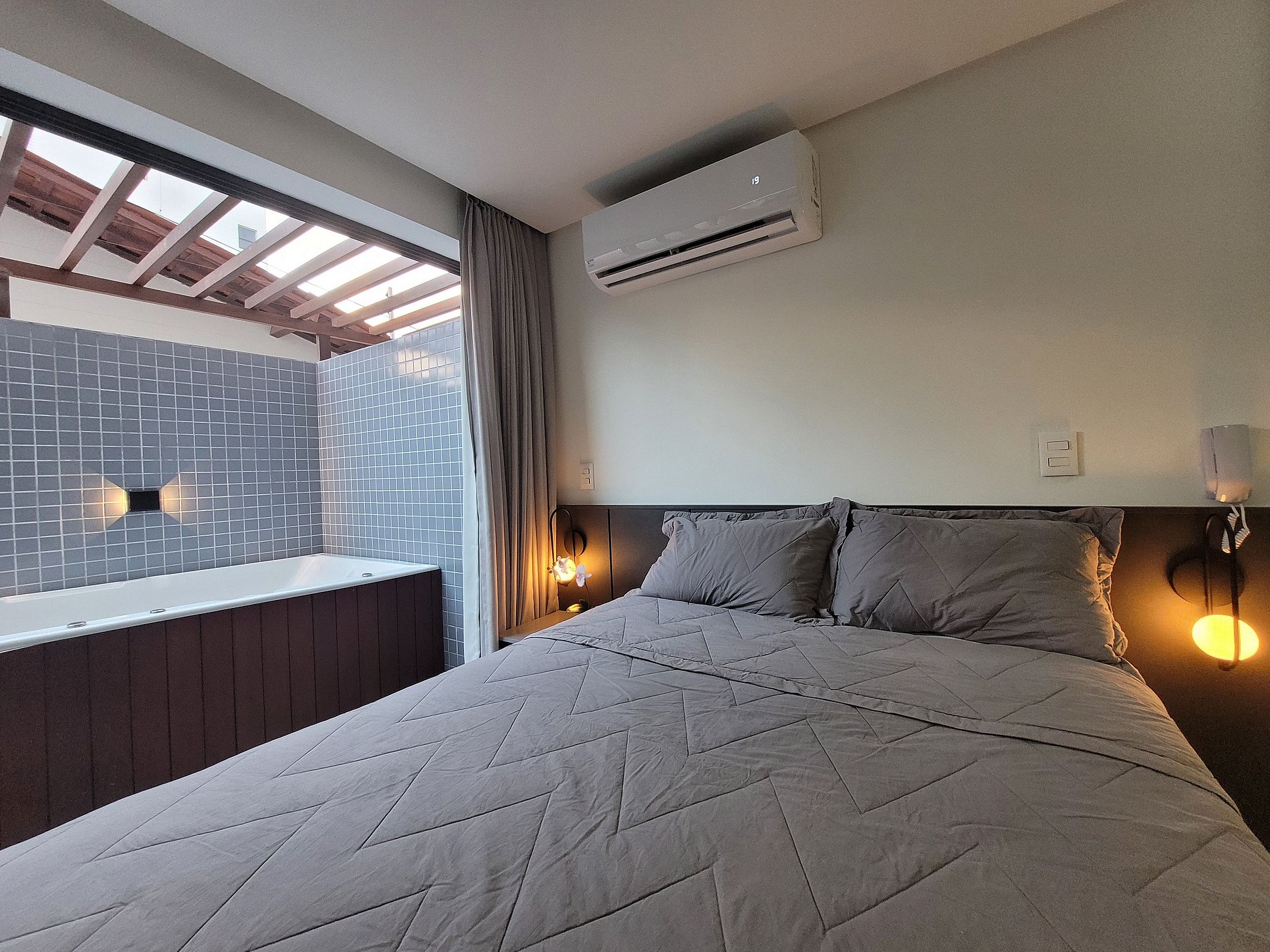 O apartamento dispõe de uma cama de casal, perfeita para casais aproveitarem a hospedagem com conforto total. Conta ainda com TV, ar-condicionado, armário para roupas e banheiro privativo. O espaço externo charmoso oferece momentos de relaxamento e acesso à Jacuzzi.