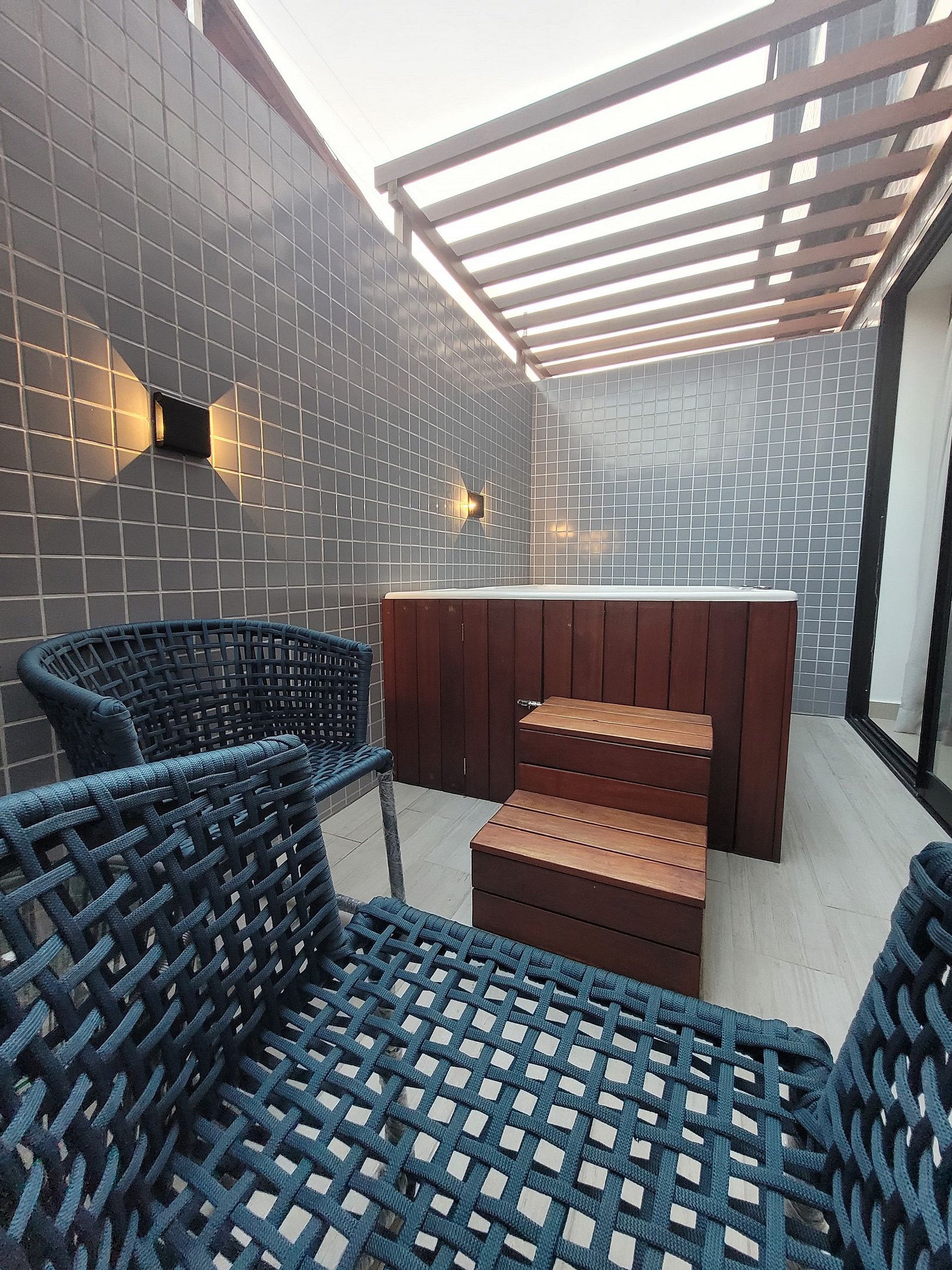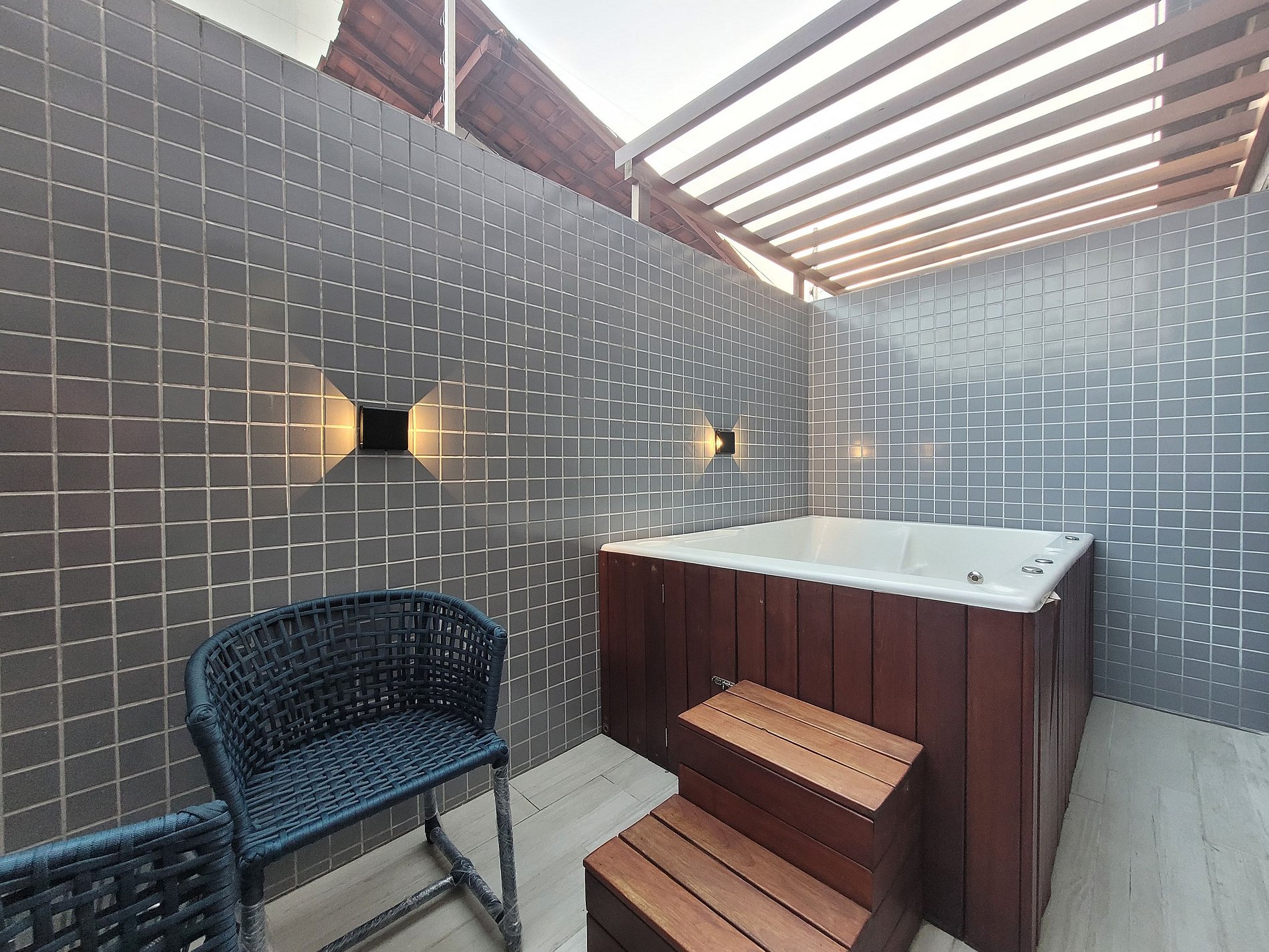 A Jacuzzi está posicionada em uma área externa, separada do quarto, sem sistema de aquecimento.