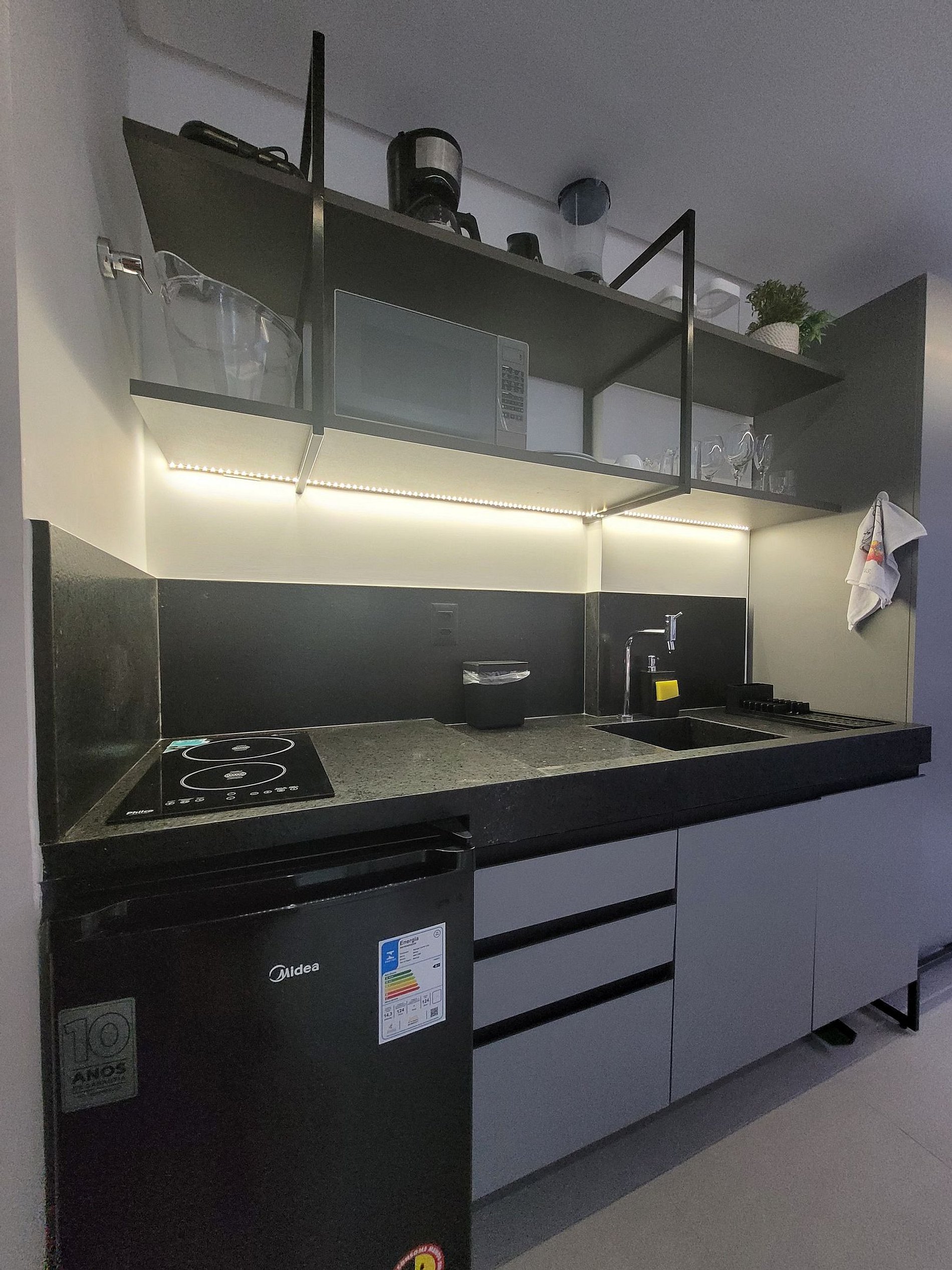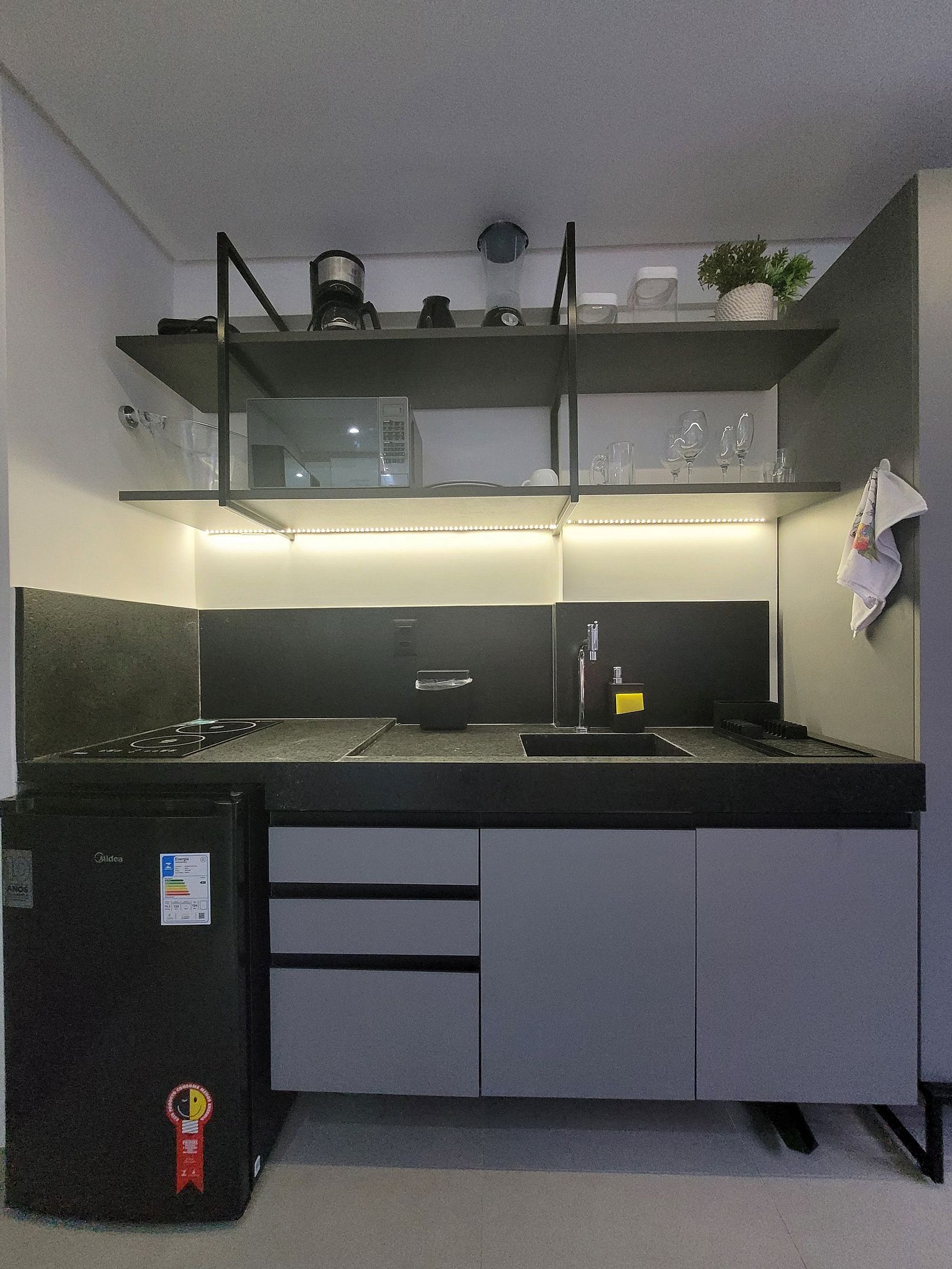 A cozinha é equipada com frigobar, cooktop, micro-ondas, liquidificador, cafeteira e todos os utensílios básicos, ideal para preparar refeições rápidas com praticidade.