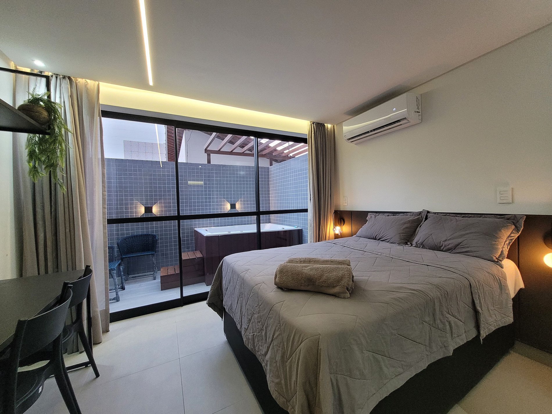 O apartamento dispõe de uma cama de casal, perfeita para casais aproveitarem a hospedagem com conforto total. Conta ainda com TV, ar-condicionado, armário para roupas e banheiro privativo. O espaço externo charmoso oferece momentos de relaxamento e acesso à Jacuzzi.