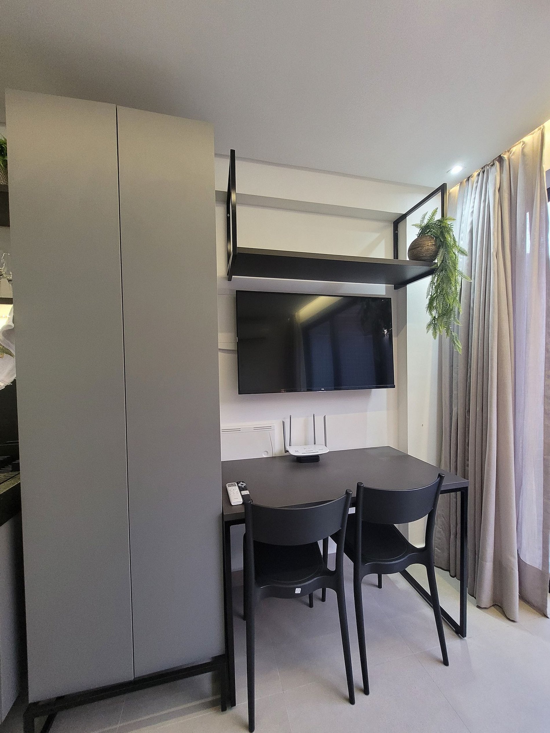 Para quem precisa trabalhar, o flat possui internet cabeada de alta velocidade, garantindo conexão confiável.