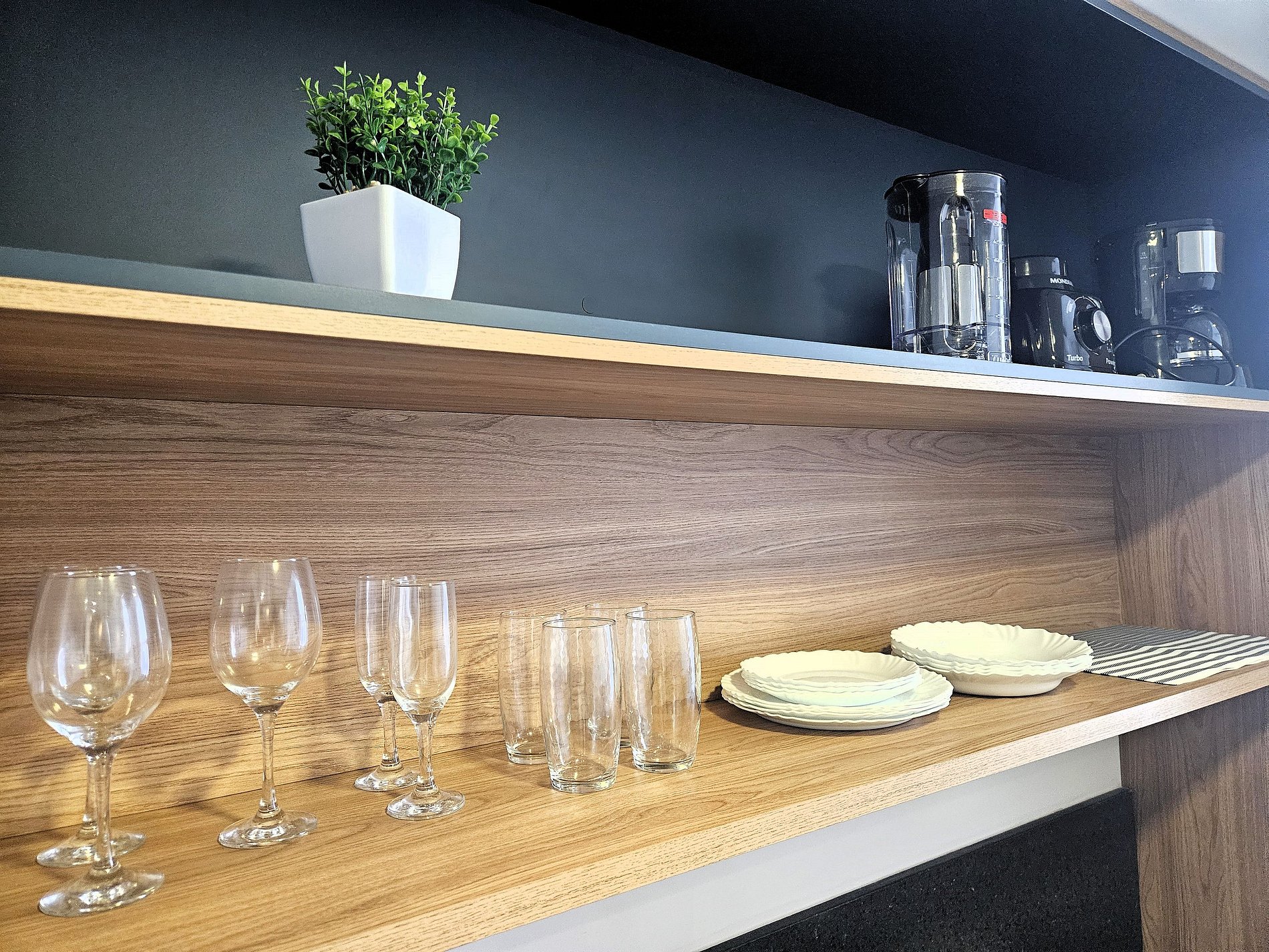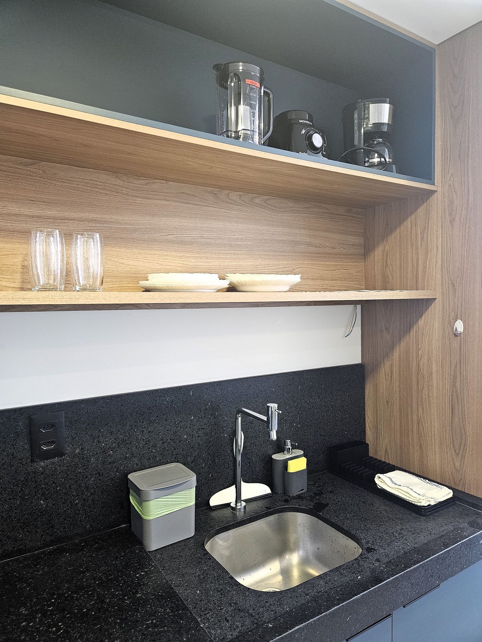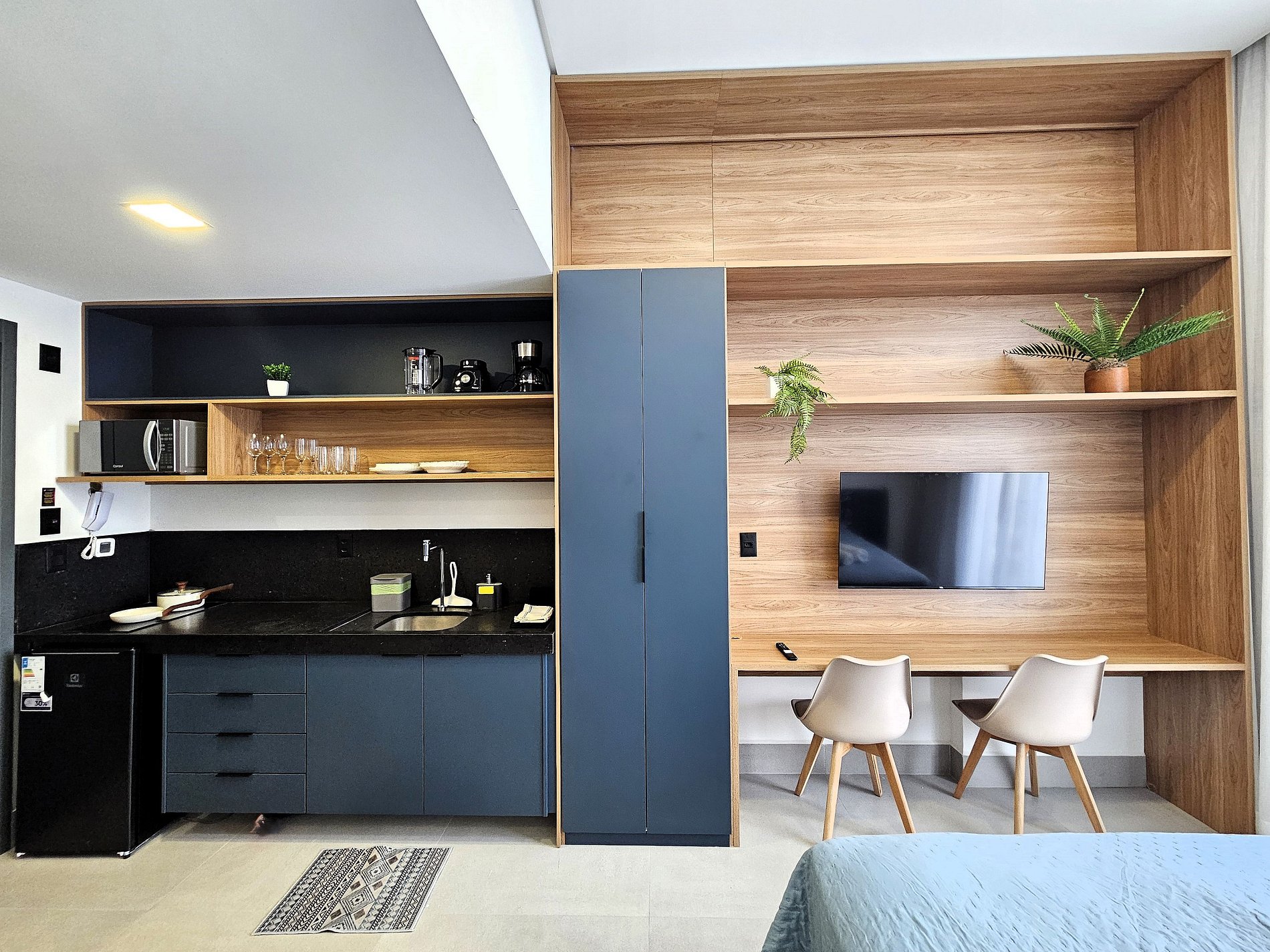 A cozinha é equipada com frigobar, microondas, cafeteira, liquidificador, cooktop de indução e utensílios essenciais para preparar refeições rápidas com toda a comodidade.