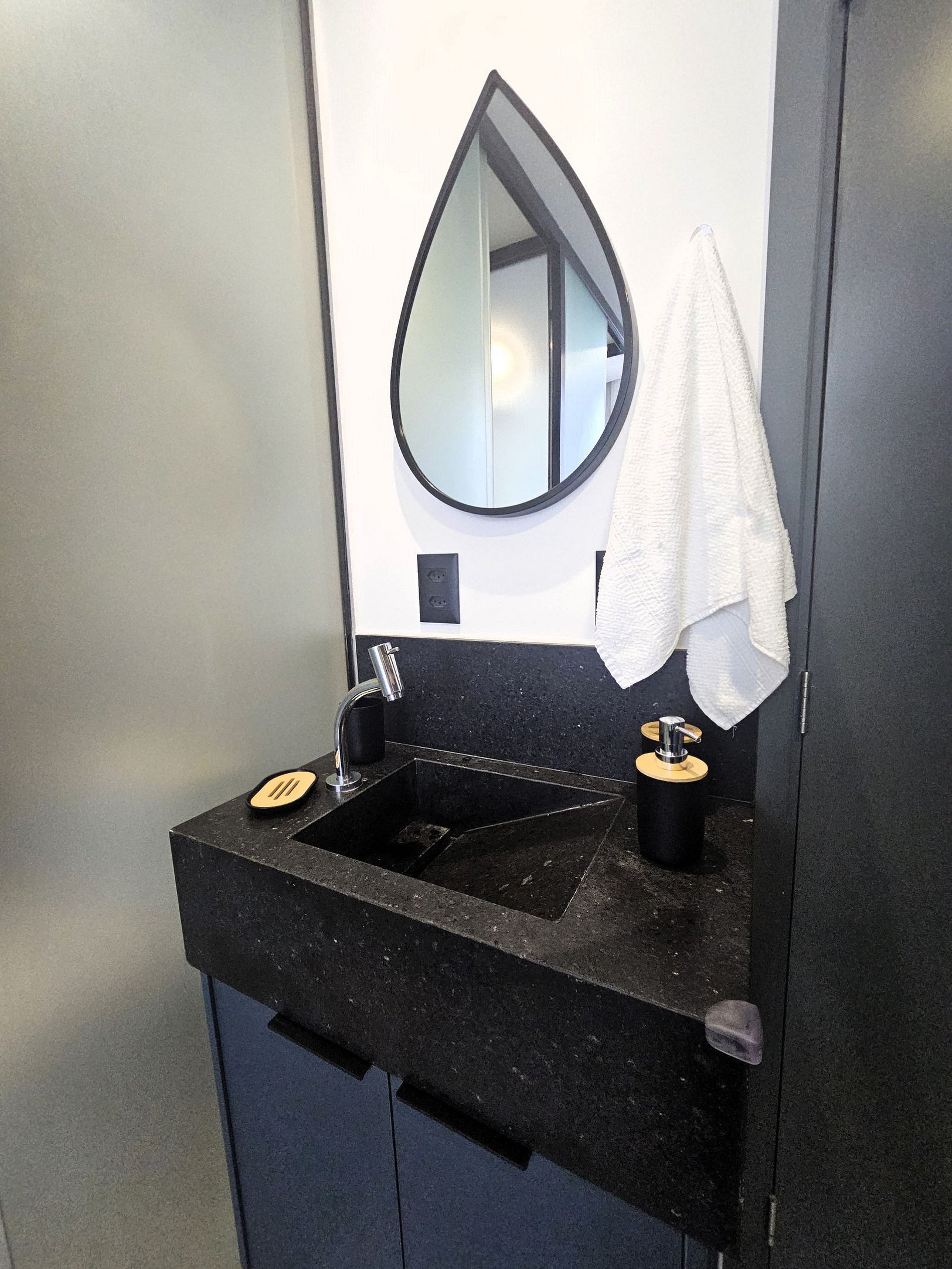 A cozinha é equipada com frigobar, microondas, cafeteira, liquidificador, cooktop de indução e utensílios essenciais para preparar refeições rápidas com toda a comodidade.